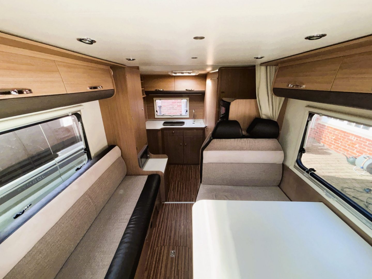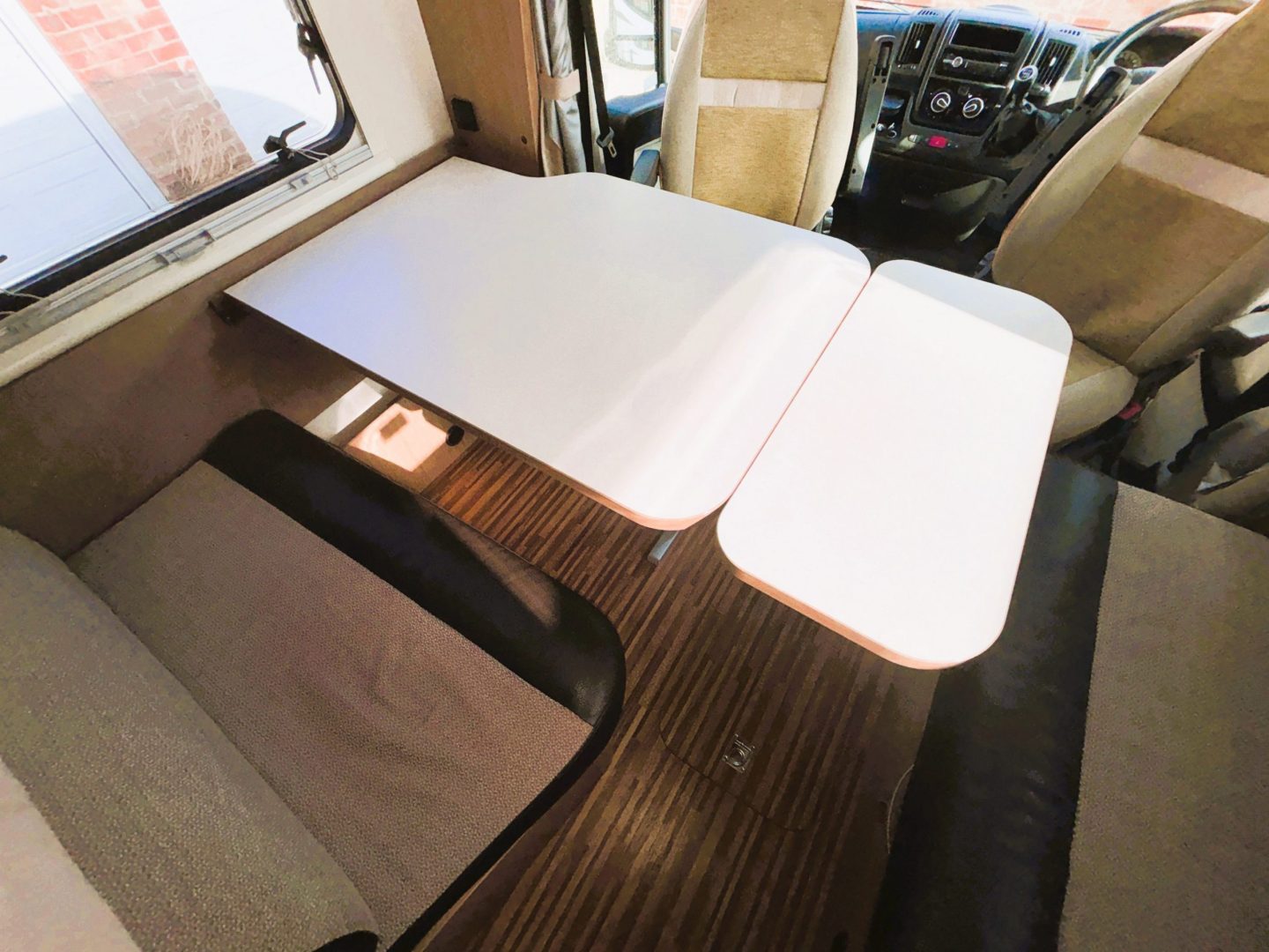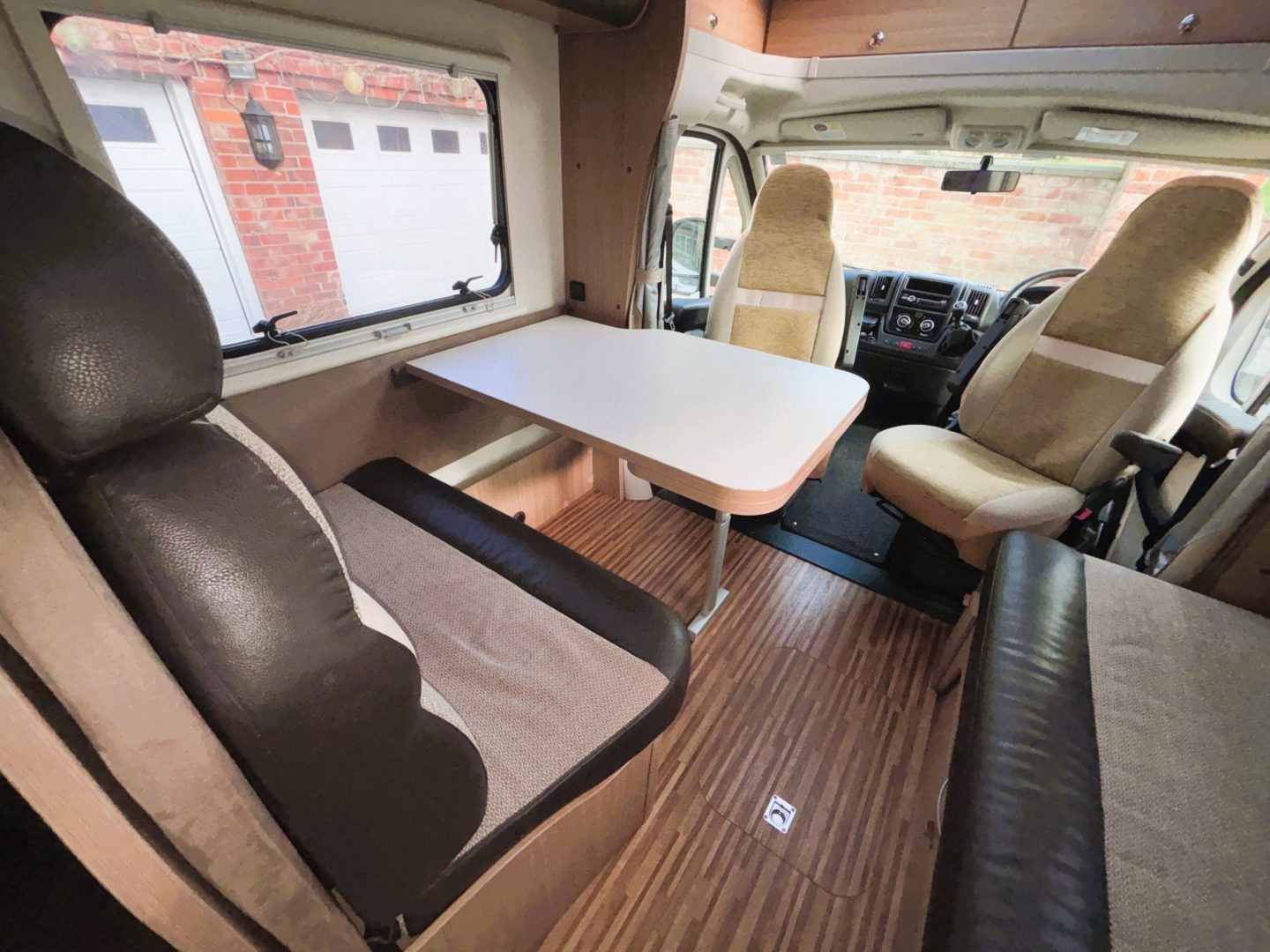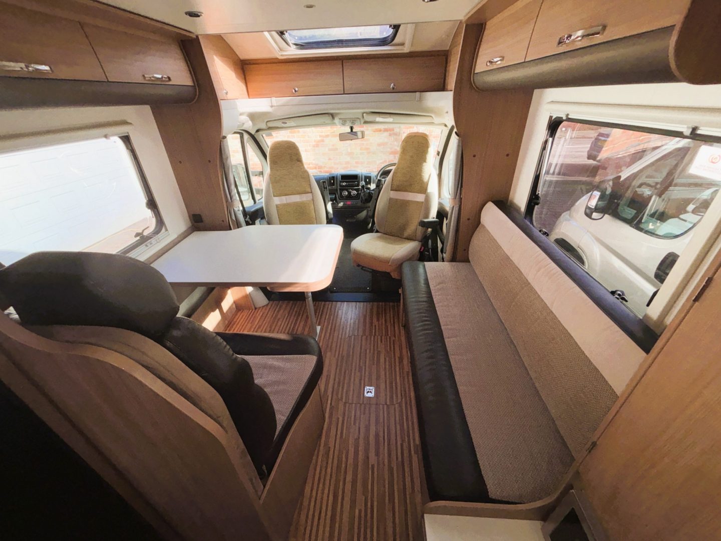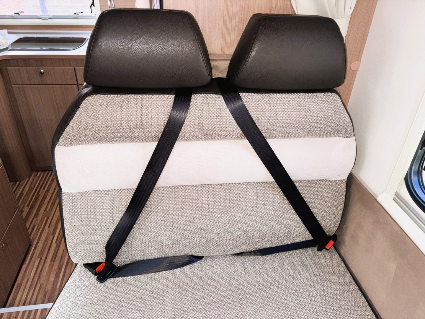 Up front you have the dinette/lounge with forward facing bench/sofa with extendable dining table, long sofa opposite and two captains swivel seats. The two forward facing dinette seats are fitted with 3 point seat belts. The dinette table can be used as an extra bed base. It becomes an occasional double bed.
