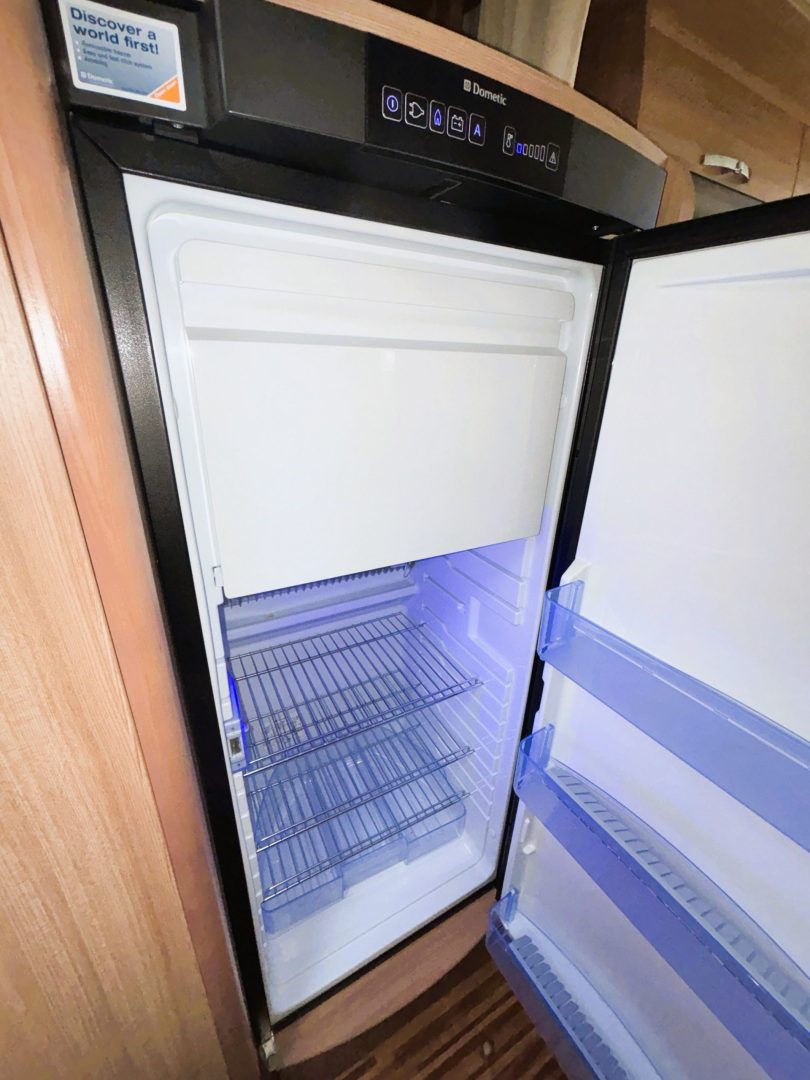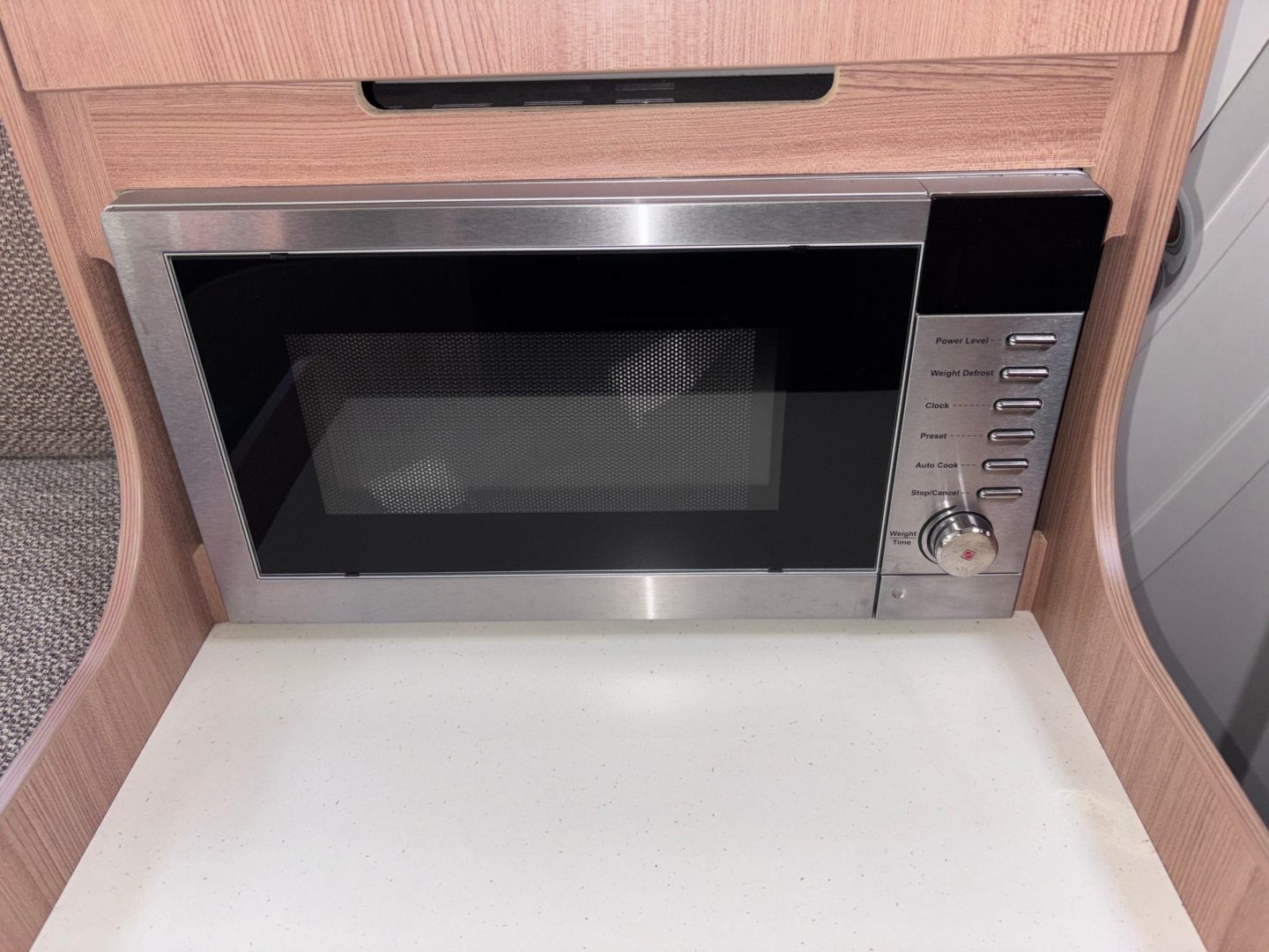 As you enter through the habitation door you have a rear kitchen with 3 burner gas hob, sink with mixer tap, ample worktop, a very large 3 way ( gas/240v/12v ) fridge with freezer compartment, a microwave and plenty of storage cupboards and drawers. It is a very spacious kitchen area which is surprising in a sub 6 metre motorhome.