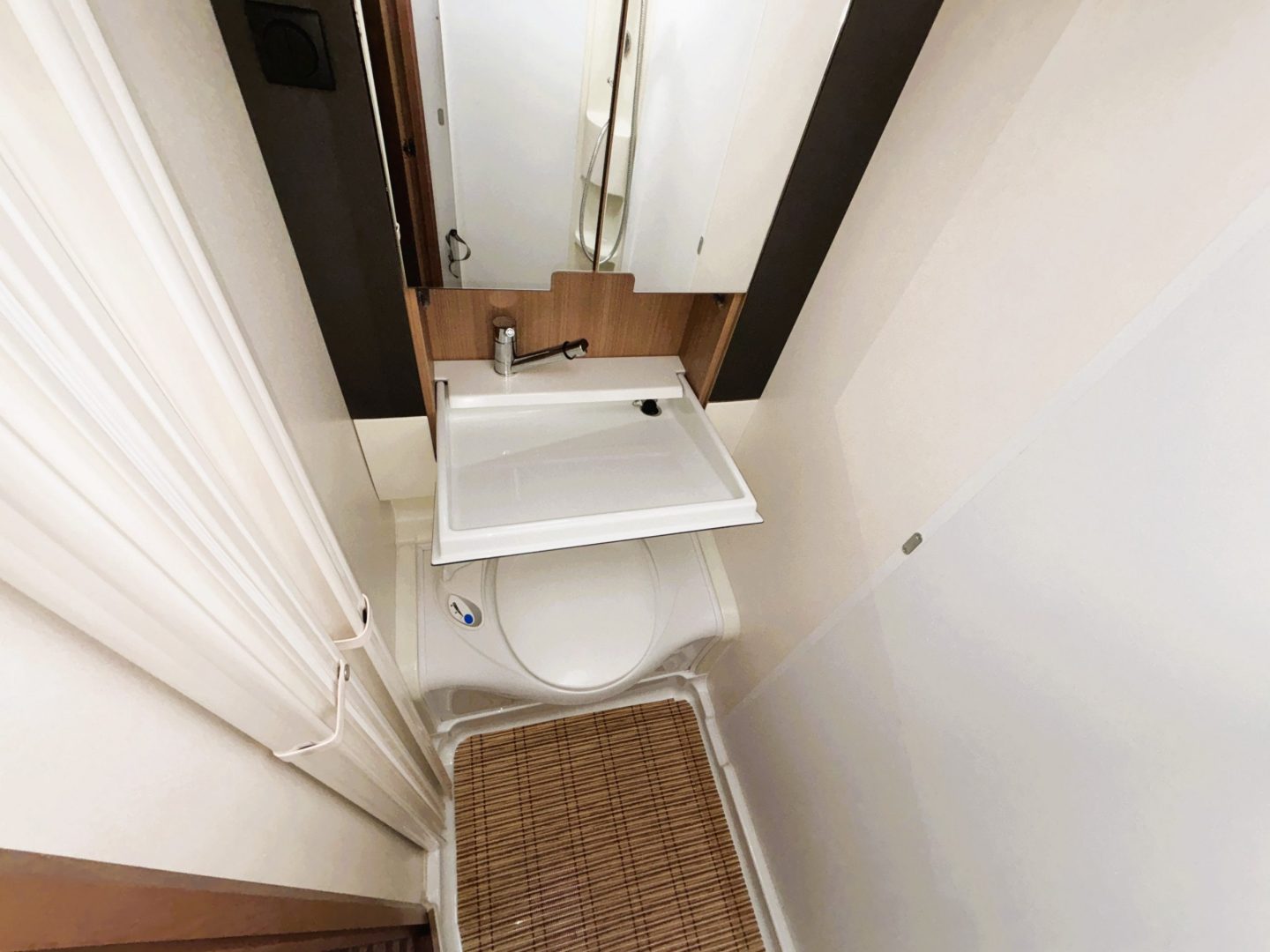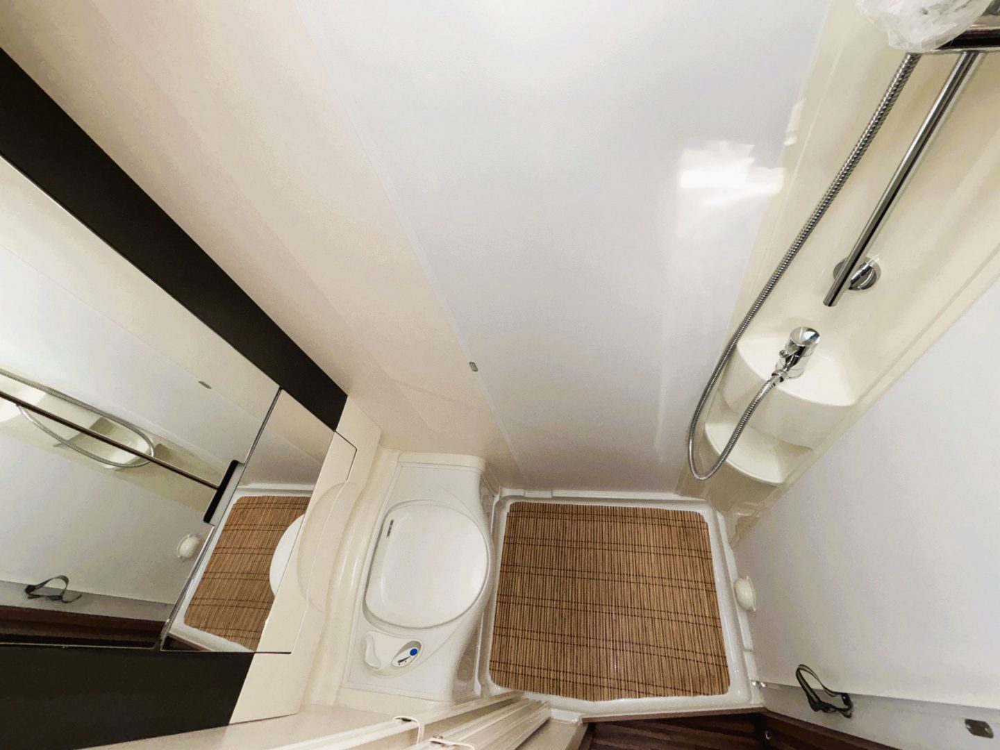 Opposite the kitchen is the shower room with thetford toilet, fold down wash basin and using the two shower screens there is a full size shower cubicle. Again the space in the shower room together with the light from the overhead rooflight means this is far more than just a small washroom.
