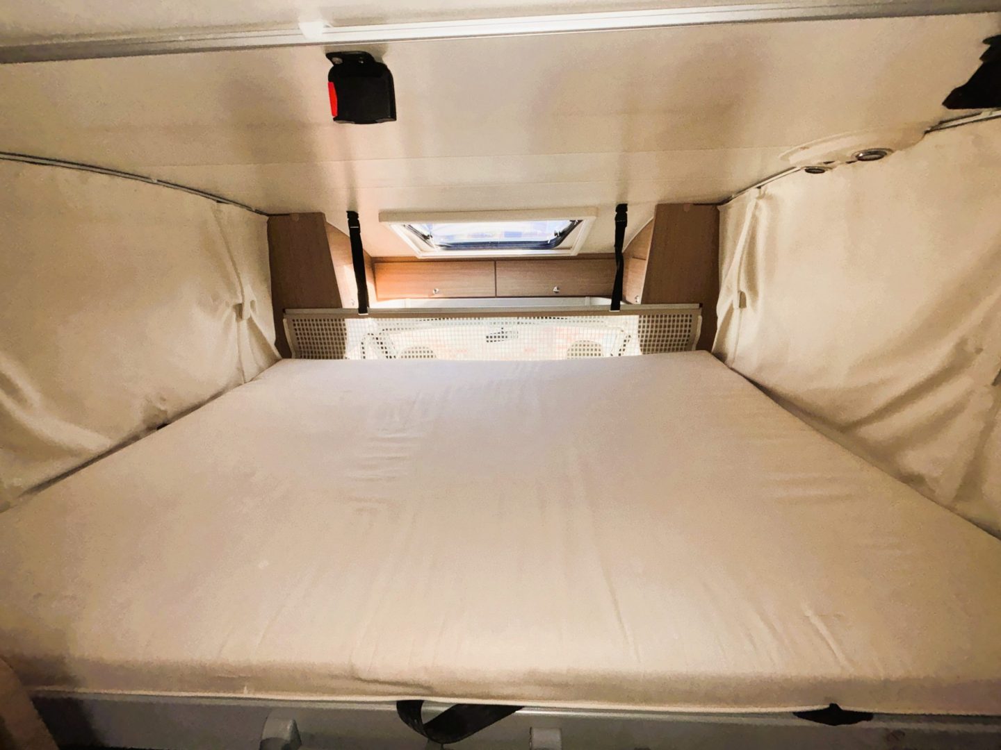 Over the front lounge is the feature that really makes this motorhome stand out and which allows the great use of space throughout, the drop down bed. It is manually operated so no electric motors to go wrong. It sits over the lounge when down and has an access ladder. This bed measures 135cm wide x 190cm long.