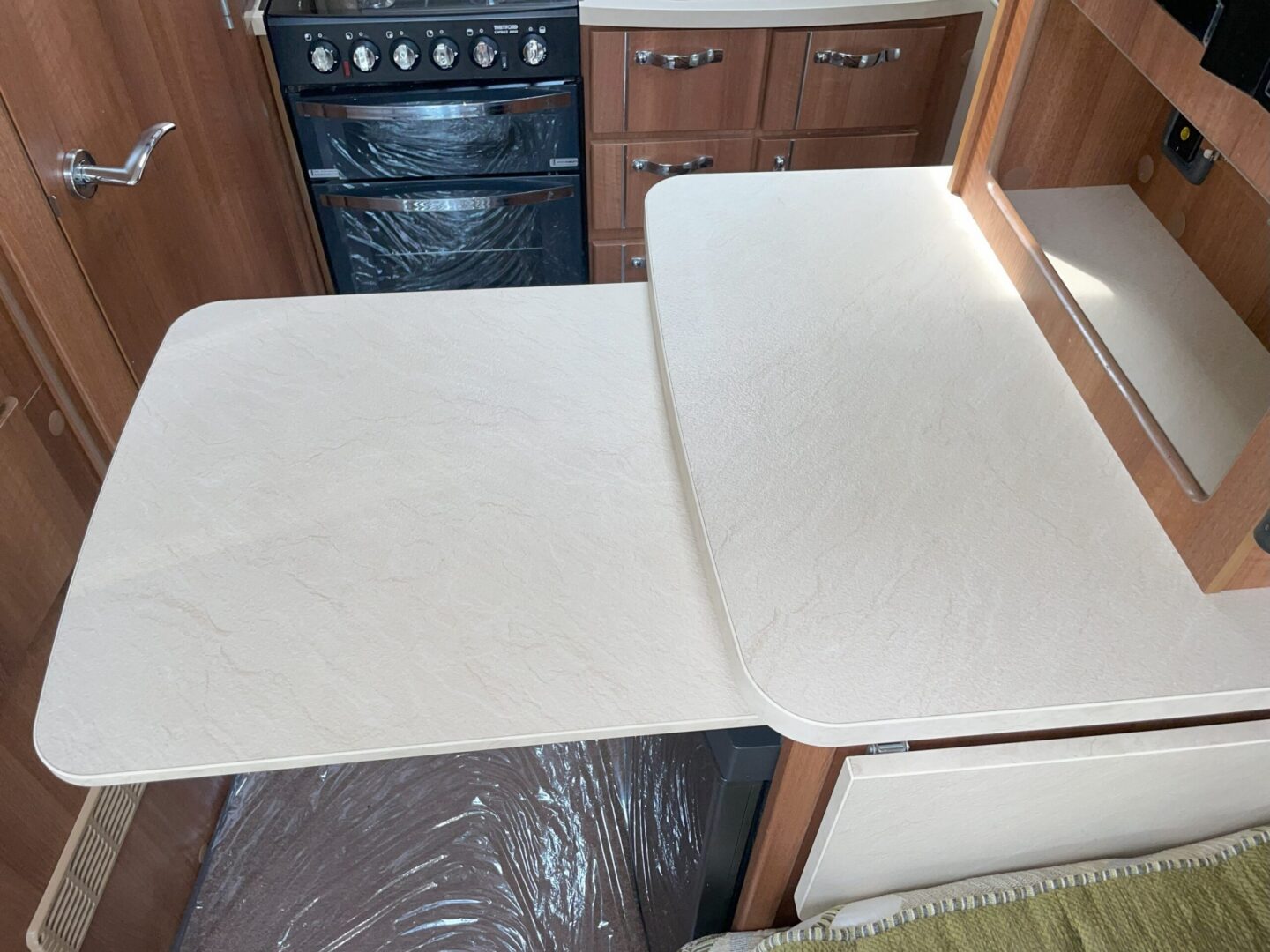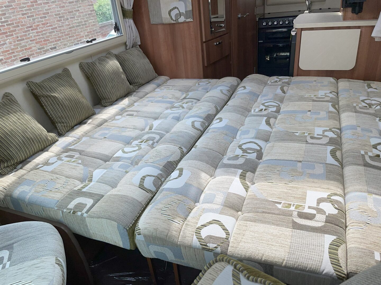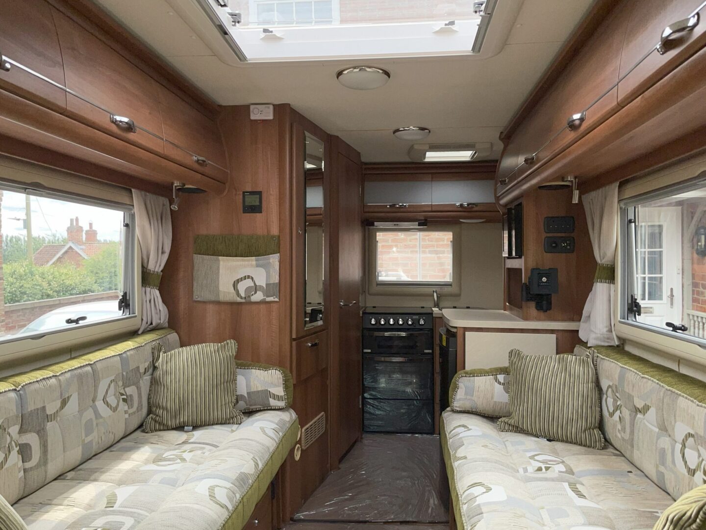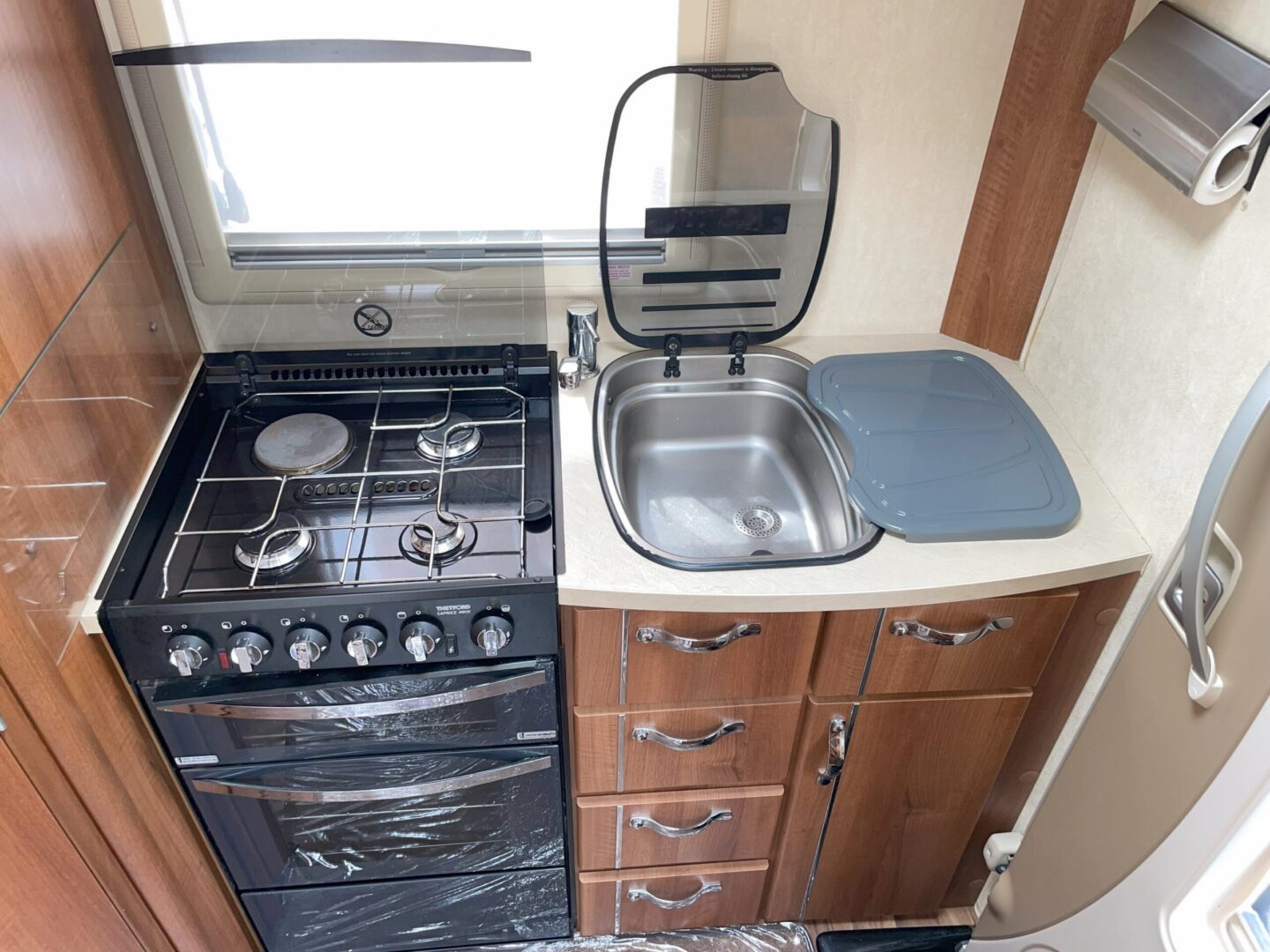 Starting at the rear you enter into the kitchen with a stainless steel sink with mixer tap, a full cooker with 3 burner gas hob and one electric, gas oven and separate grill, a 3 way ( gas/240v/12v ) fridge with freezer compartment and plenty of drawers and storage cupboards.