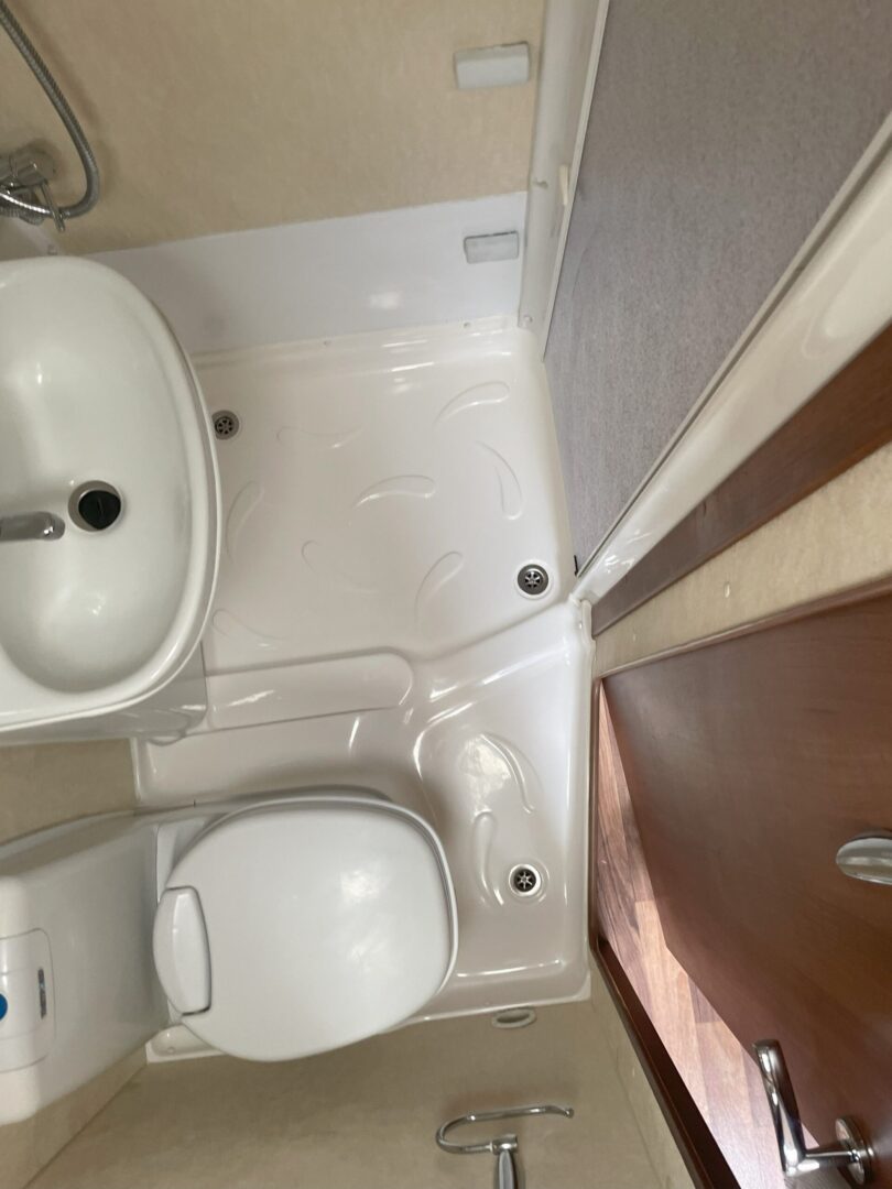 In the rear corner we have a shower room with Thetford toilet, wash basin with Auto-Sleepers ingenious swing wall creating a separate shower cubicle. There is a bathroom cabinet and wall mounted mirror.