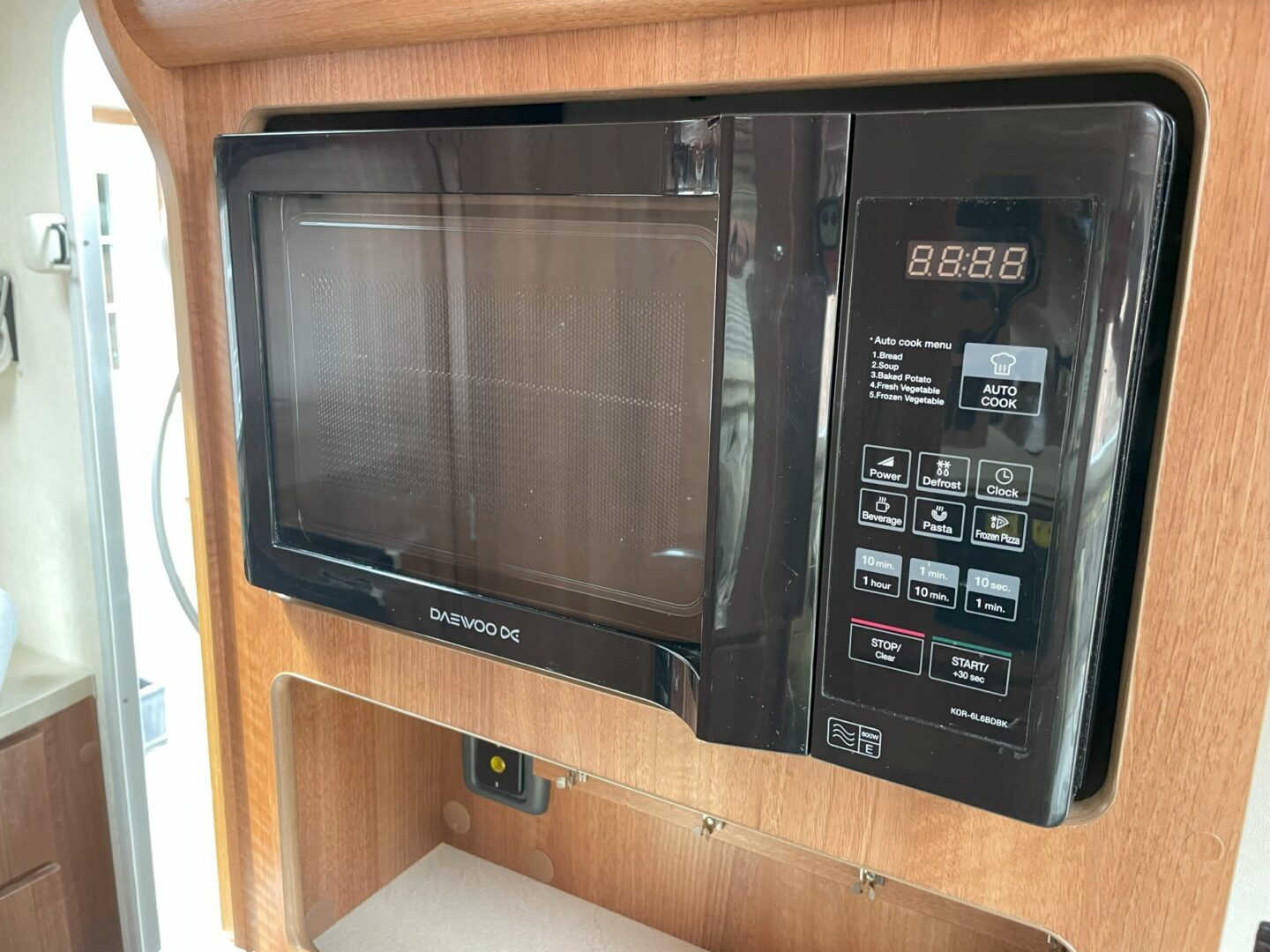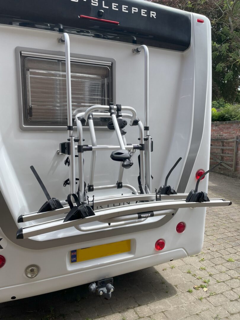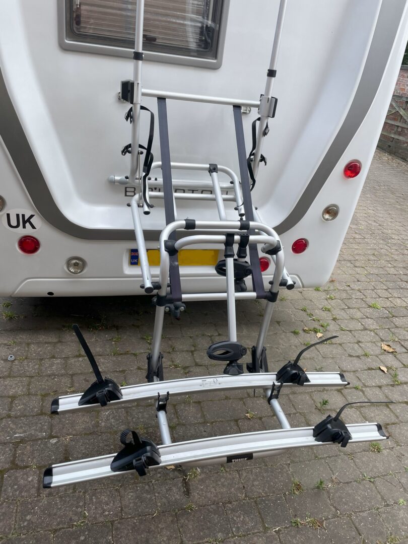 Smart grey and white bodywork with graphics. Fitted with Thule Omnistor awning, solar panel charging the brand new leisure battery, GasIt refillable LPG Gas tank, rear view camera, gas BBQ point, outside 240v electric socket, Tow bar with electrics, TV aerial, virtually new Fiamma wind down bike rack, storage locker and 240v hookup point.