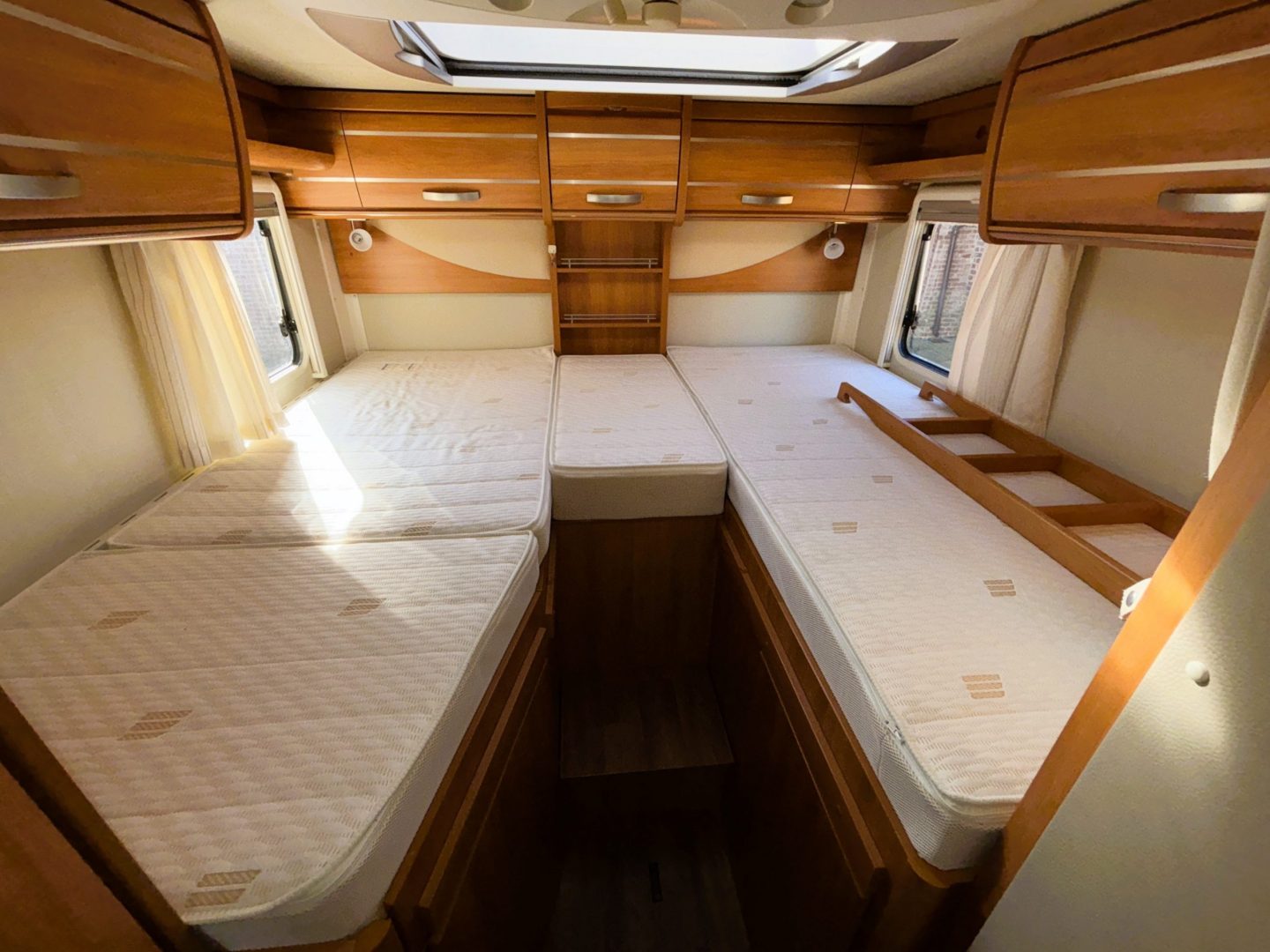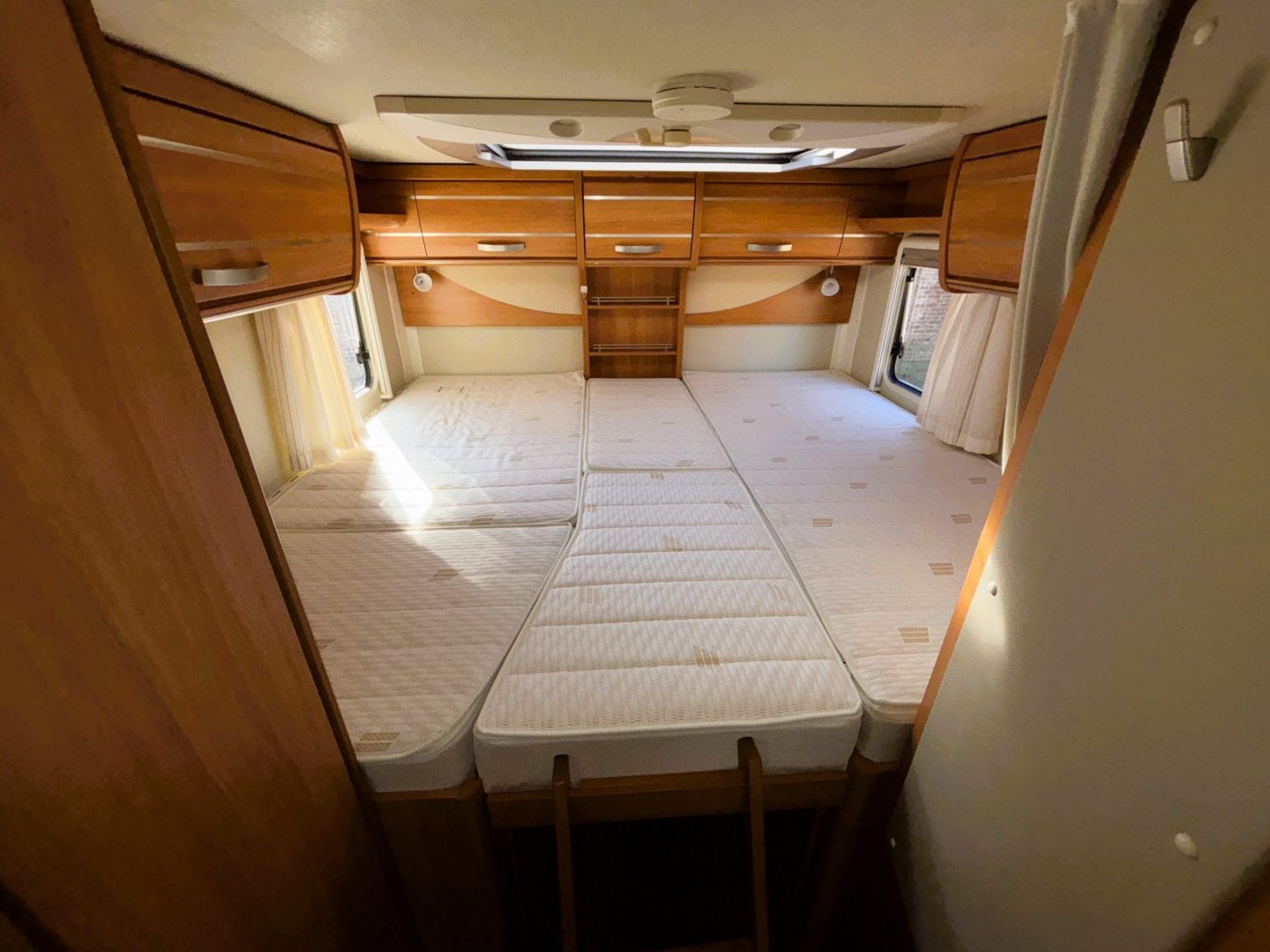 At the rear there are twin single beds ( 2x Length 196cm x Width 80cm ). With the infill cushion this can also be a super king size bed ( Length 196cm x Width 200cm ). There are windows either side, a large skylight, storage cupboards above with a good sized wardrobes below.