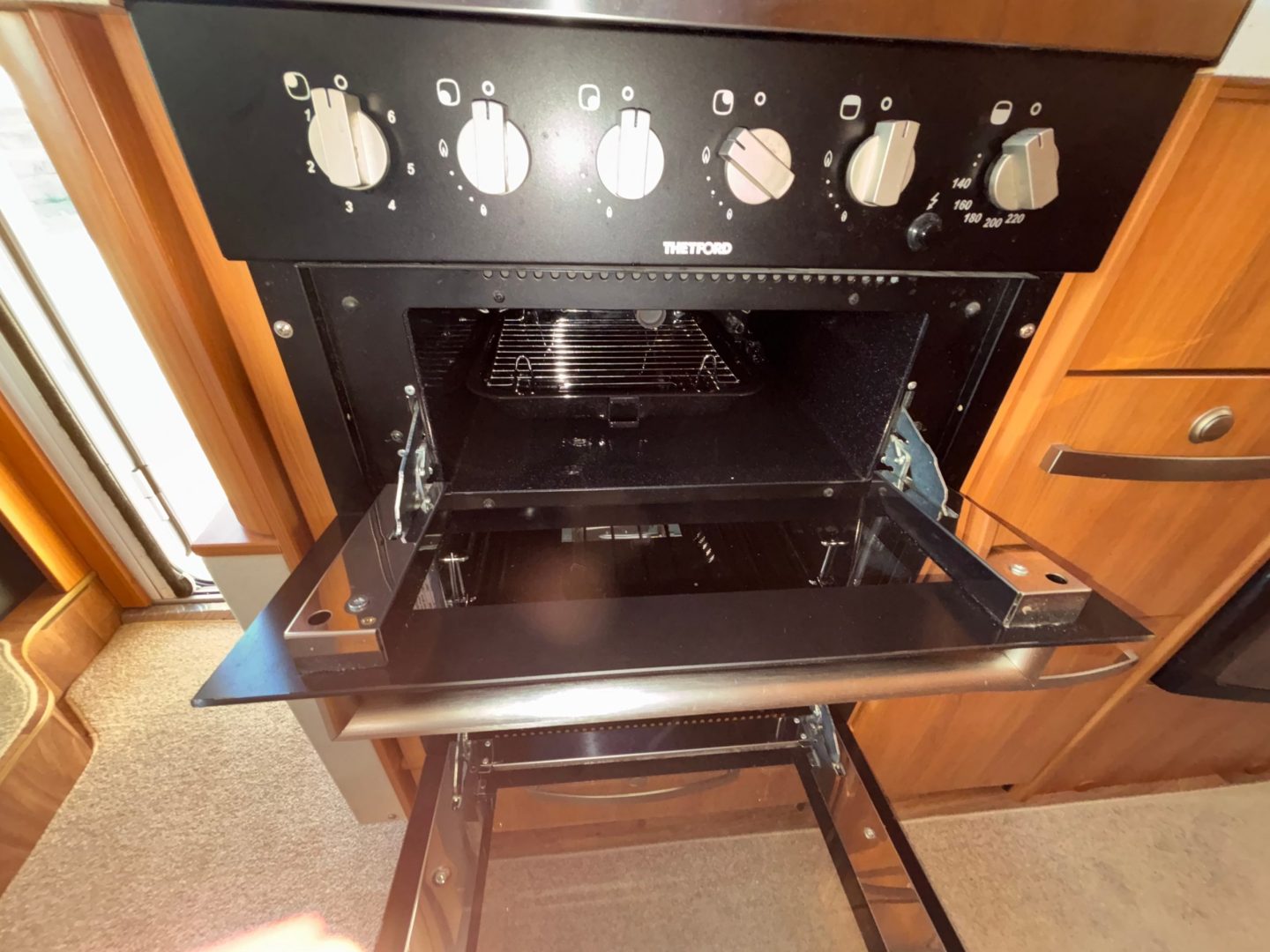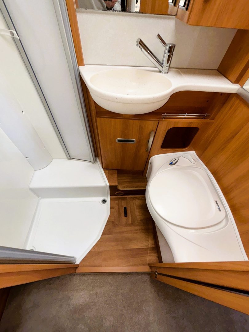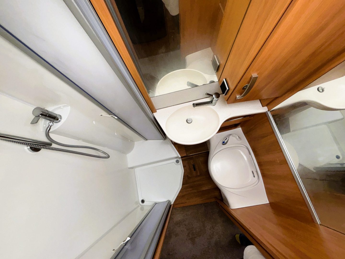 Opposite the kitchen is the shower room with Thetford toilet, wash basin and seperate shower cubicle. Plenty of mirrors, a storage cabinet and rooflight.
