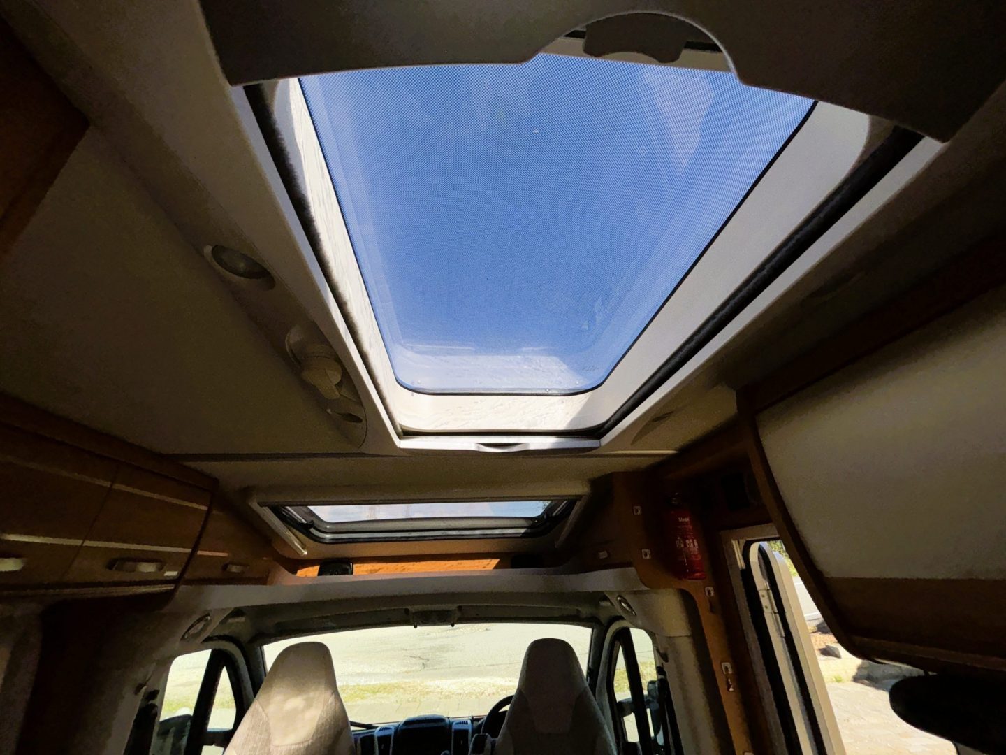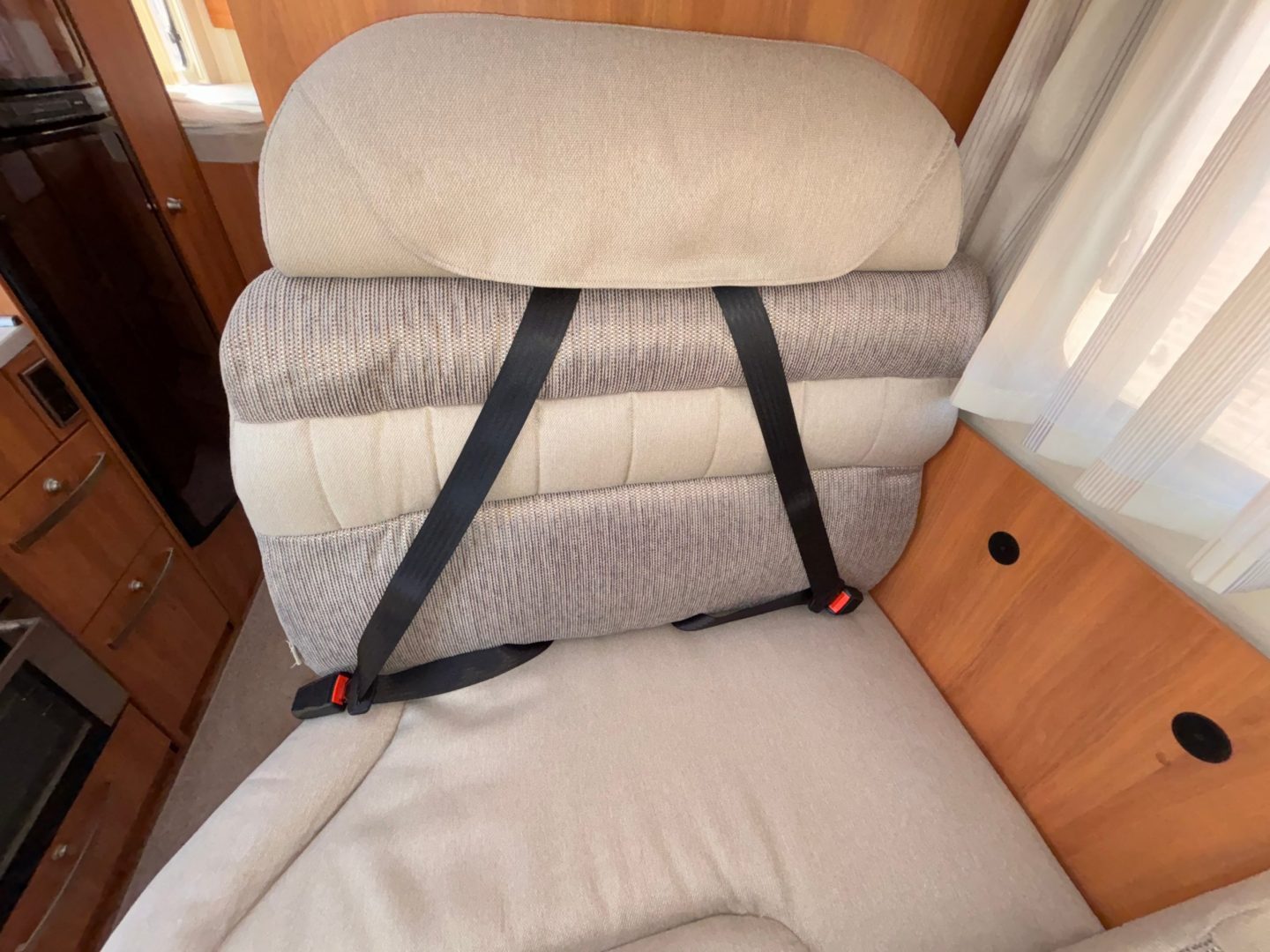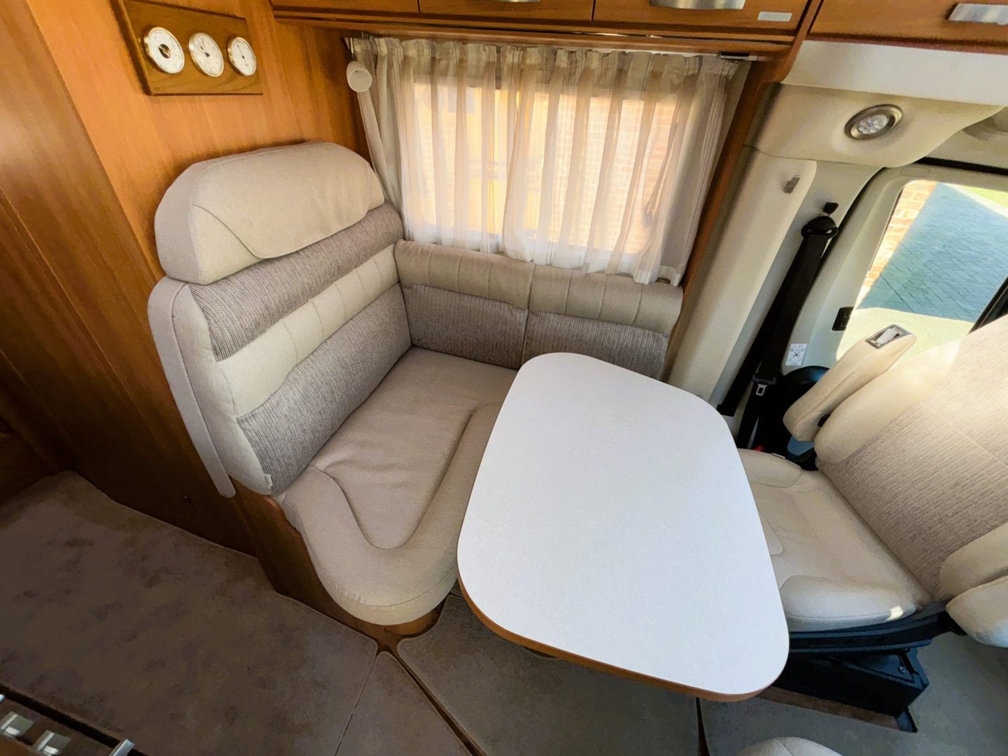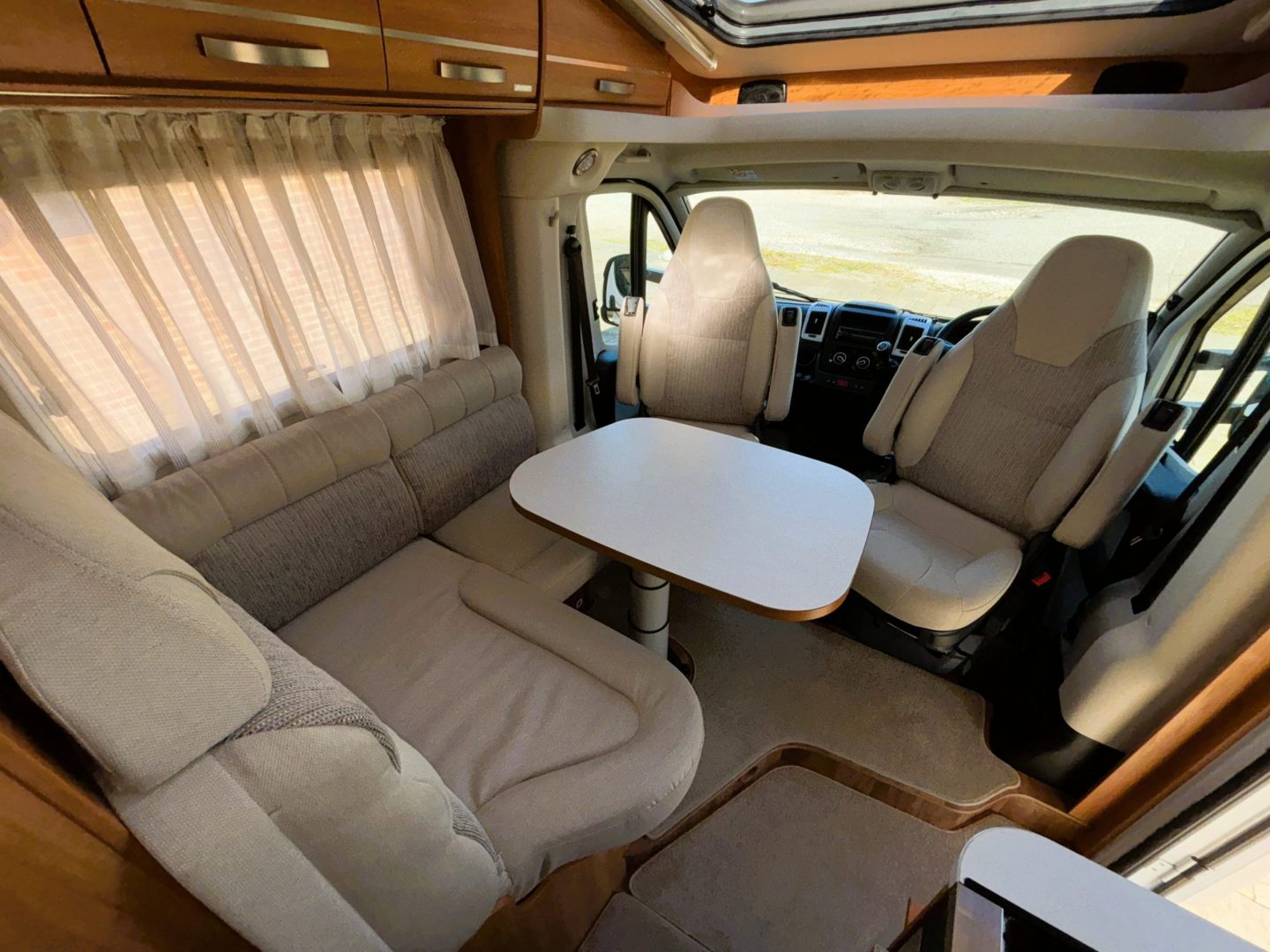 As you enter the motorhome you are straight into the lounge with an L shaped , neutral fabric, sofa ( fitted with two, forward facing, seatbelts). There is a table for dining and with the two front captains seats swivelled you can easily seat 5 people. This is flooded with light from two large skylights as well as windows all round.The dining table drops down to create a base for a bed giving you an extra small double or good sized single.