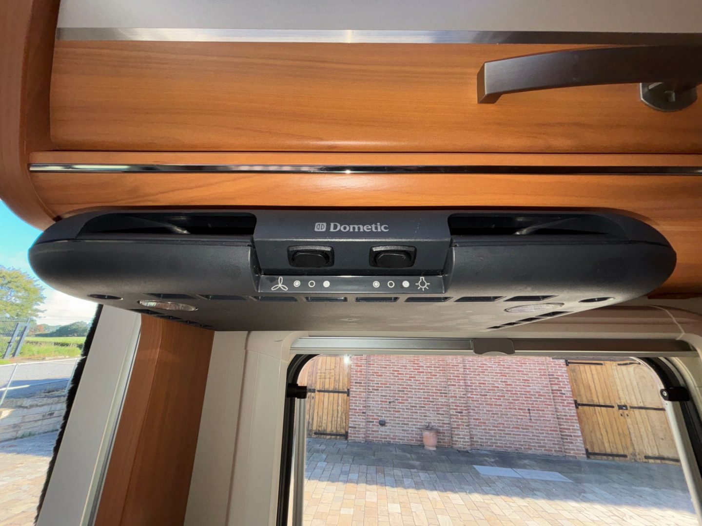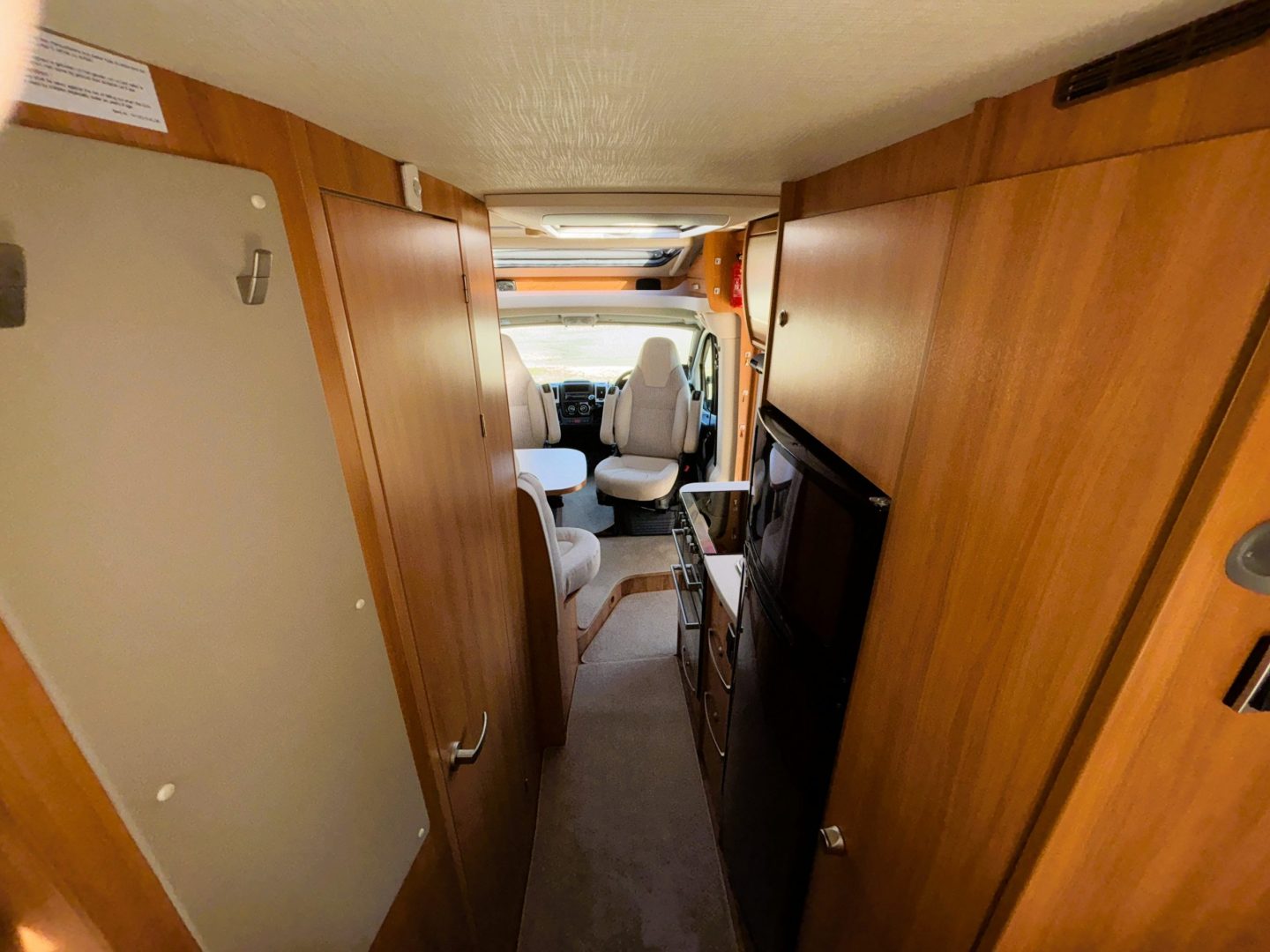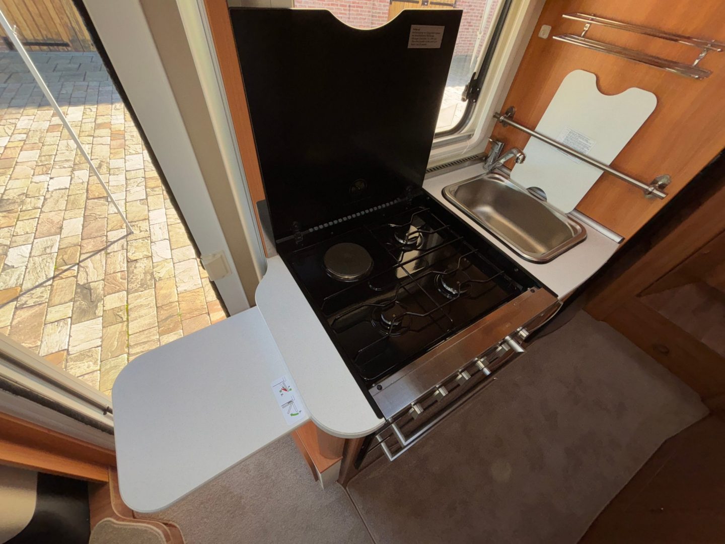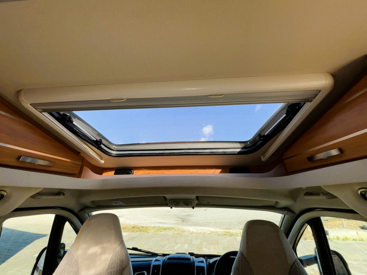 As you enter the motorhome you are straight into the lounge with an L shaped , neutral fabric, sofa ( fitted with two, forward facing, seatbelts). There is a table for dining and with the two front captains seats swivelled you can easily seat 5 people. This is flooded with light from two large skylights as well as windows all round.The dining table drops down to create a base for a bed giving you an extra small double or good sized single.
