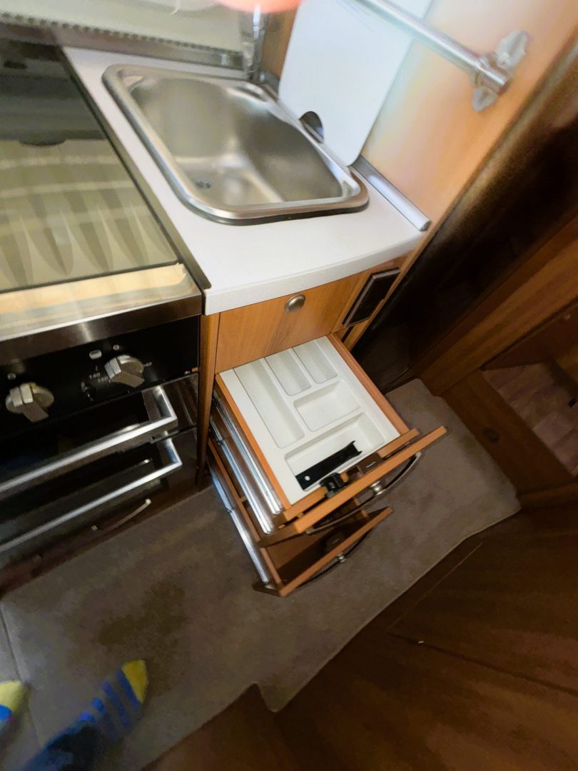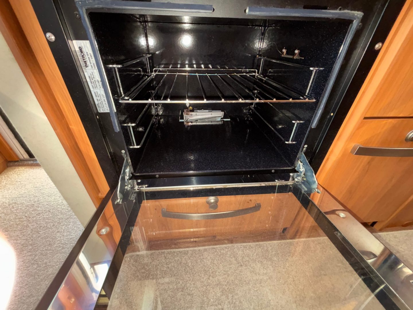 Moving back in the van you enter the kitchen with great extras like the full cooker with 3 burner hob and electric hot plate, separate grill and oven. Next to this is the sink with storage above and below and then a full size fridge with separate freezer.