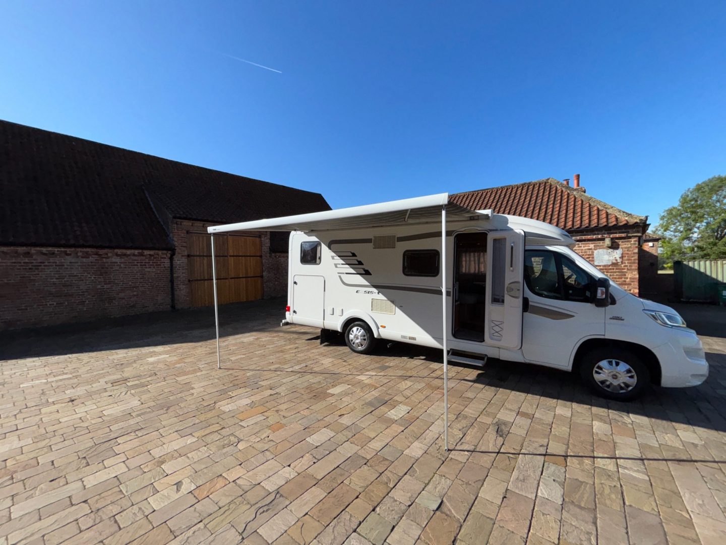 Very good white bodywork with graphics fitted with Thule awning, rear view camera and sensors, front camera, electric step, large rear garage with access doors either side and twin Gaslow system, and 240 hookup.