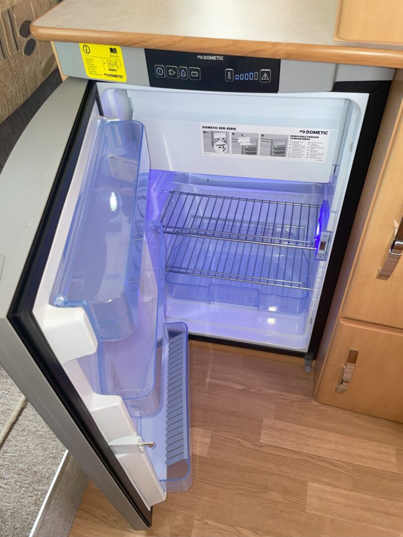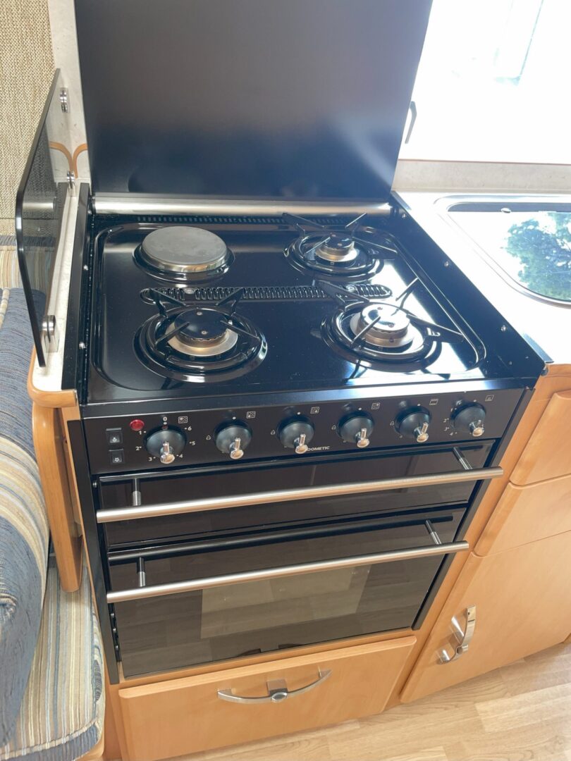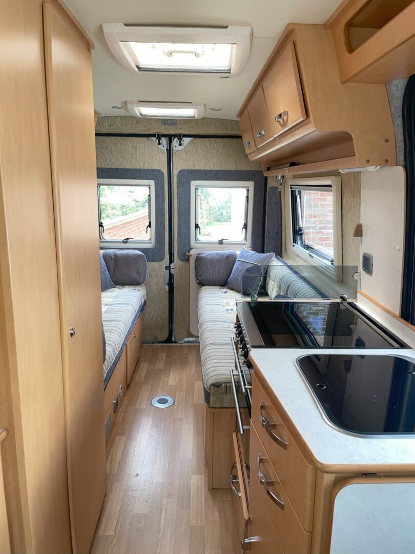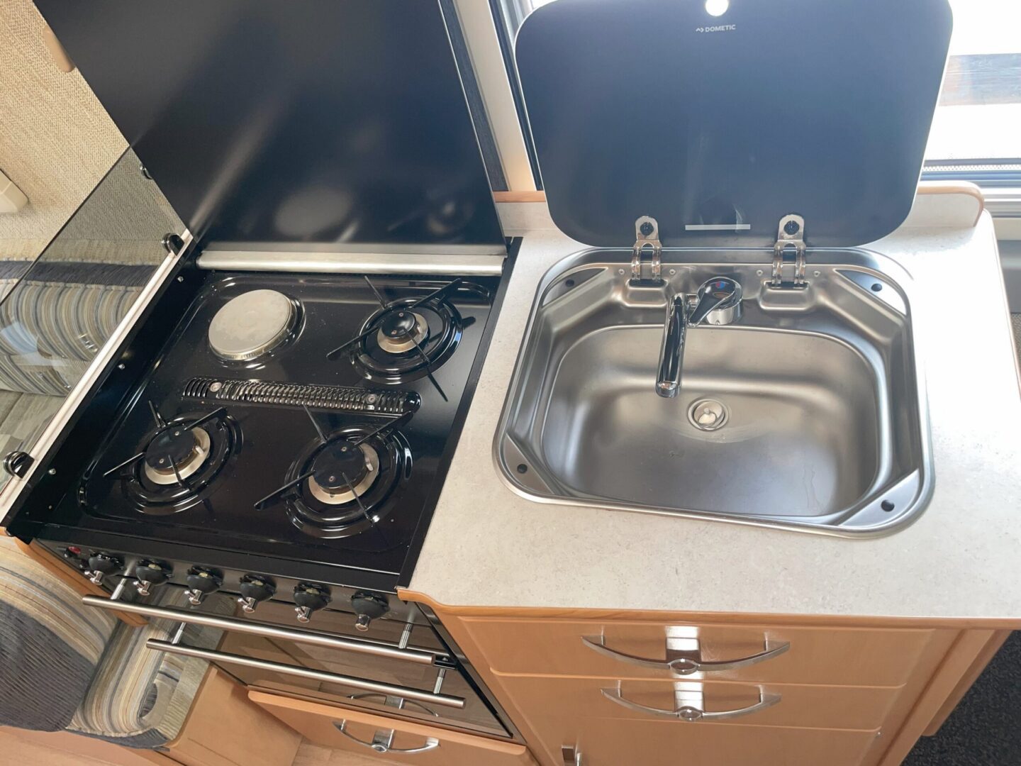 Heading back from here you have the kitchen with a cooker including a 3 burner gas and one electric hob, oven and grill. Next to the hob is a stainless steel sink with mixer tap and an extra fold down worktop. The 3 way ( gas/240v/12v ) fridge with freezer compartment is behind the drivers seat and there are multiple cupboards and drawers for storage.