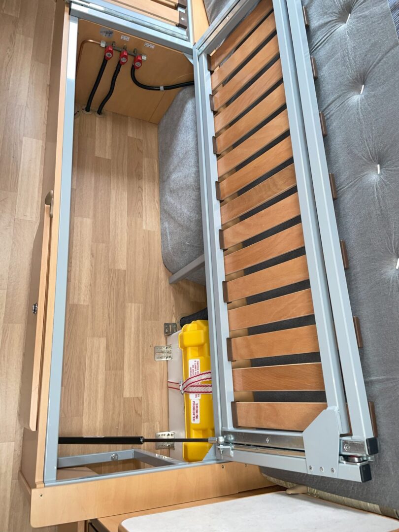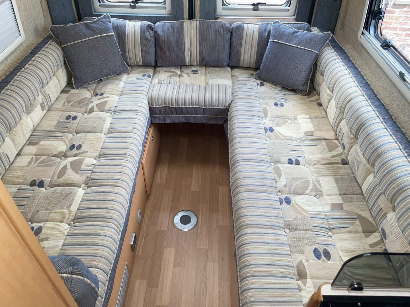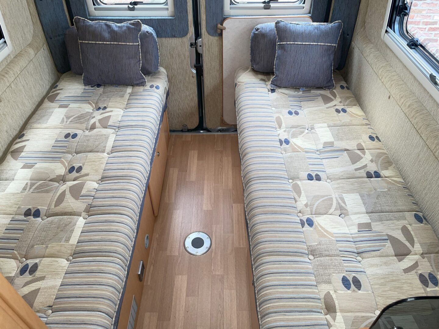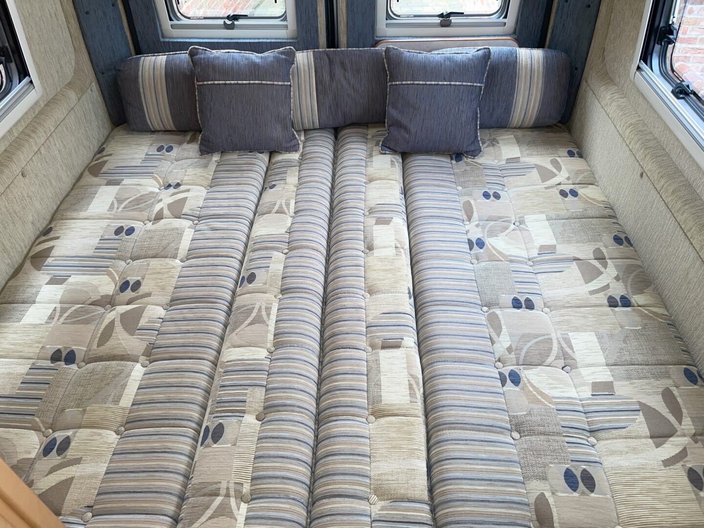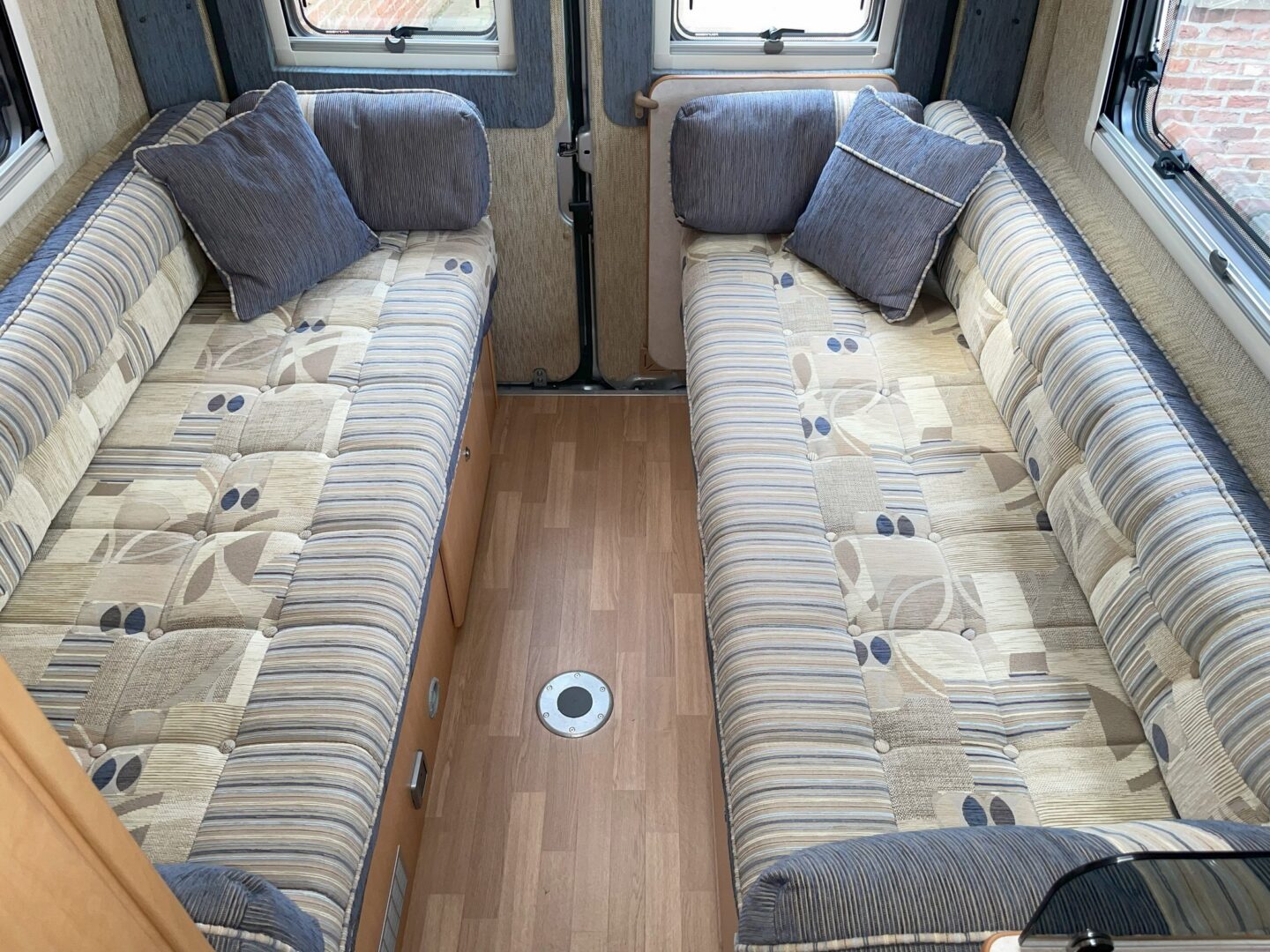 The lounge can be made up as a double bed ( 190cm x 185cm ) or two single beds (190cm x 70cm ) for sleeping There are storage cupboards above and ample storage under the sofas.