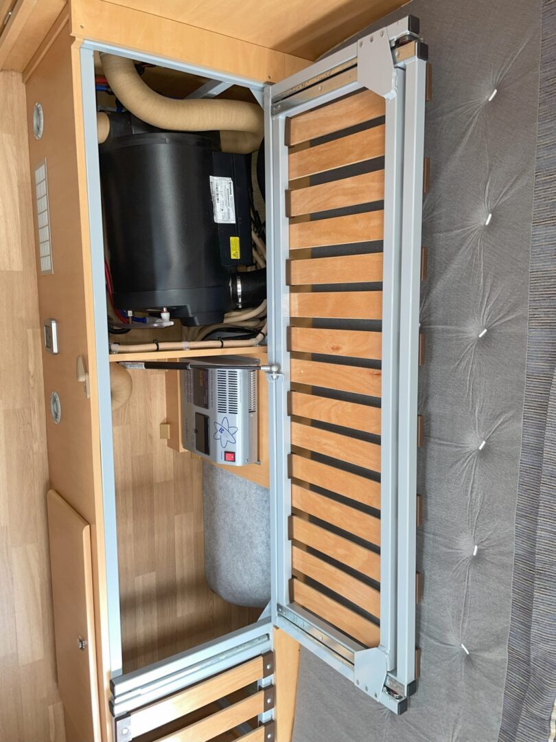 It has a Truma combi heater and water heater which runs on both 240v electric and LPG. All opening windows and rooflights have concertina blackout blinds and fly screens and both internal and external ( new, still in original packaging ) silver screens for the cab windows.