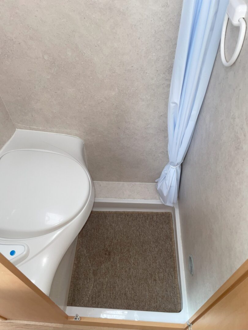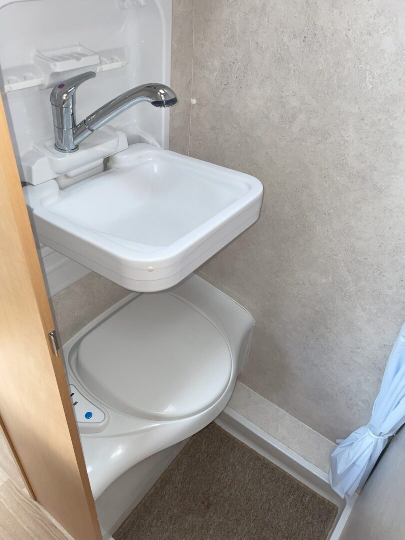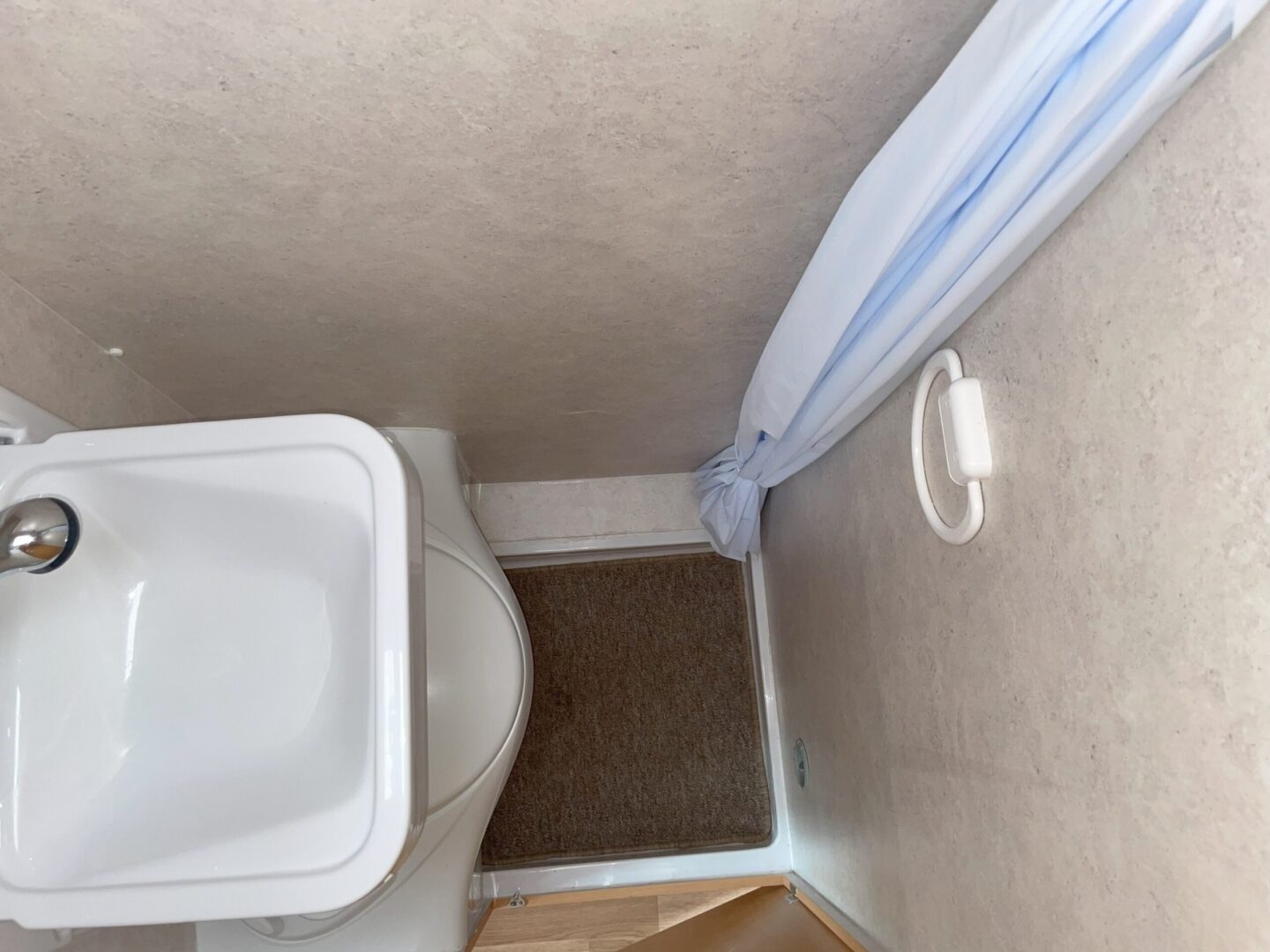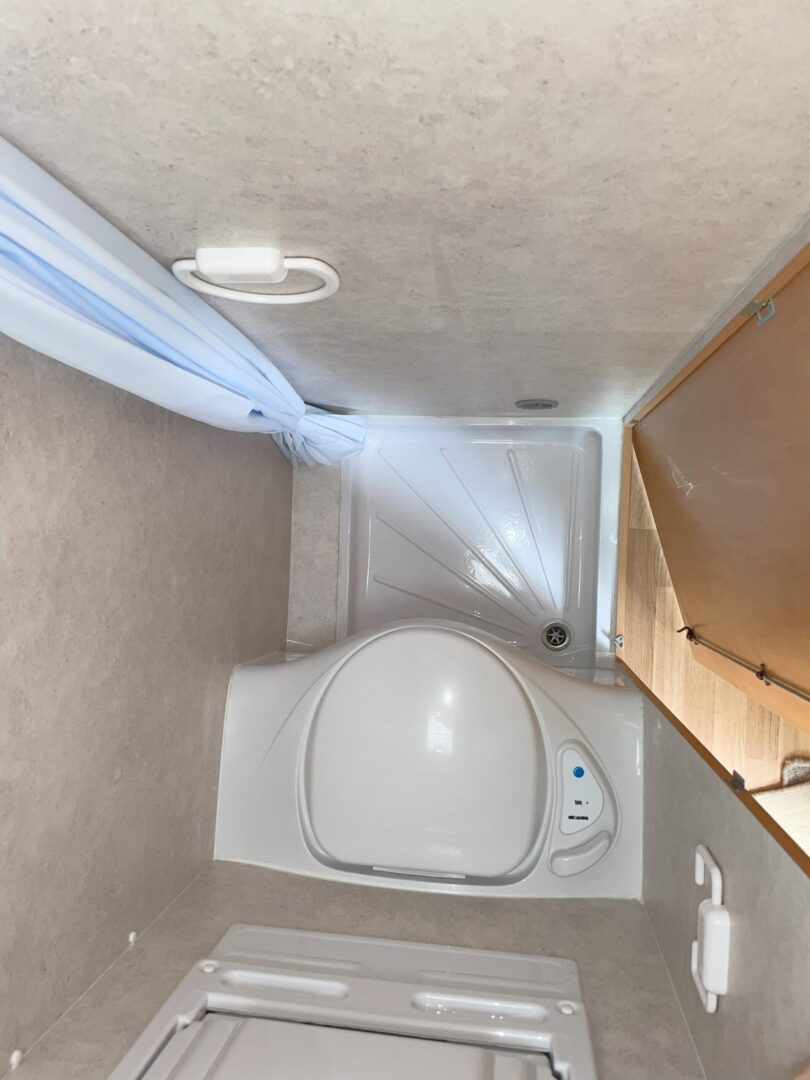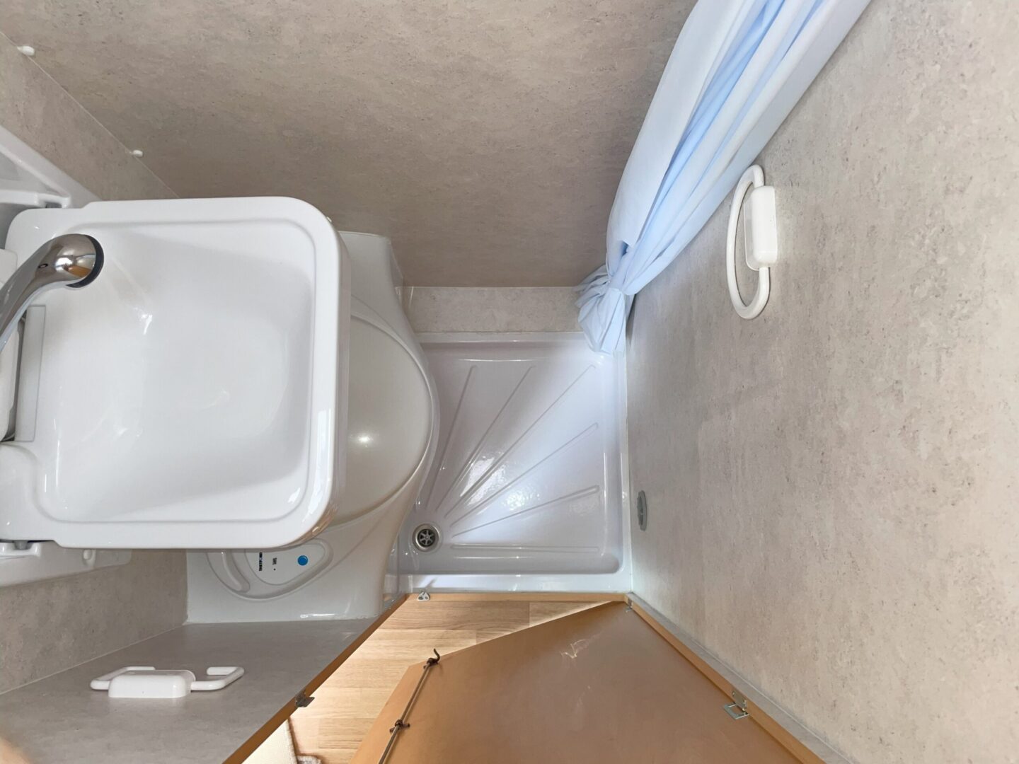 Opposite the kitchen is a good sized wardrobe and next to this is the shower room complete with Thetford toilet, wash basin, shower and a mirrored storage cupboard.