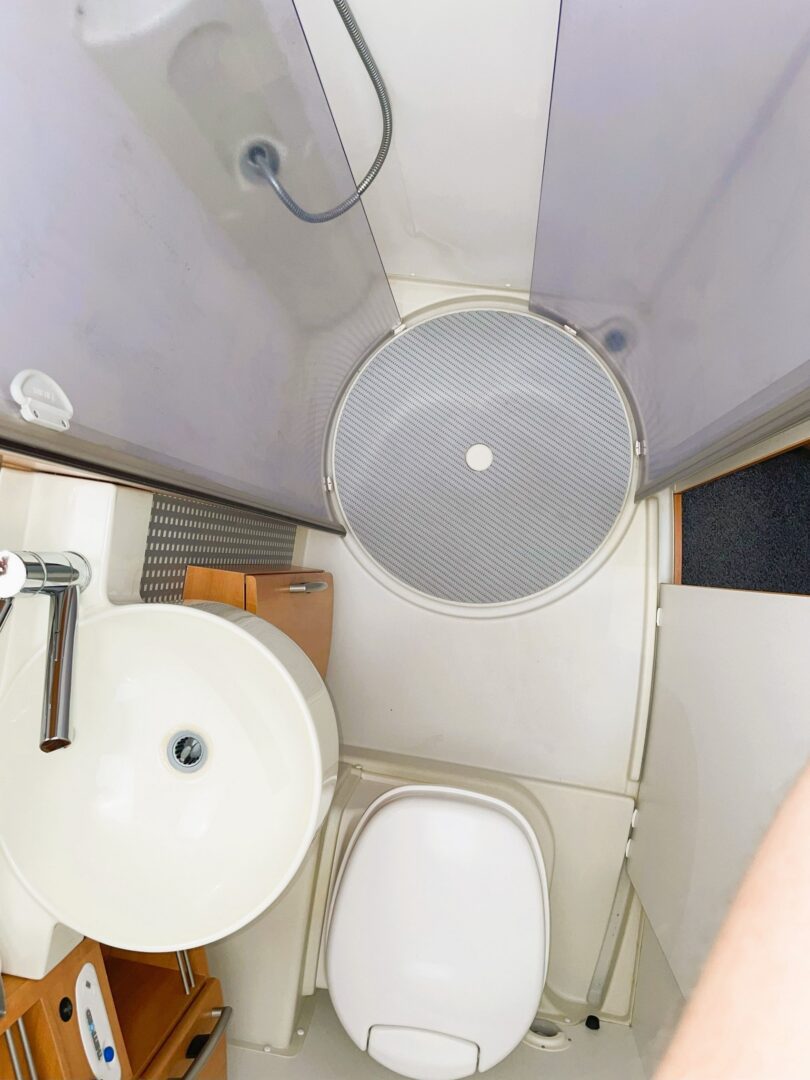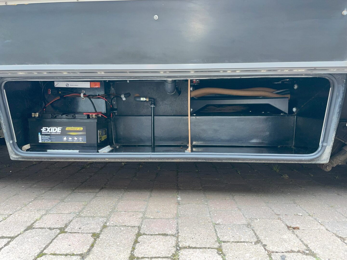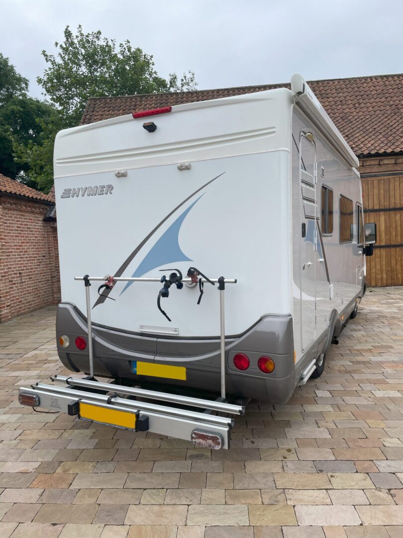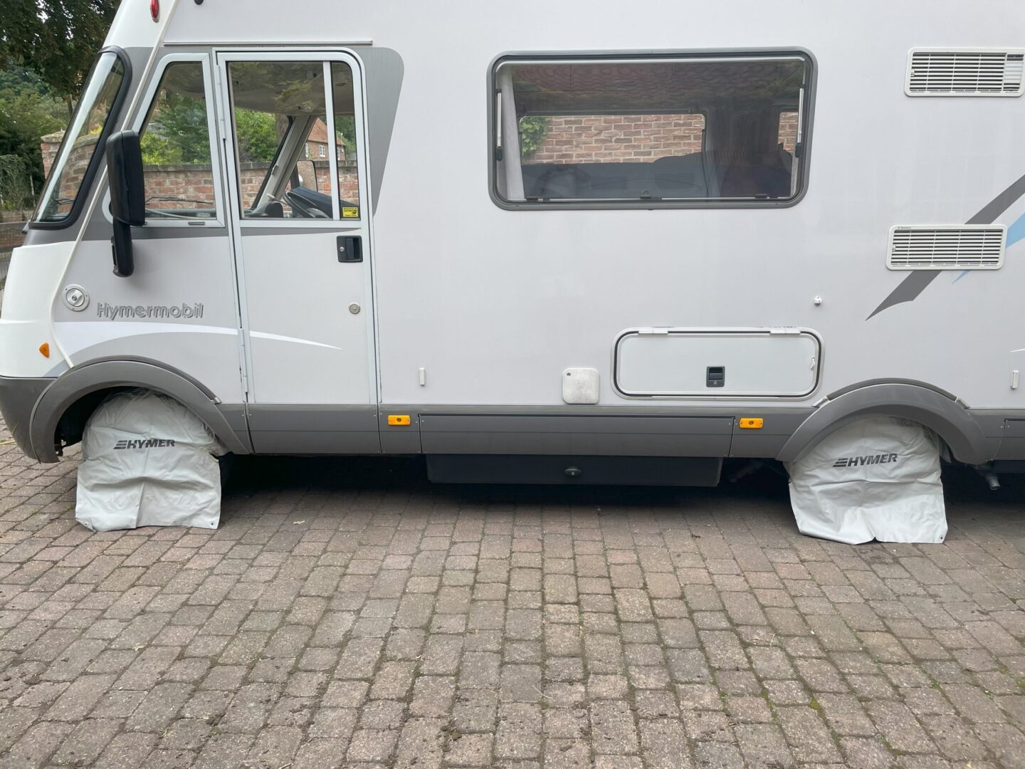 Excellent grey and white bodywork fitted with Omnistor awning, large solar panel, substantial bike rack for 2 bikes, Twin 11kg Gaslow refillable LPG bottles, extra Abus locks on Cab and Hab doors, double electric step, passenger door, several large under floor lockers, gas locker and 240 hookup point. It even has Hymer wheel covers to protect the tyres from the heat.