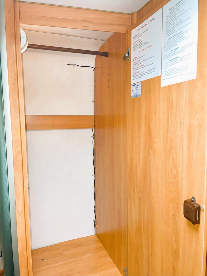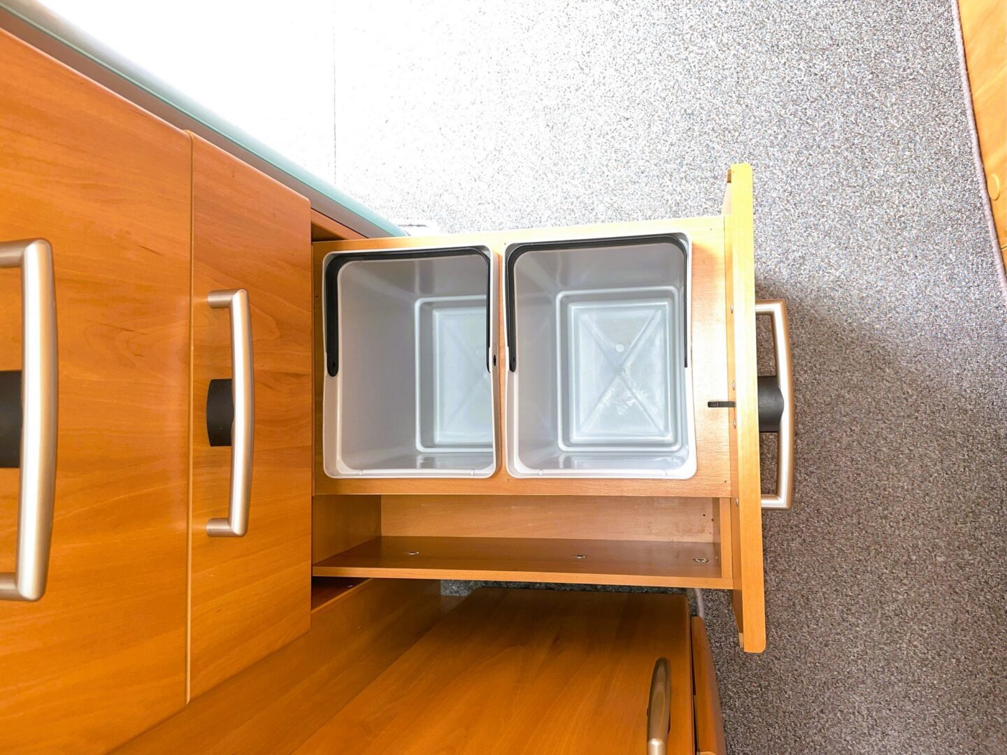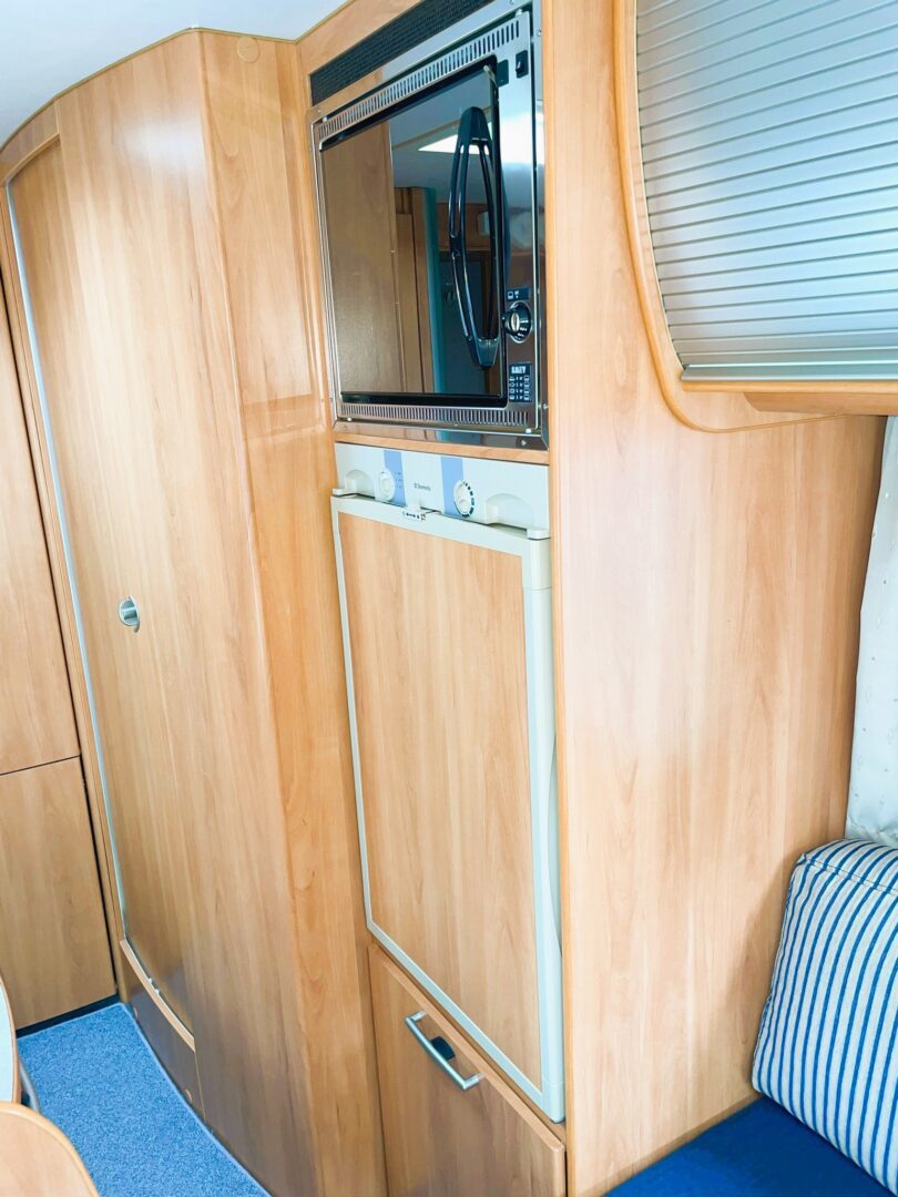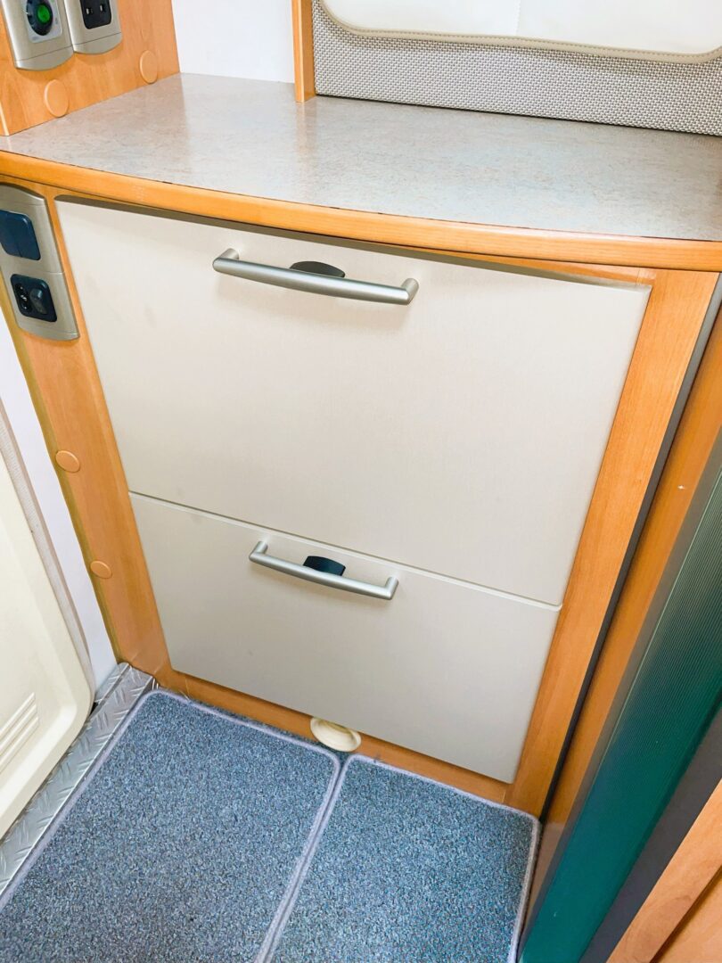 As you enter through the rear habitation door you have on your left a wardrobe and several storage cupboards. On your right is an L shaped kitchen with 3 burner gas hob and a sink with mixer tap. There is also a three way ( gas/240v/12v ) fridge with freezer compartment, gas oven and various storage cupboards and drawers. In the rear corner is a good size Shower room with swivel Thetford cassette toilet, wash basin and shower cubicle with wrap around screens.