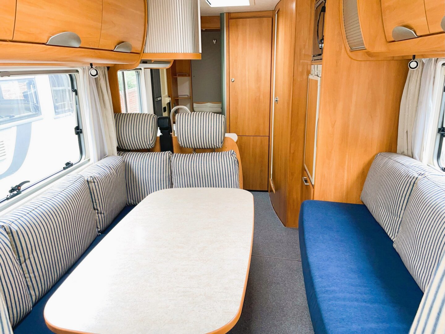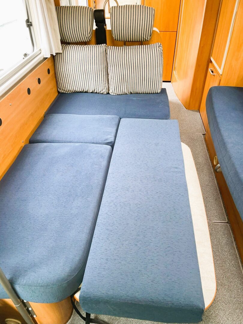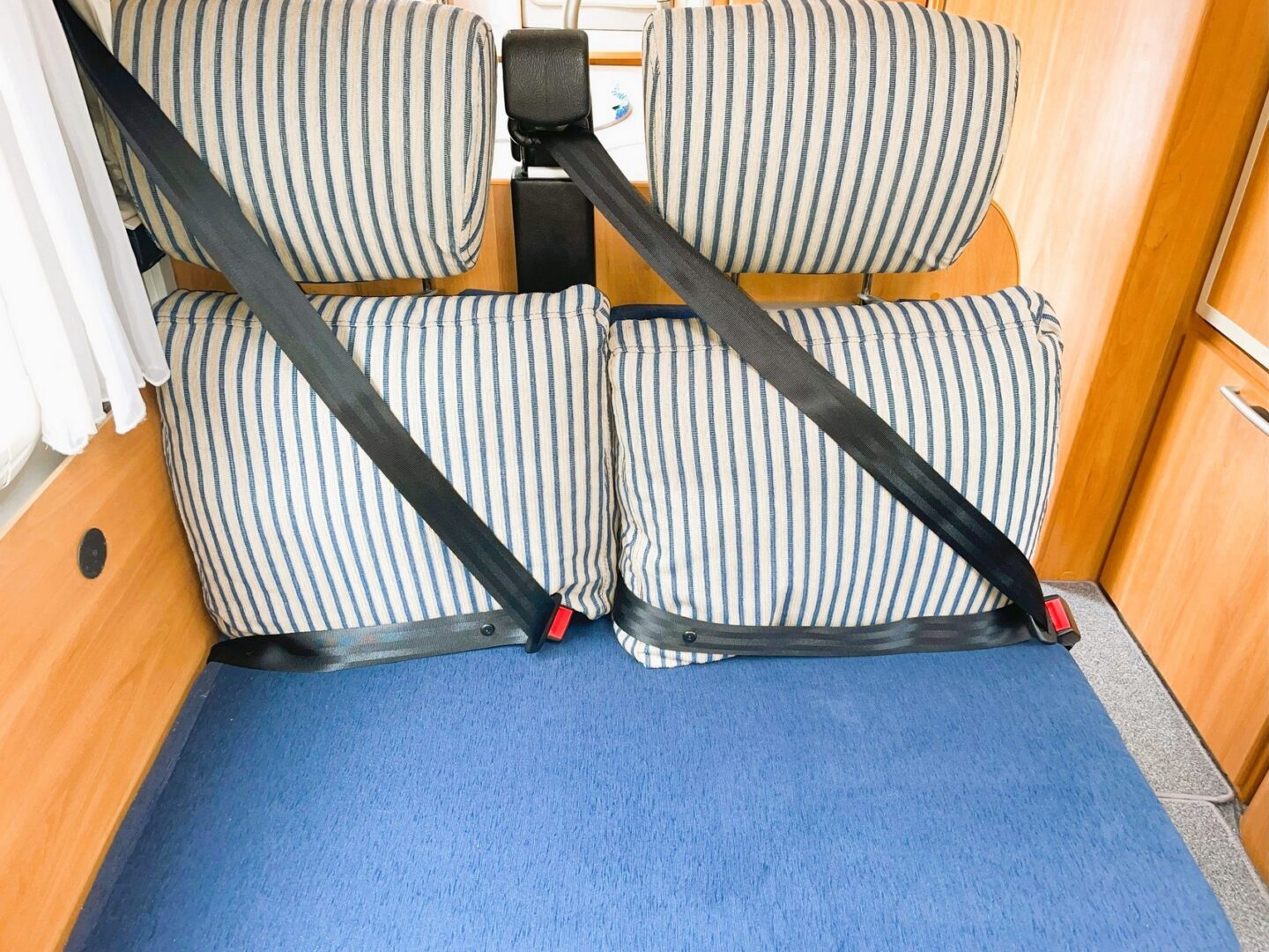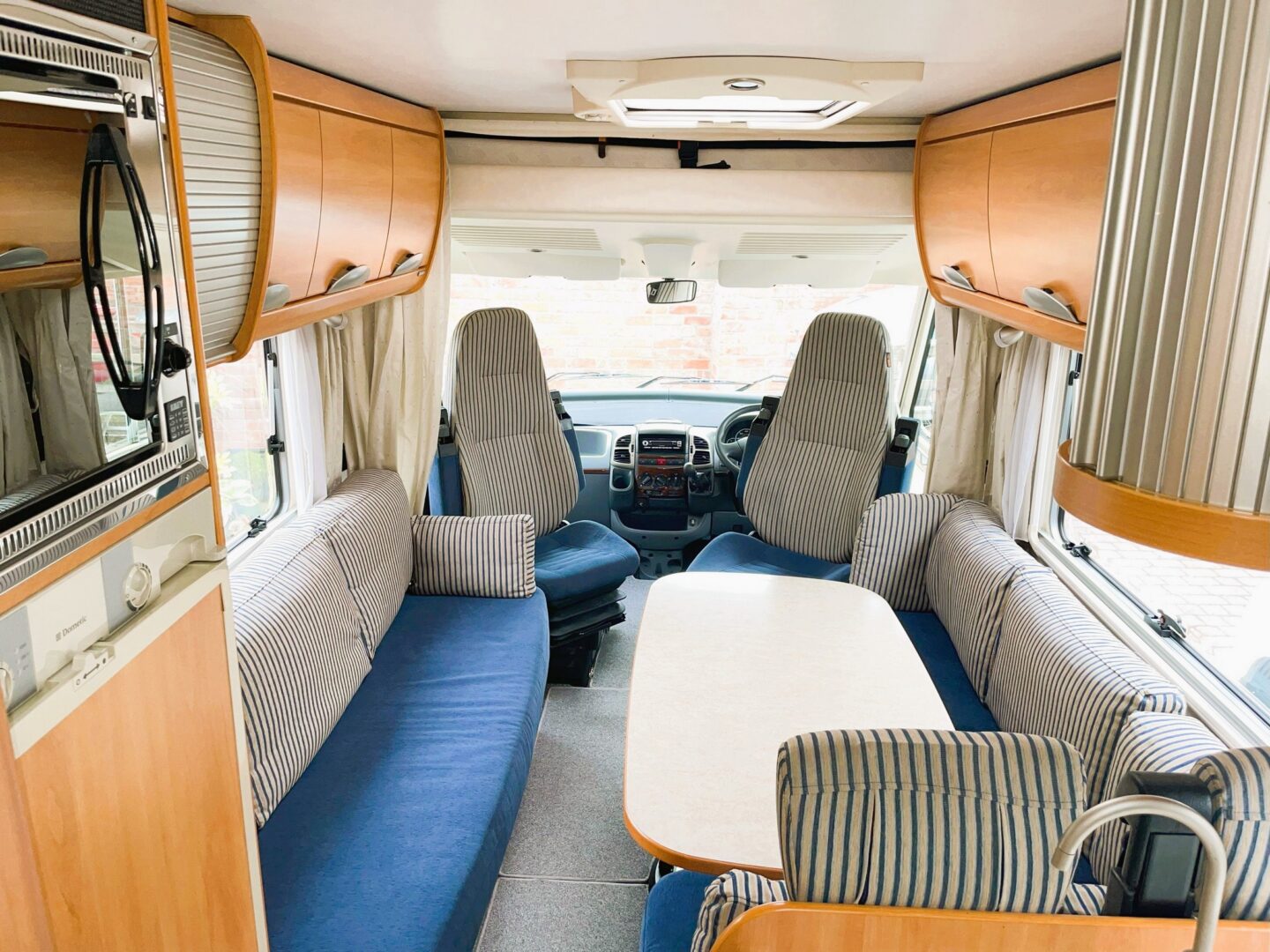 The front of the living space is taken up with a great sociable lounge diner. It has twin sofas, one a 3 seater and the other an L shape with two forward facing seat belts ( both can be made up as single beds with dinette being 195cm x 105cm and the sofa bed being 190cm x 90cm ). With the two captains seats swivelled around this is an airy and very comfortable lounge with a dining table.