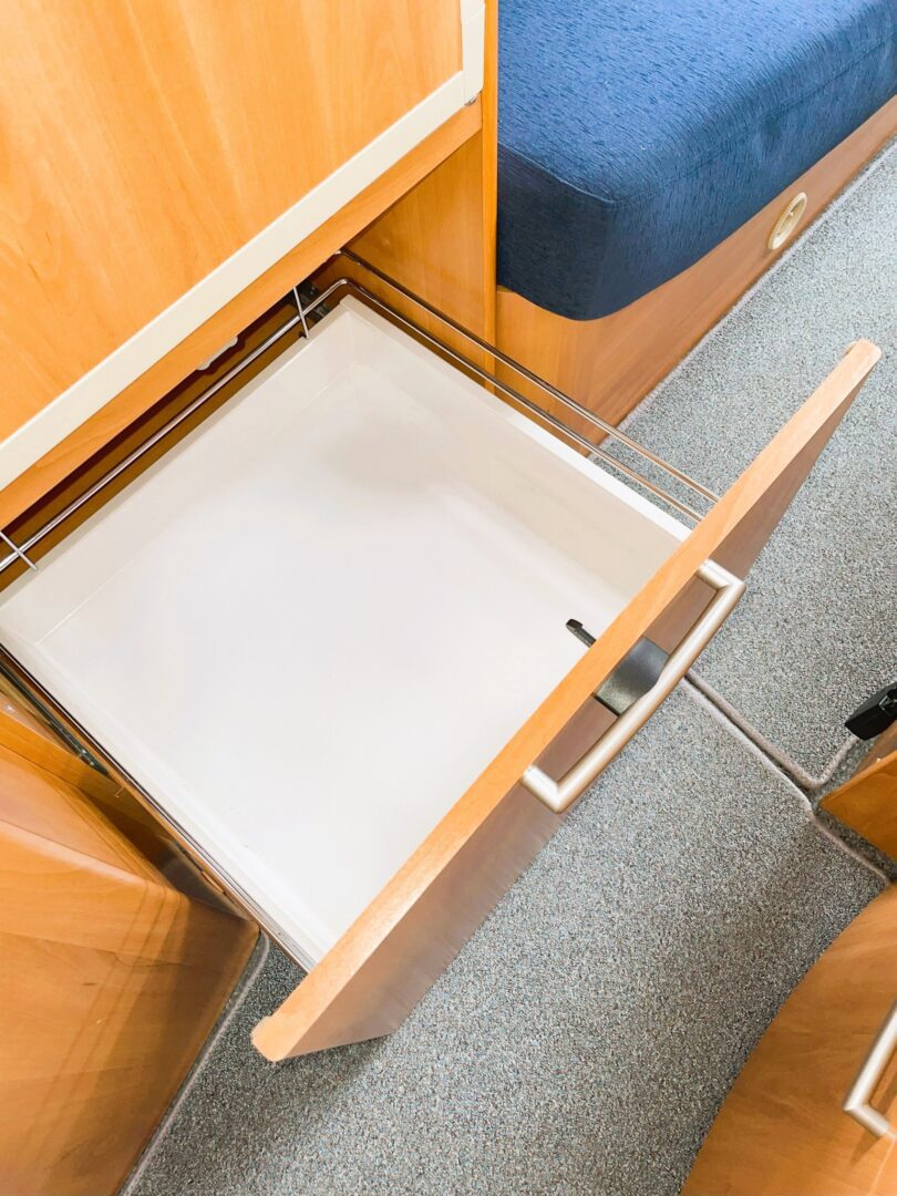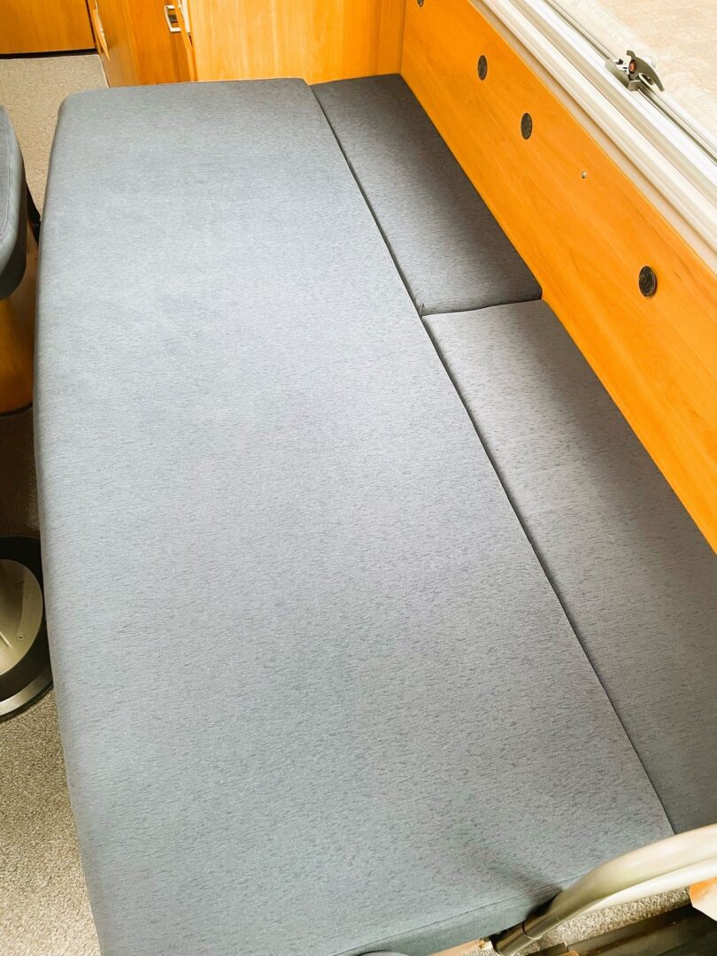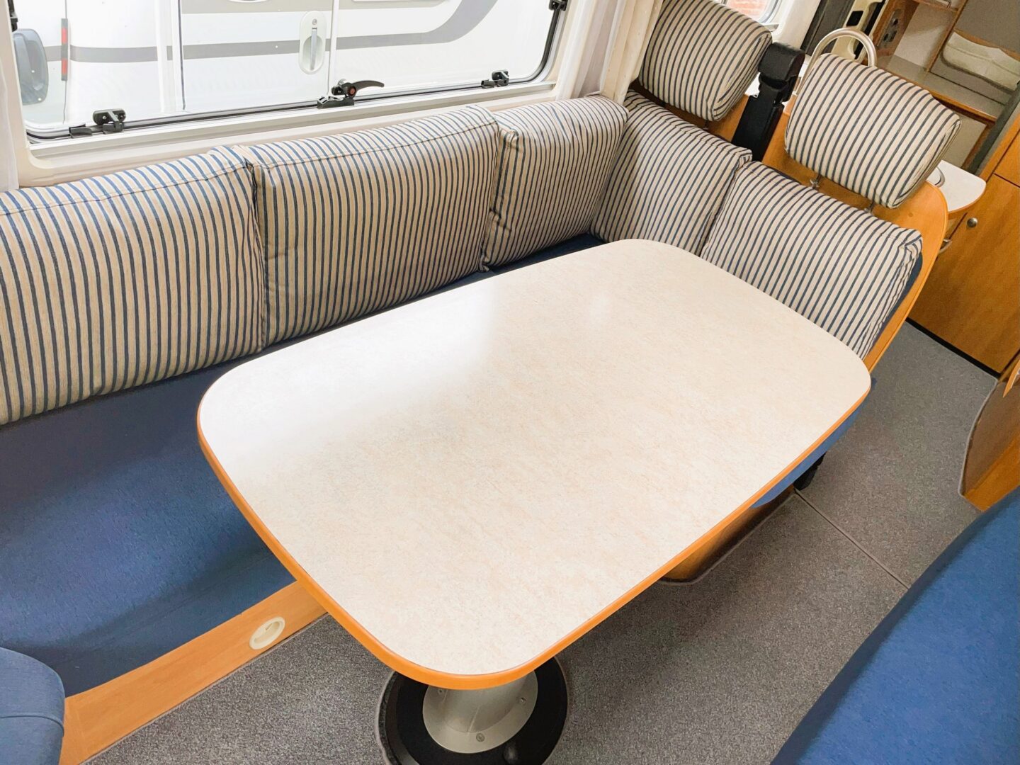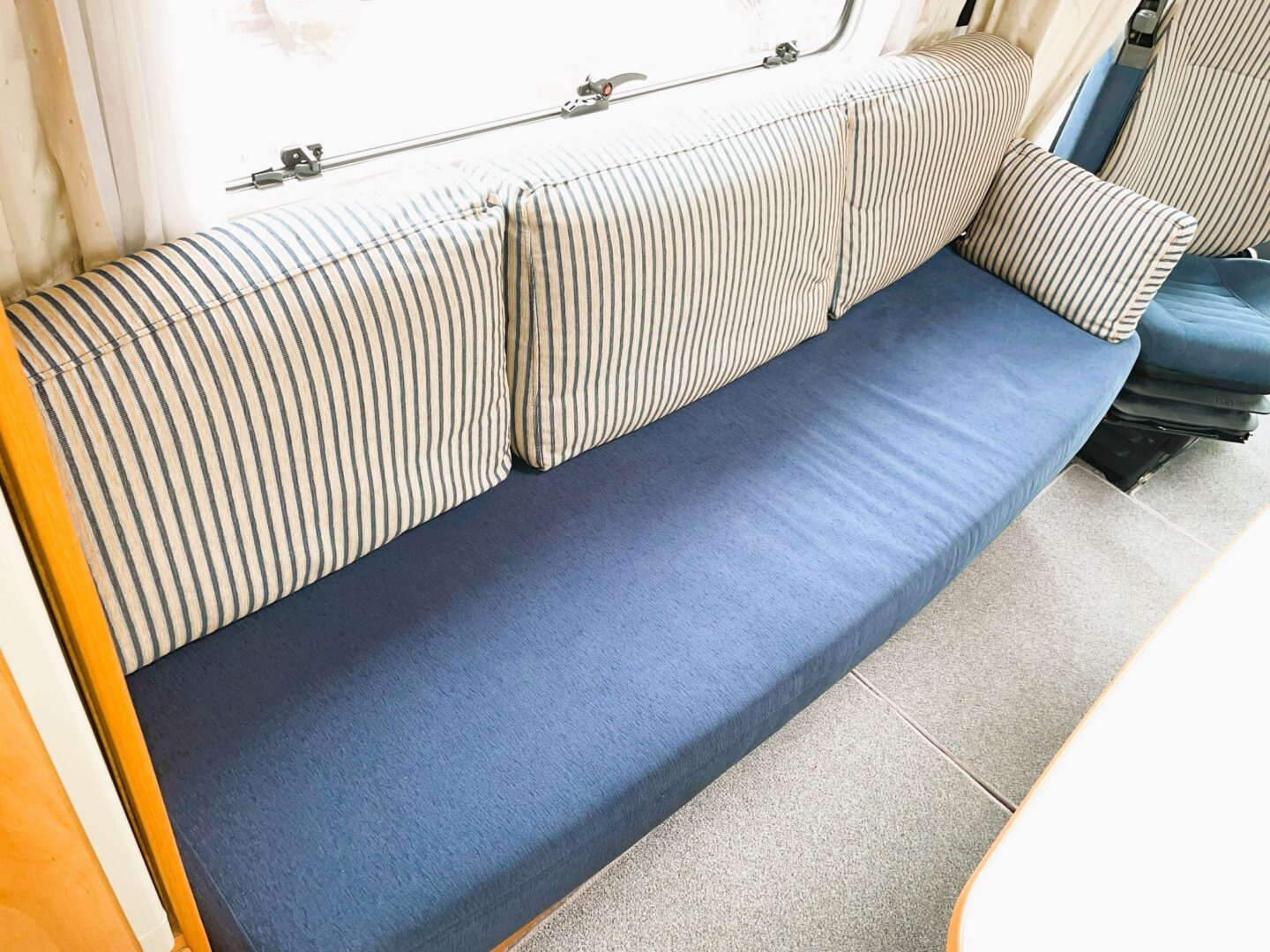 The front of the living space is taken up with a great sociable lounge diner. It has twin sofas, one a 3 seater and the other an L shape with two forward facing seat belts ( both can be made up as single beds with dinette being 195cm x 105cm and the sofa bed being 190cm x 90cm ). With the two captains seats swivelled around this is an airy and very comfortable lounge with a dining table.