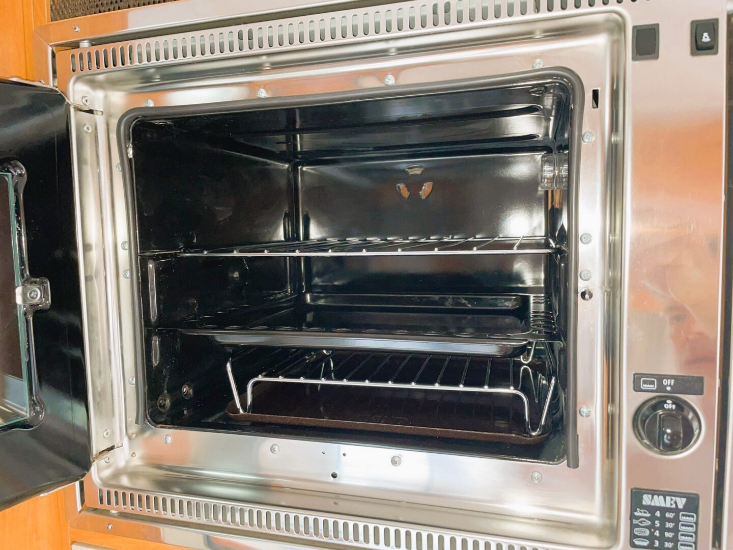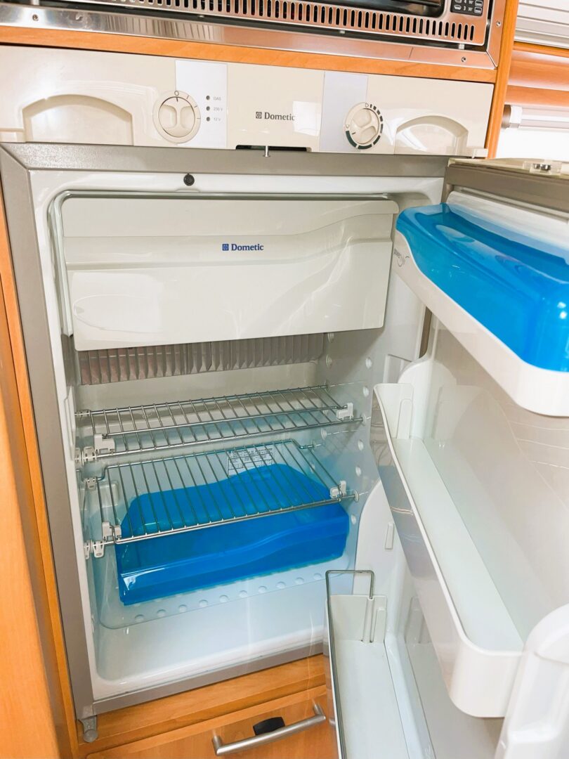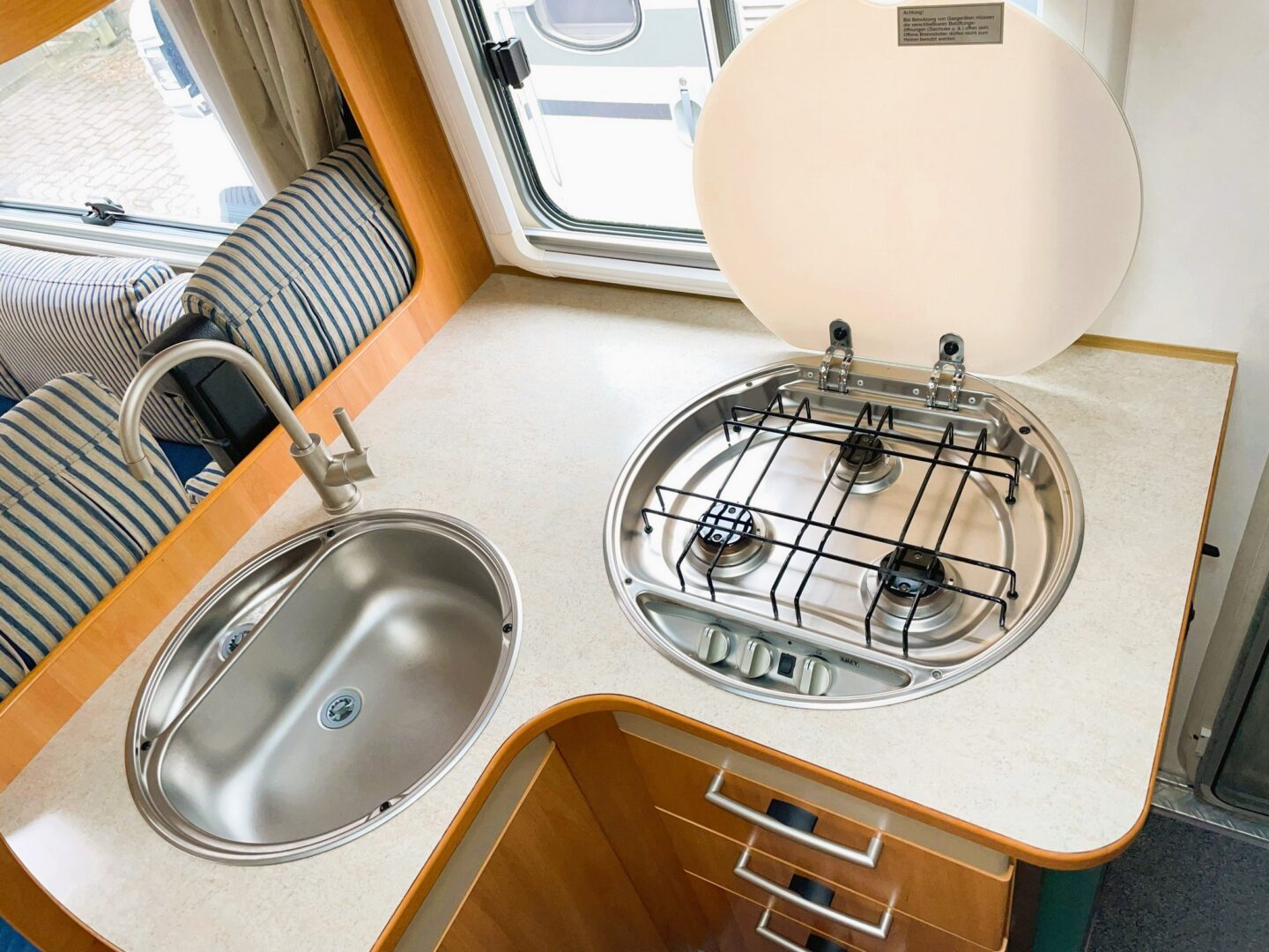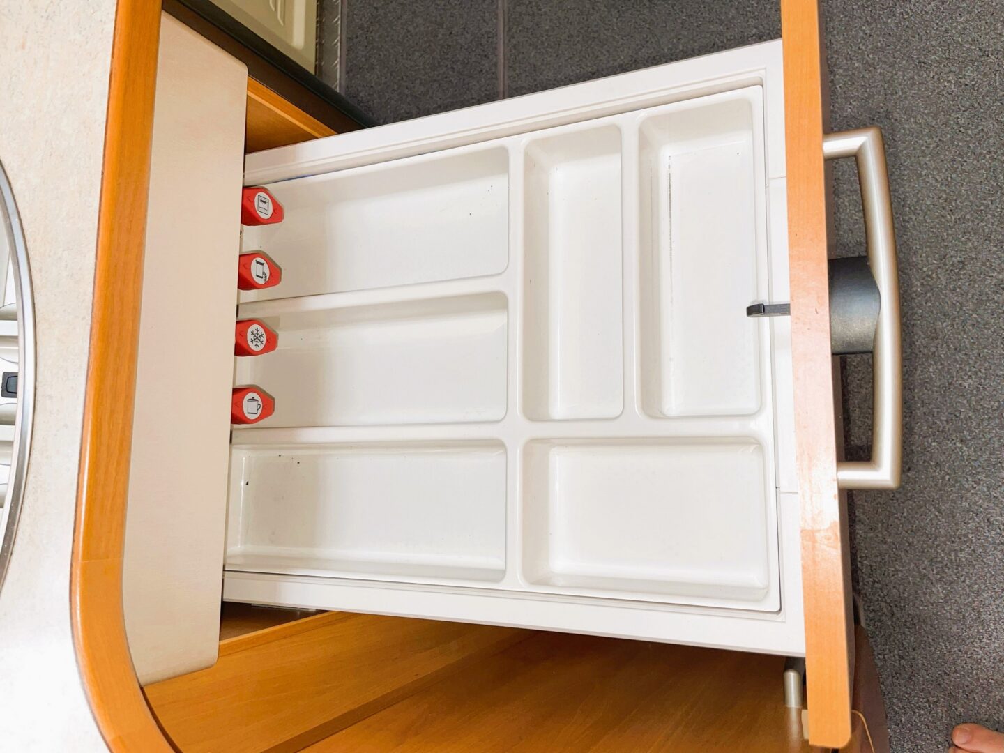 The front of the living space is taken up with a great sociable lounge diner. It has twin sofas, one a 3 seater and the other an L shape with two forward facing seat belts ( both can be made up as single beds with dinette being 195cm x 105cm and the sofa bed being 190cm x 90cm ). With the two captains seats swivelled around this is an airy and very comfortable lounge with a dining table.
