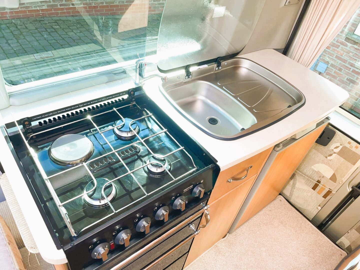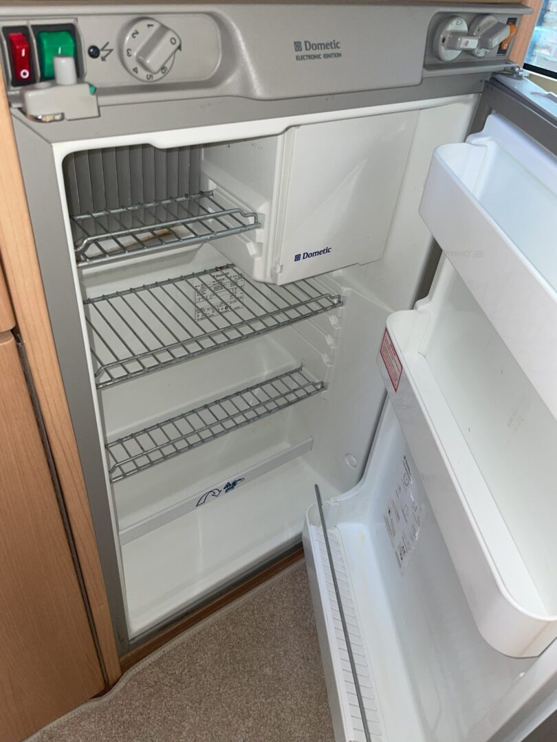 Opposite the washroom is a very neat kitchen with a three way ( gas/240v electric/ 12v ) fridge with freezer compartment, sink with mixer tap and drainer board, full cooker with 4 burner hob ( 3 gas/ one electric ), grill and oven and ample cupboards.
