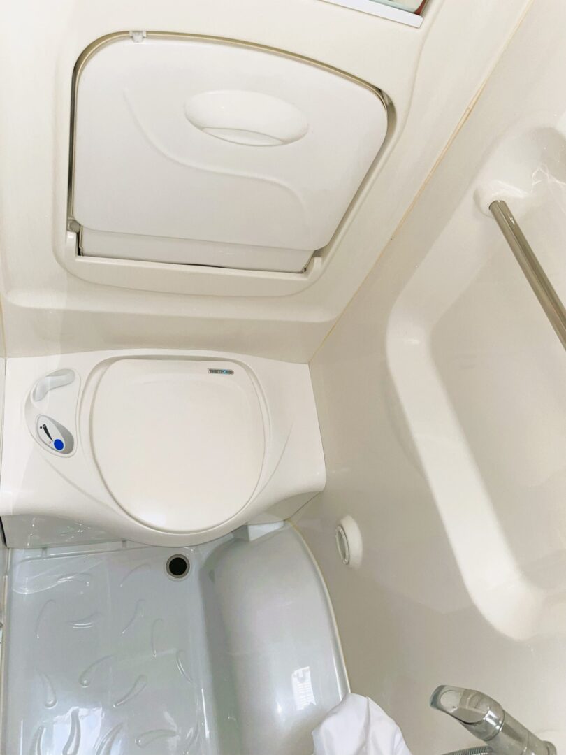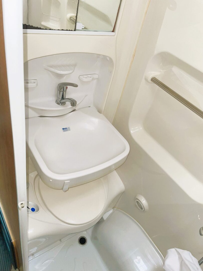 Starting at the rear is a washroom/shower with toilet, folding wash basin, mirrored storage cabinet and a shower curtain. Next to the washroom is a wardrobe.