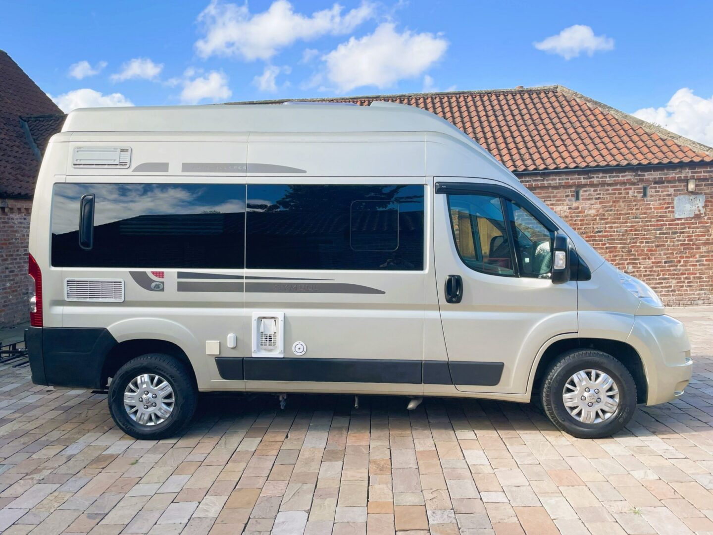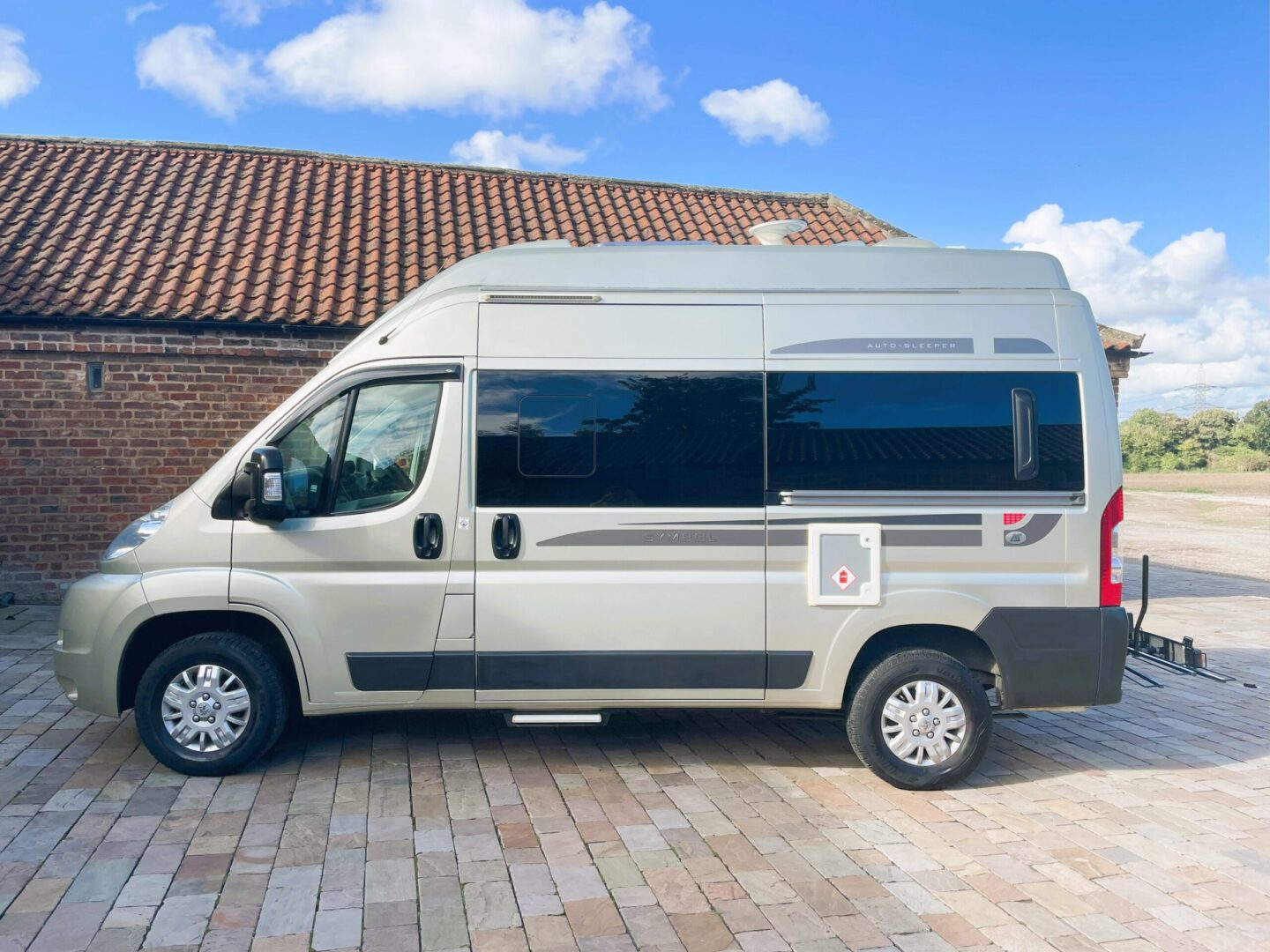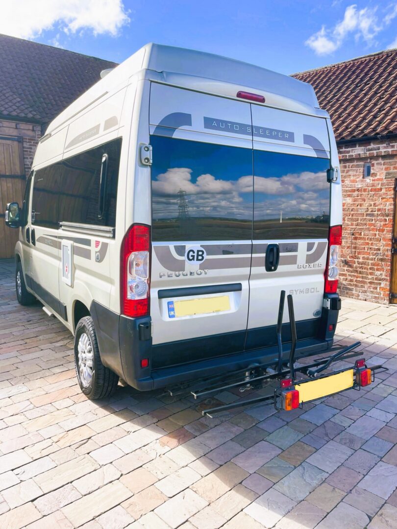 Smart champagne metallic bodywork with graphics fitted with electric entry step, built, rear view camera, tow bar, tow bar mounted ( removable ) bike rack, ALKO Airtop suspension, Alloy wheels, 240 hookup and gas locker for two bottles.