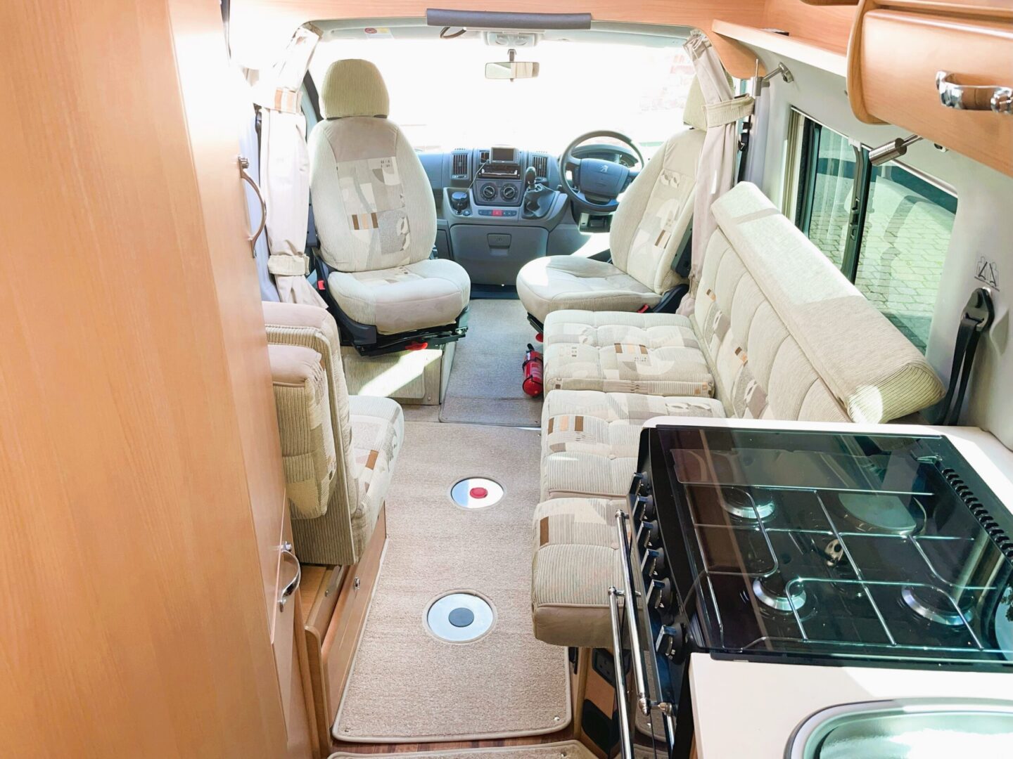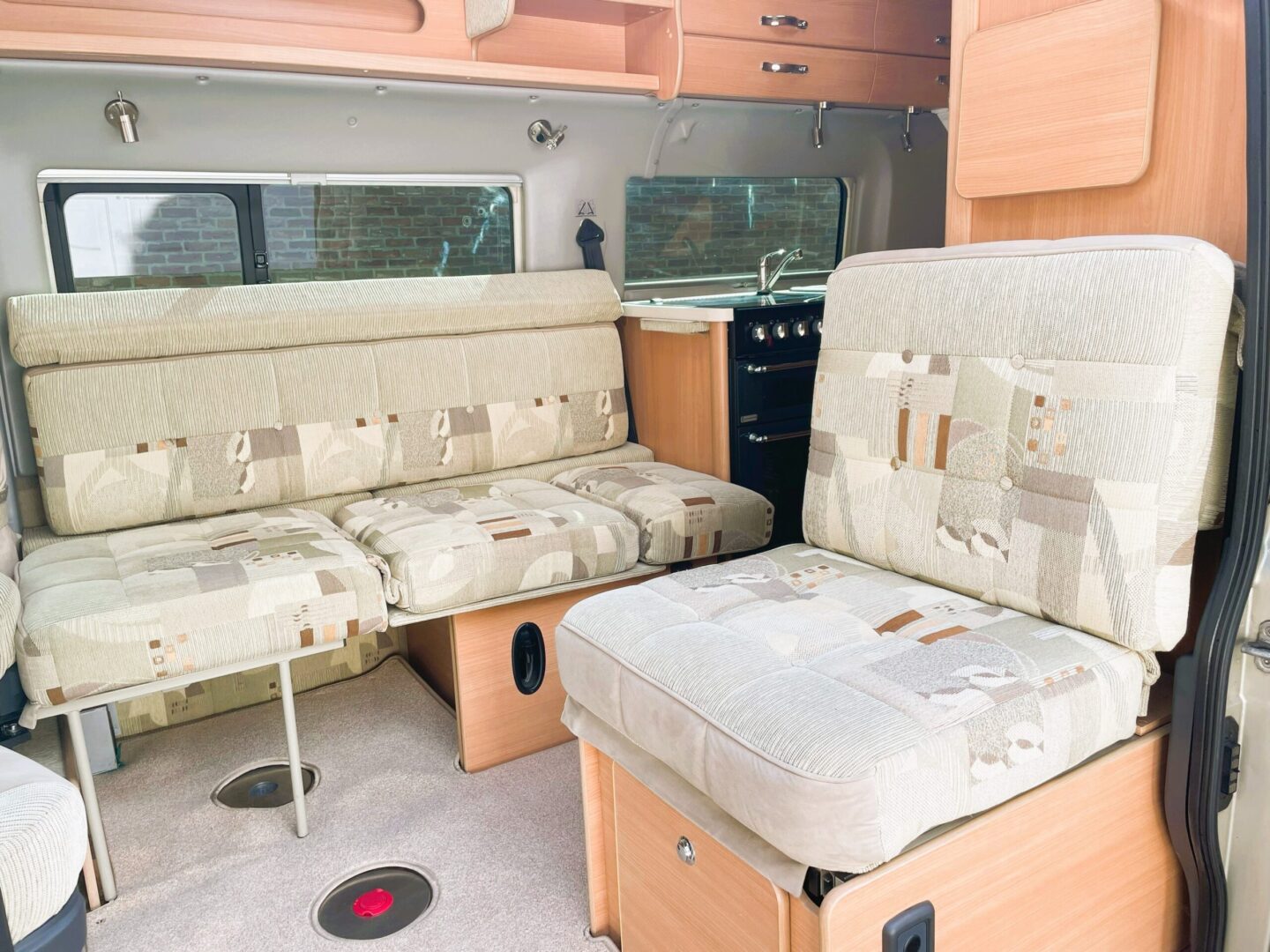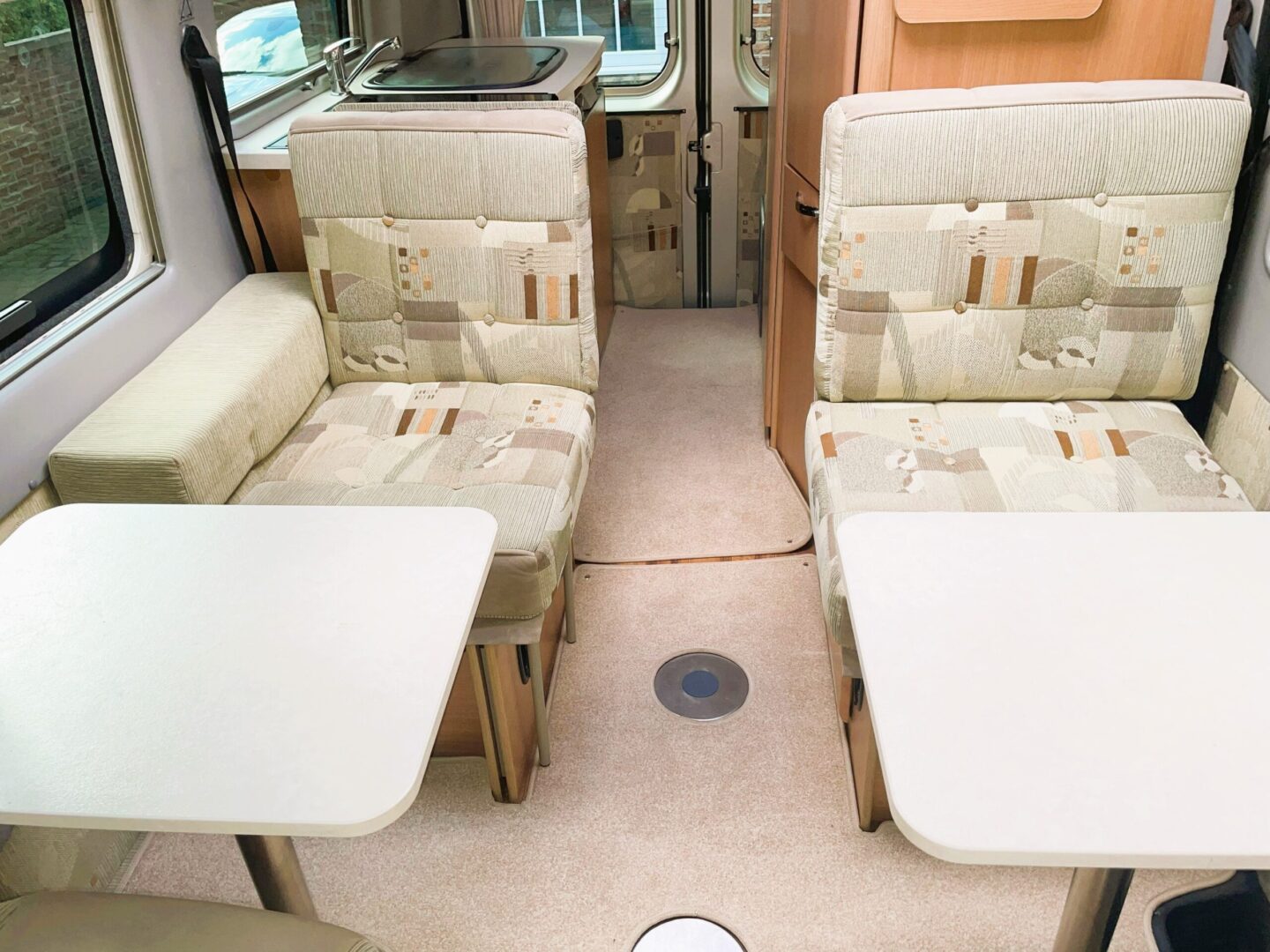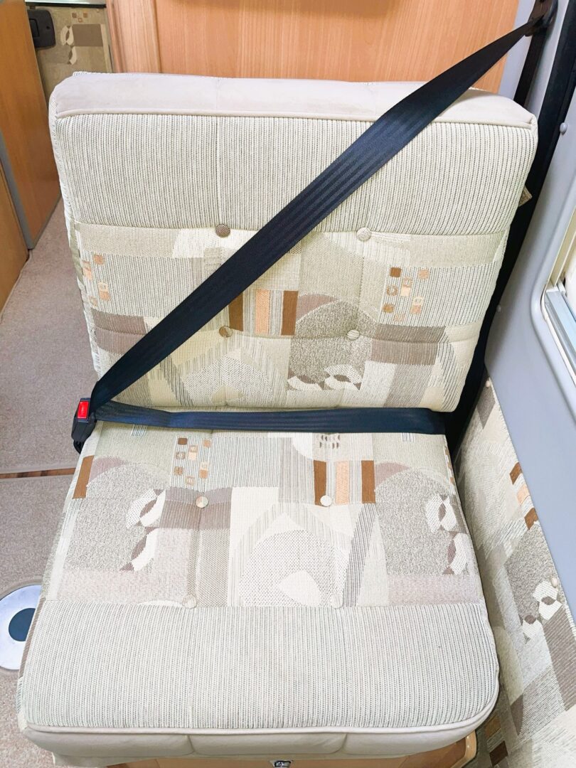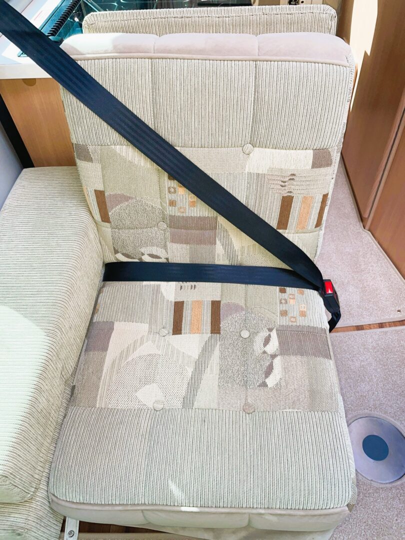 Coming forward you are in the spacious lounge with a long sofa ( this can also be configured as a forward facing seat ), two swivel seats and a single, forward facing seat. Both rear seats have 3 point seatbelts. There is a small dining table.