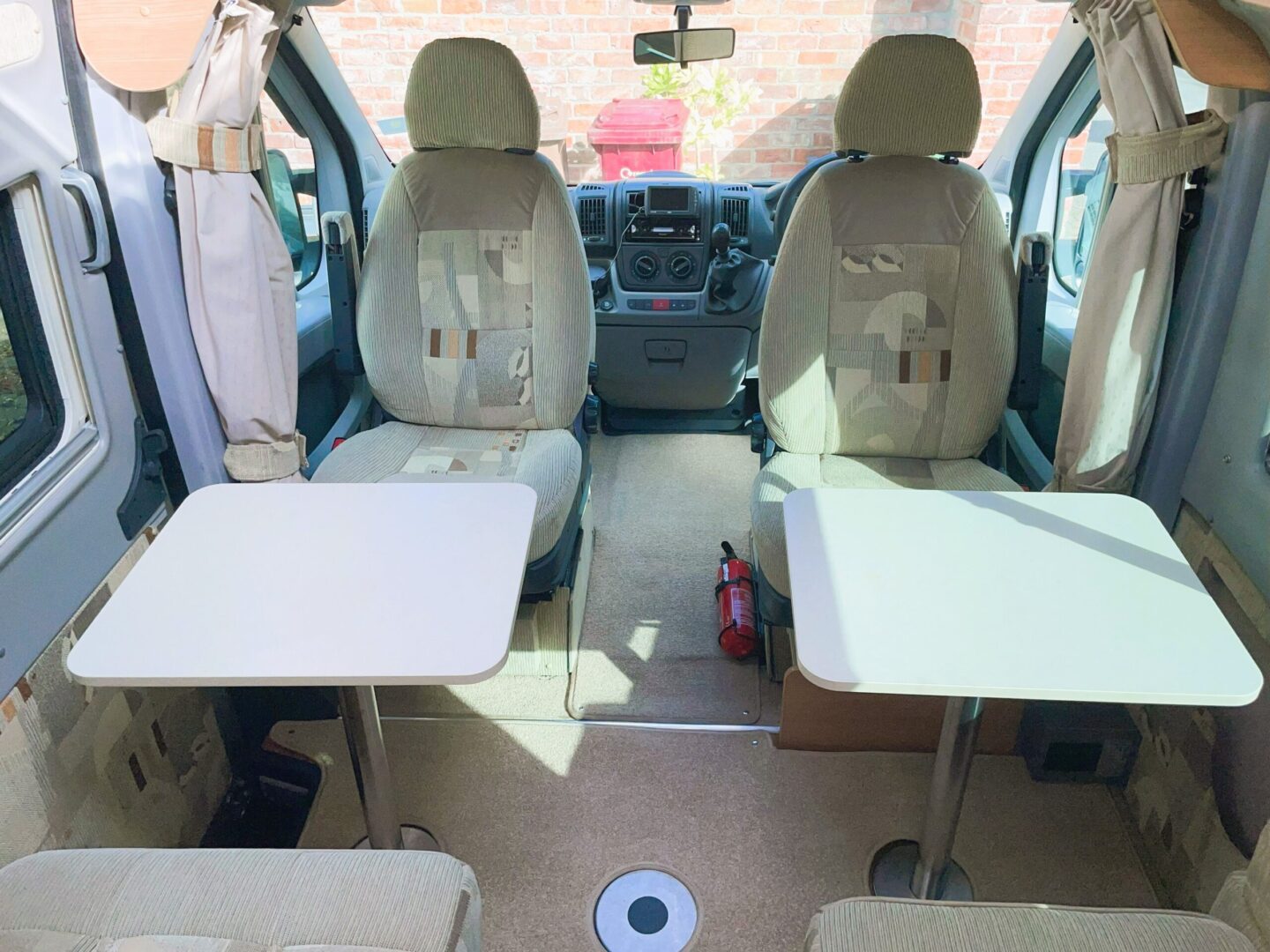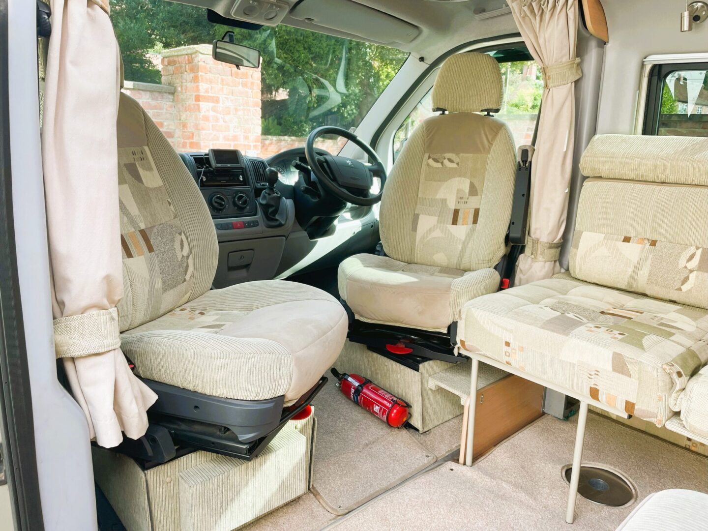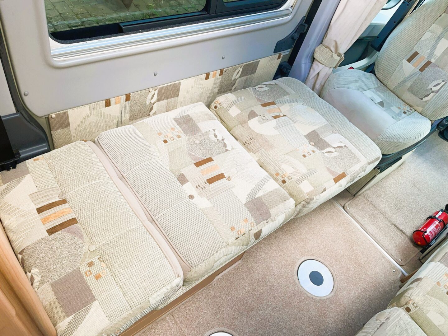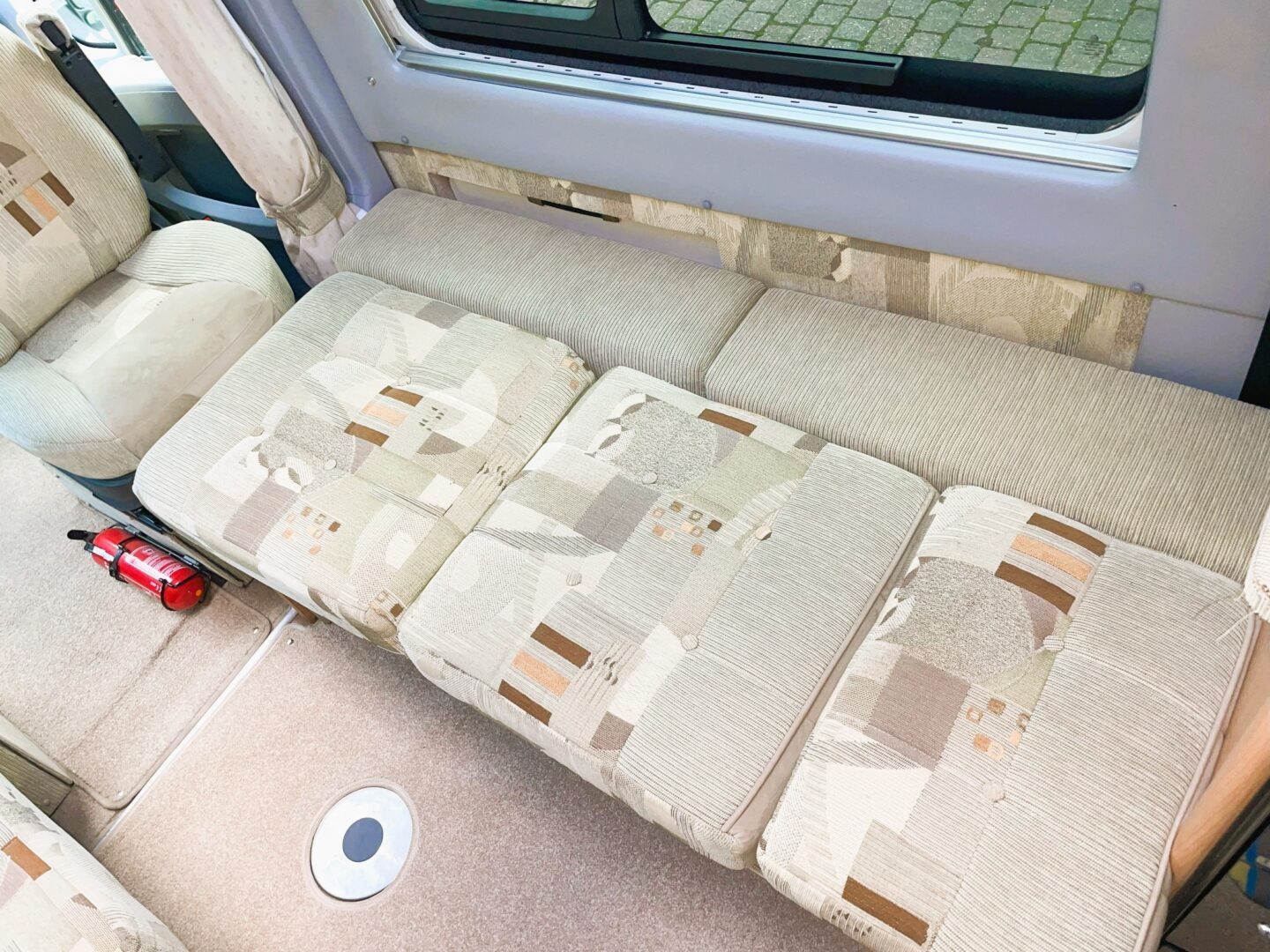 Coming forward you are in the spacious lounge with a long sofa ( this can also be configured as a forward facing seat ), two swivel seats and a single, forward facing seat. Both rear seats have 3 point seatbelts. There is a small dining table.