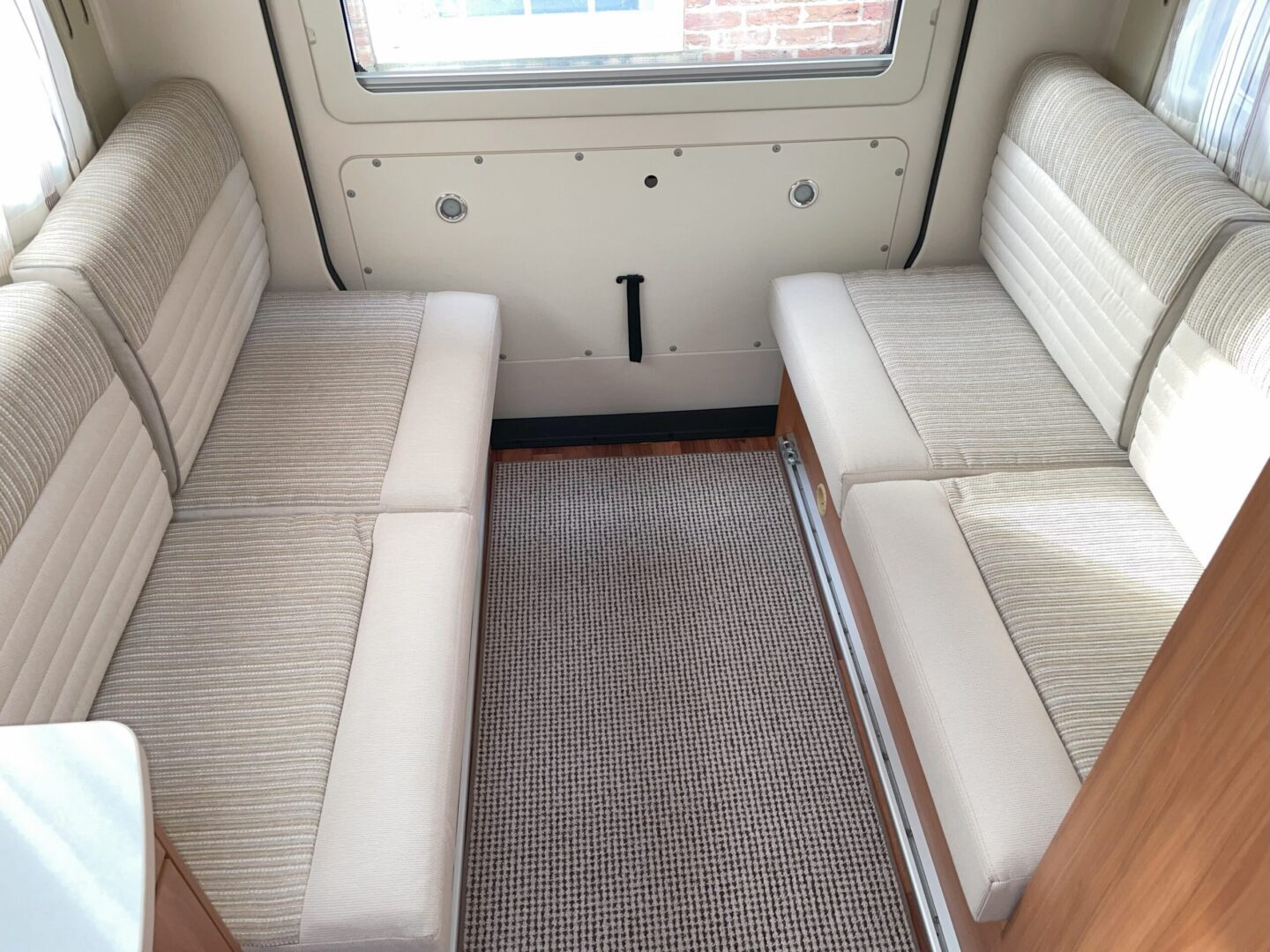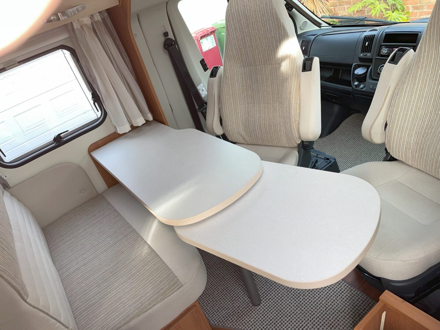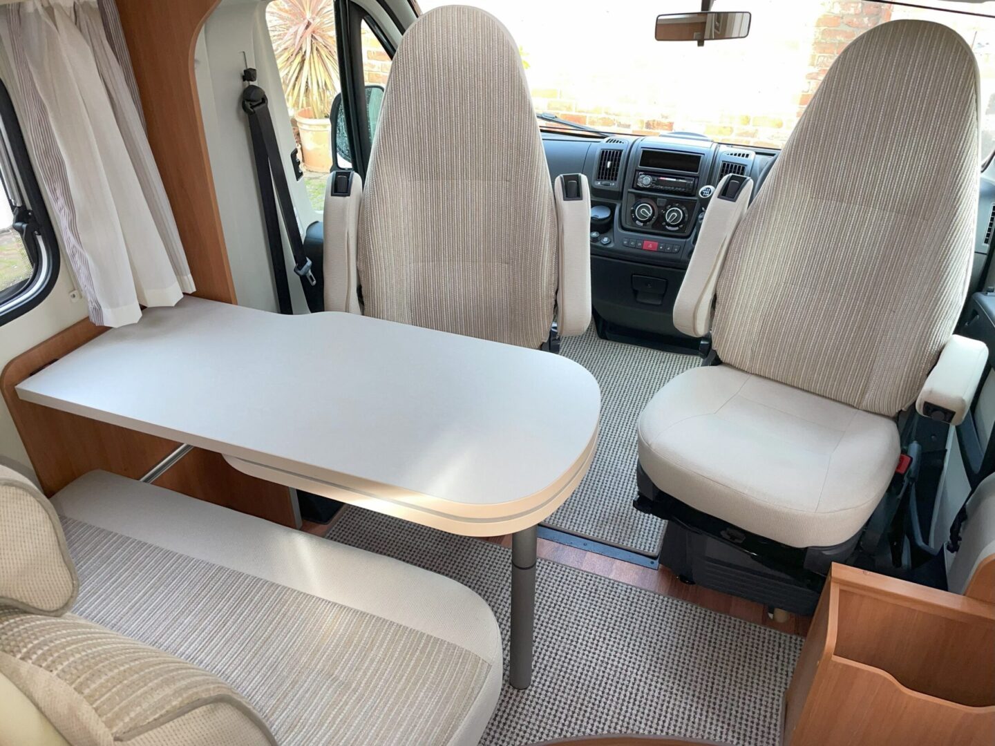 Up front you have a two seater dinette ( fitted with two forward facing seat belts ) with an extendible dining table and with the front captains seats swivelled this is a super sociable area. The front dinette can be made up as an extra single bed using the table as a base.