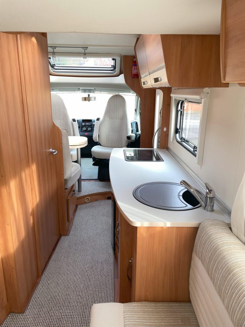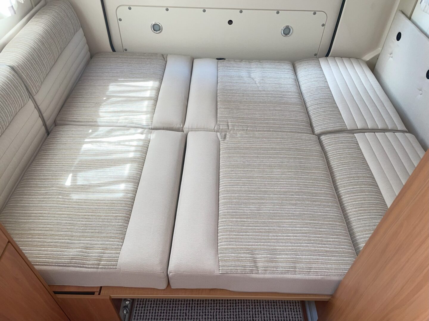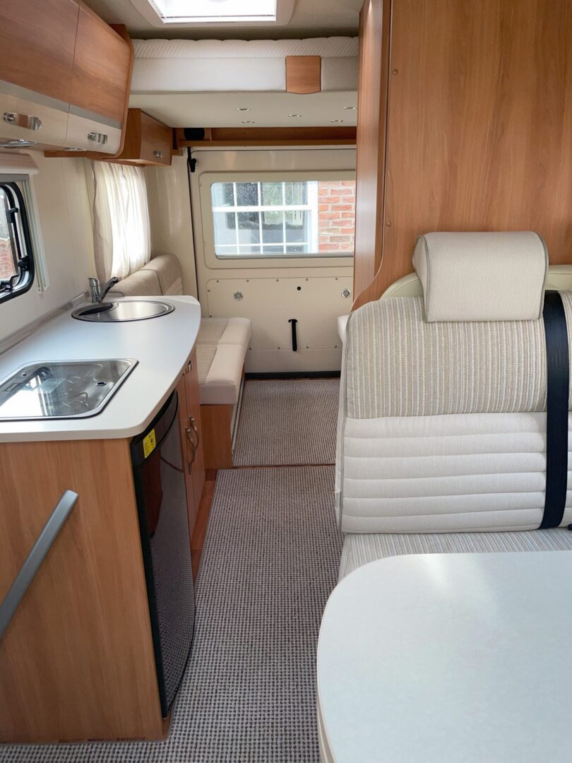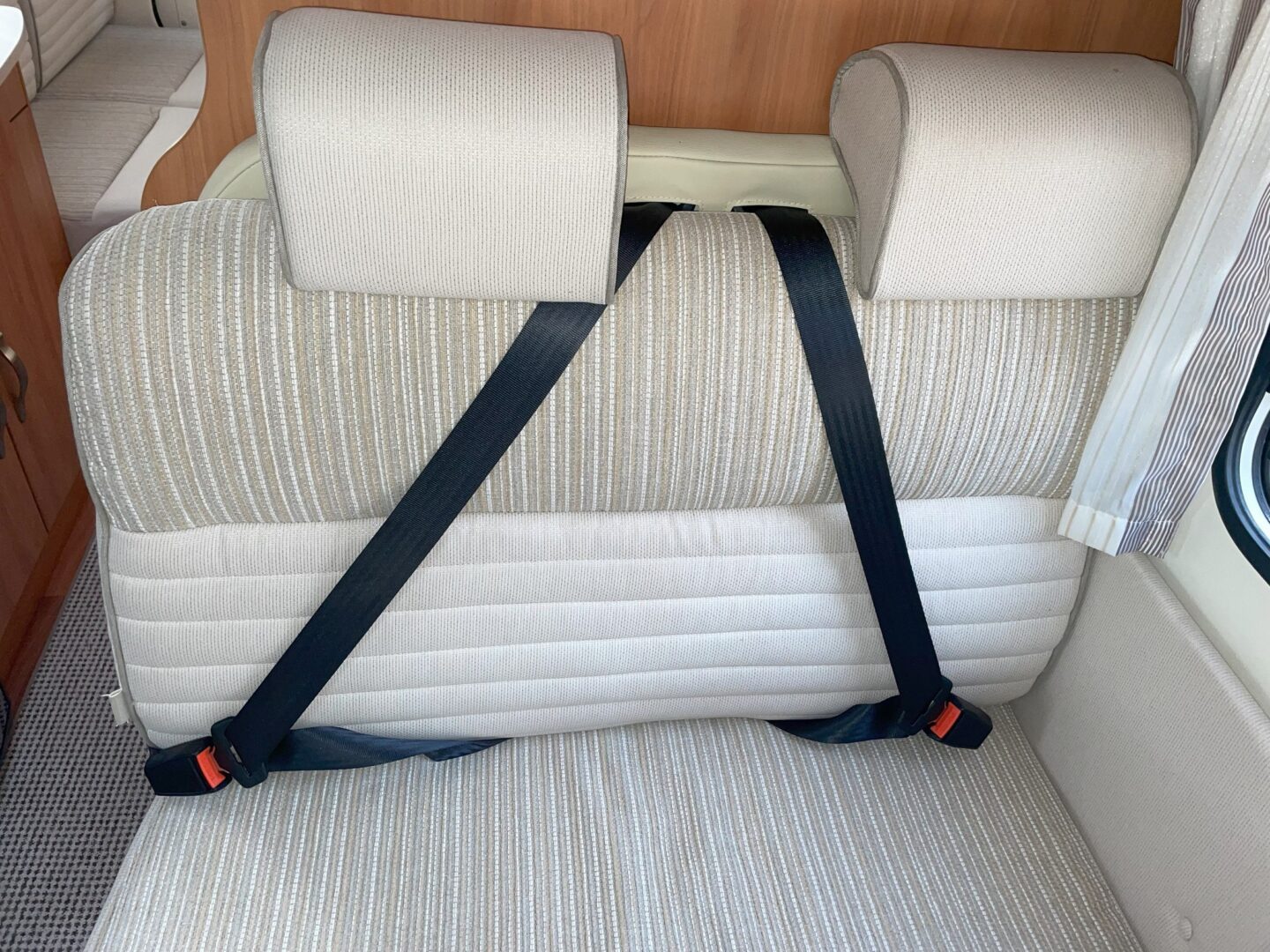 Up front you have a two seater dinette ( fitted with two forward facing seat belts ) with an extendible dining table and with the front captains seats swivelled this is a super sociable area. The front dinette can be made up as an extra single bed using the table as a base.