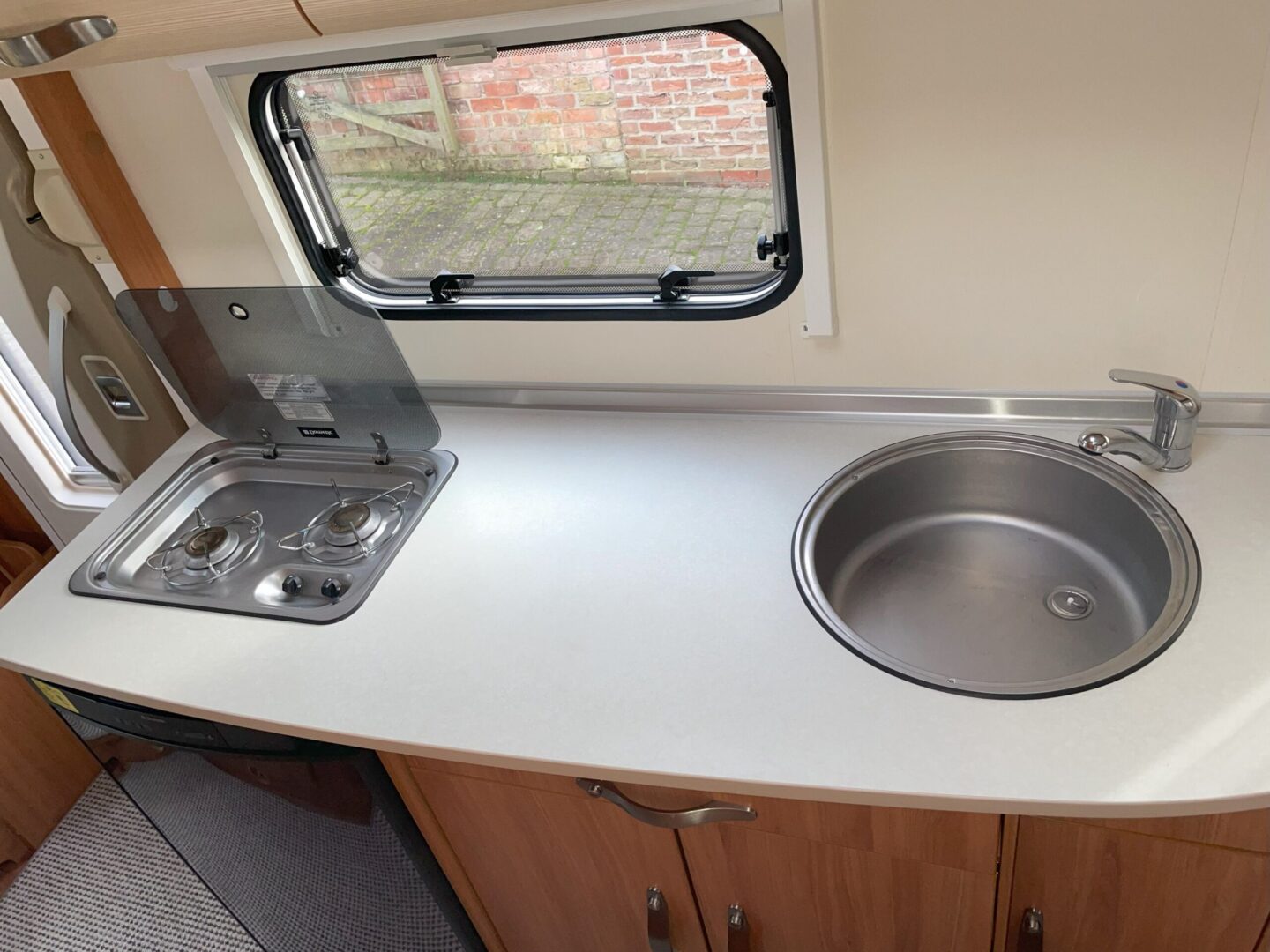 Coming forward you have the rear kitchen on one side with stainless sink with mixer tap, 2 burner gas hob, 3 way (gas/240v/12v ) fridge/freezer, plenty of worktop space and ample cupboards and drawers.
