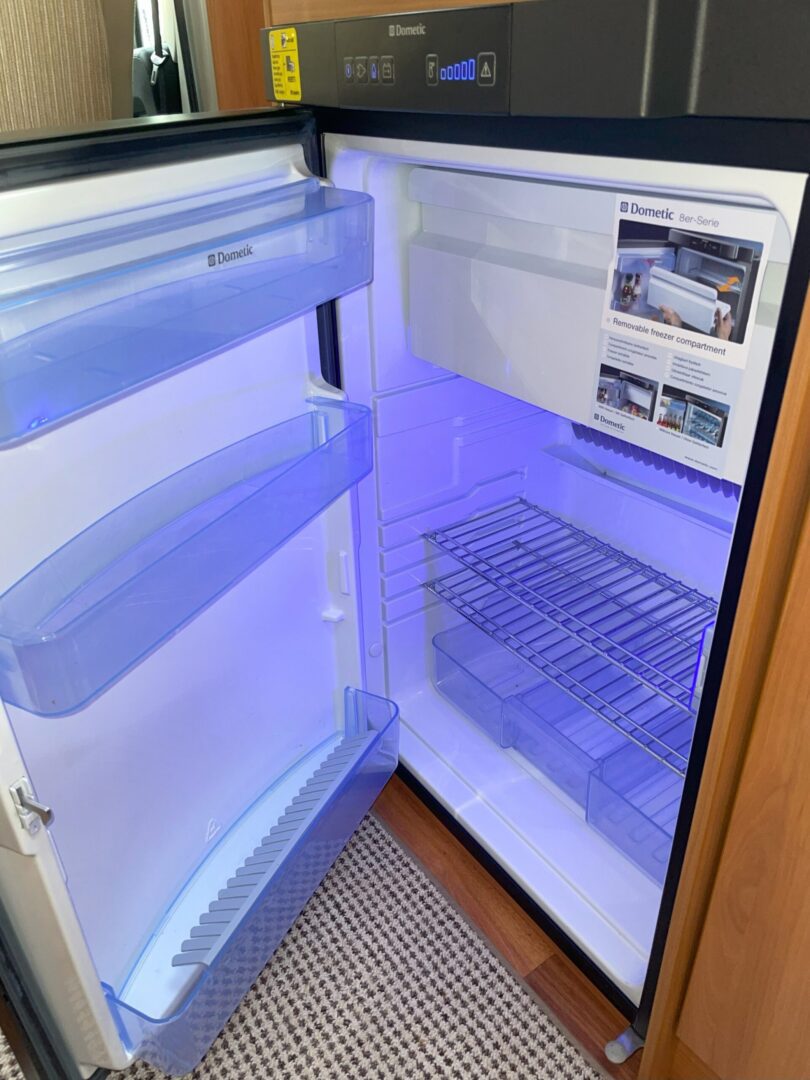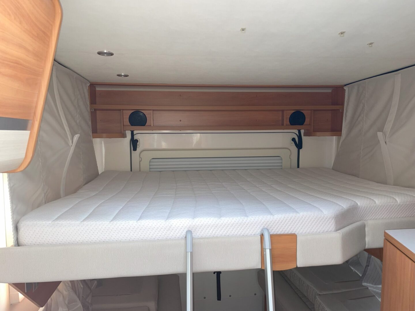At the rear is a spacious lounge with two sofas. These can be made up into a transverse double bed ( 145cm x 190cm ) or easily two kids beds ( 63cm x 145cm ). Above the lounge is Hymers ingenious drop down bed ( manually operated ) (140cm x 183cm ). There is a good sized wardrobe next to the rear lounge. There is a large, under floor storage locker situated in the rear lounge as well as storage under one sofa with the other sofa locker being used for the fresh water tank and the leisure battery with space to add a second leisure battery.