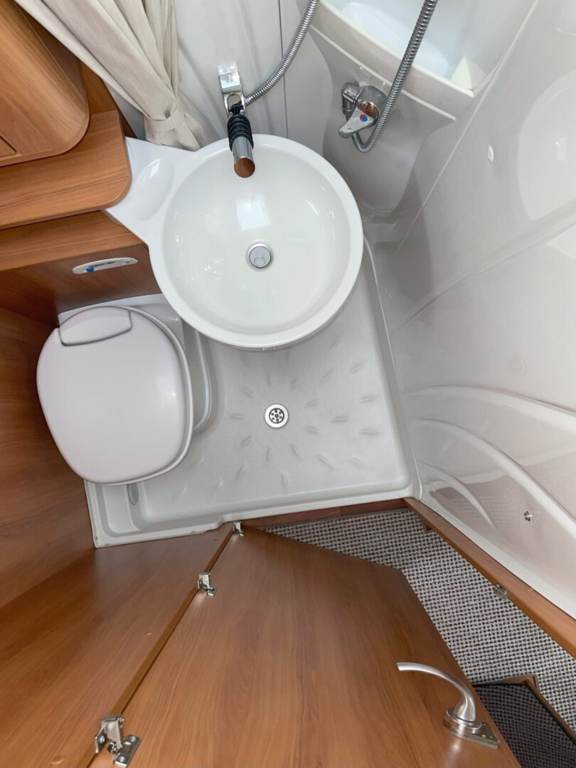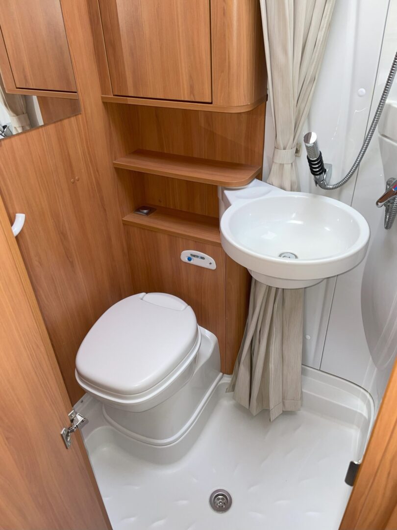 Opposite the kitchen is the shower room with thetford toilet, wash basin, shower, storage cupboards and a mirror.