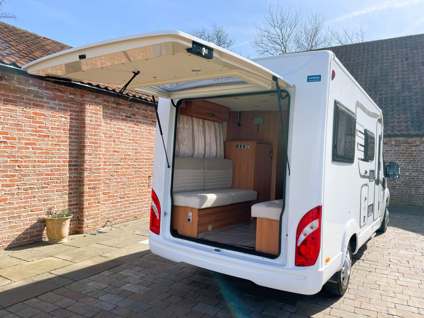 Excellent white bodywork with graphics with external gas locker and 240 hookup point. One fantastic feature of this Hymer is the rear tailgate, the whole rear end lifts allowing access for loading, inside/outside living for the rear lounge and even an overhead canopy with lights to sit under.
