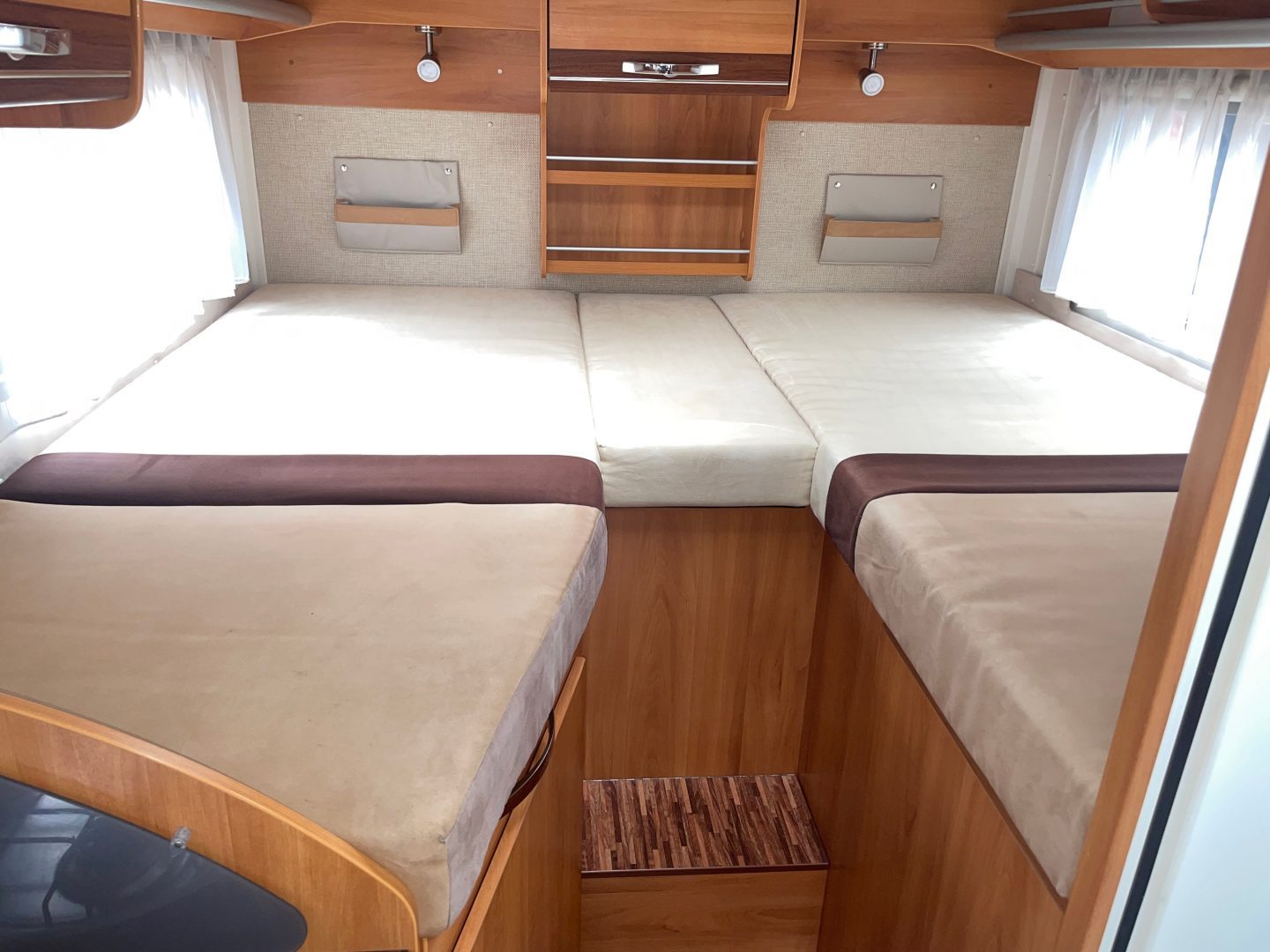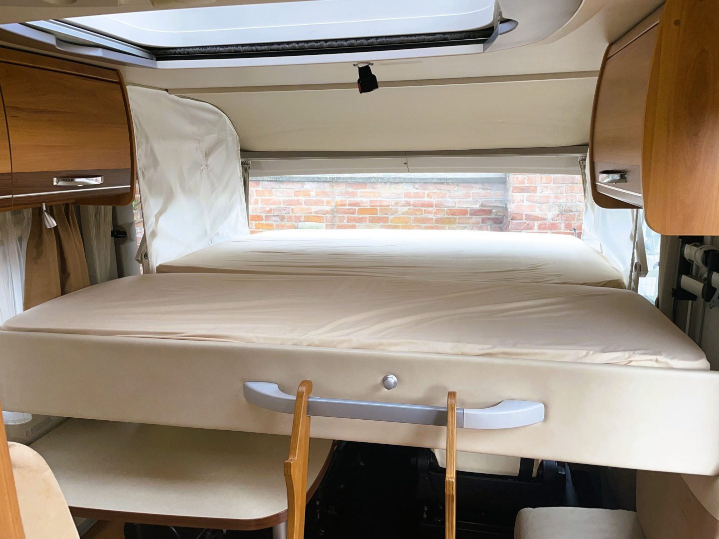 Over the cab is the famous Hymer pull down bed. The Exsis bed is a fantastic design as it can be a small double transverse bed (180cm x 130cm ) or, by adding the extension mattress, it becomes a super king size (180cm x 200cm ) which can be used to sleep lengthways or transverse. The mattresses have custom made fitted sheets. The cab is fitted with air conditioning.