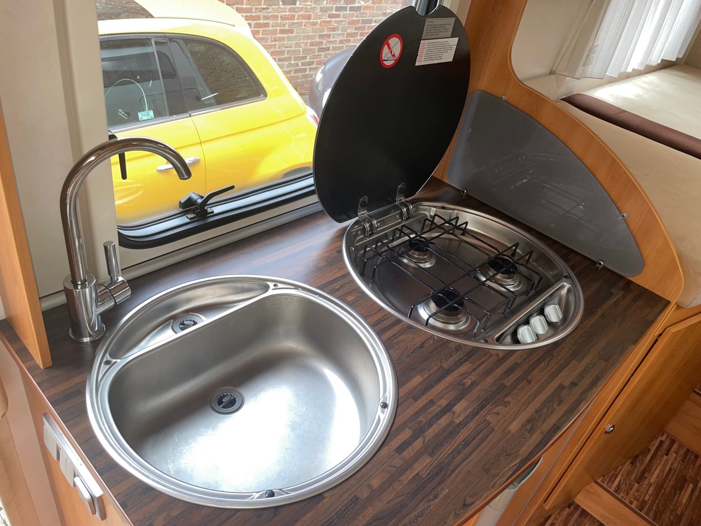 In the centre left is the kitchen with 3 burner gas hob, sink with mixer tap, a 3 way ( gas/240v/12v ) fridge with freezer compartment, ample storage cupboards and drawers.