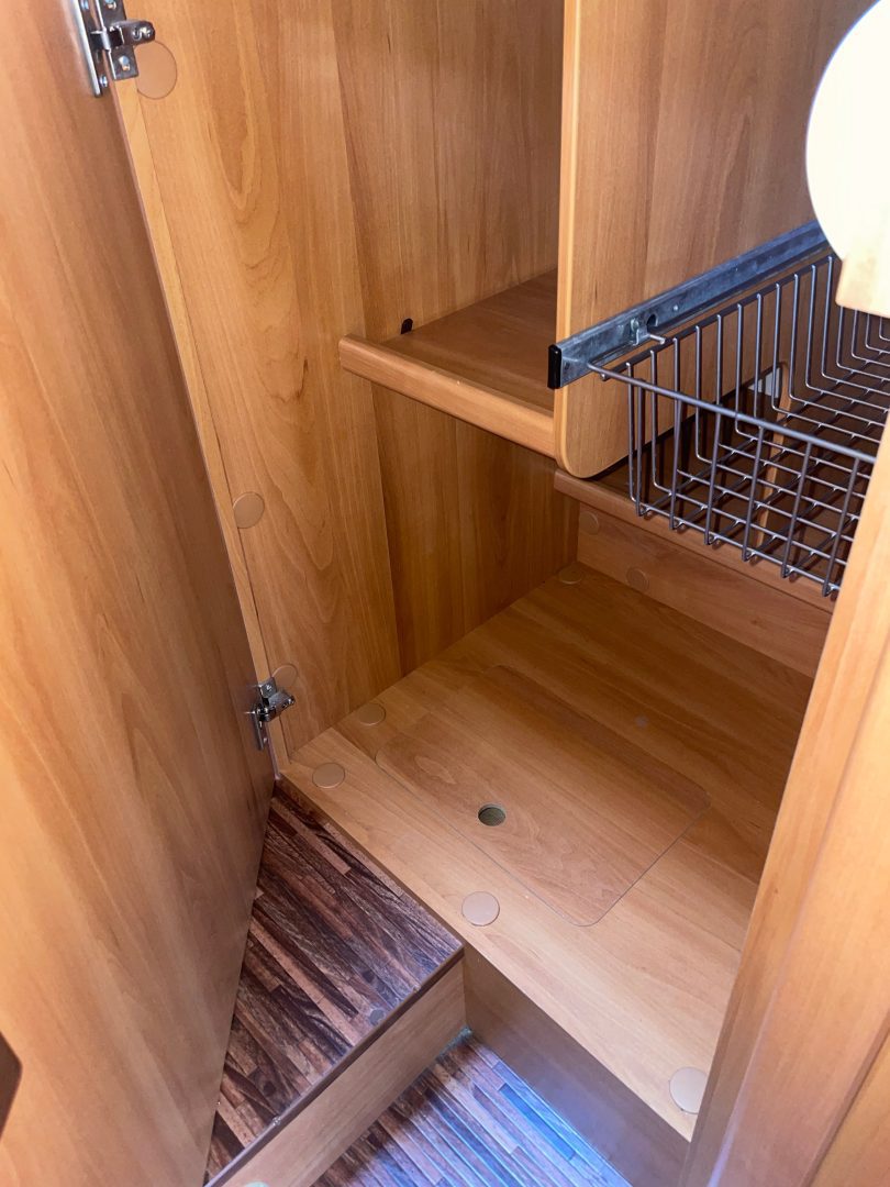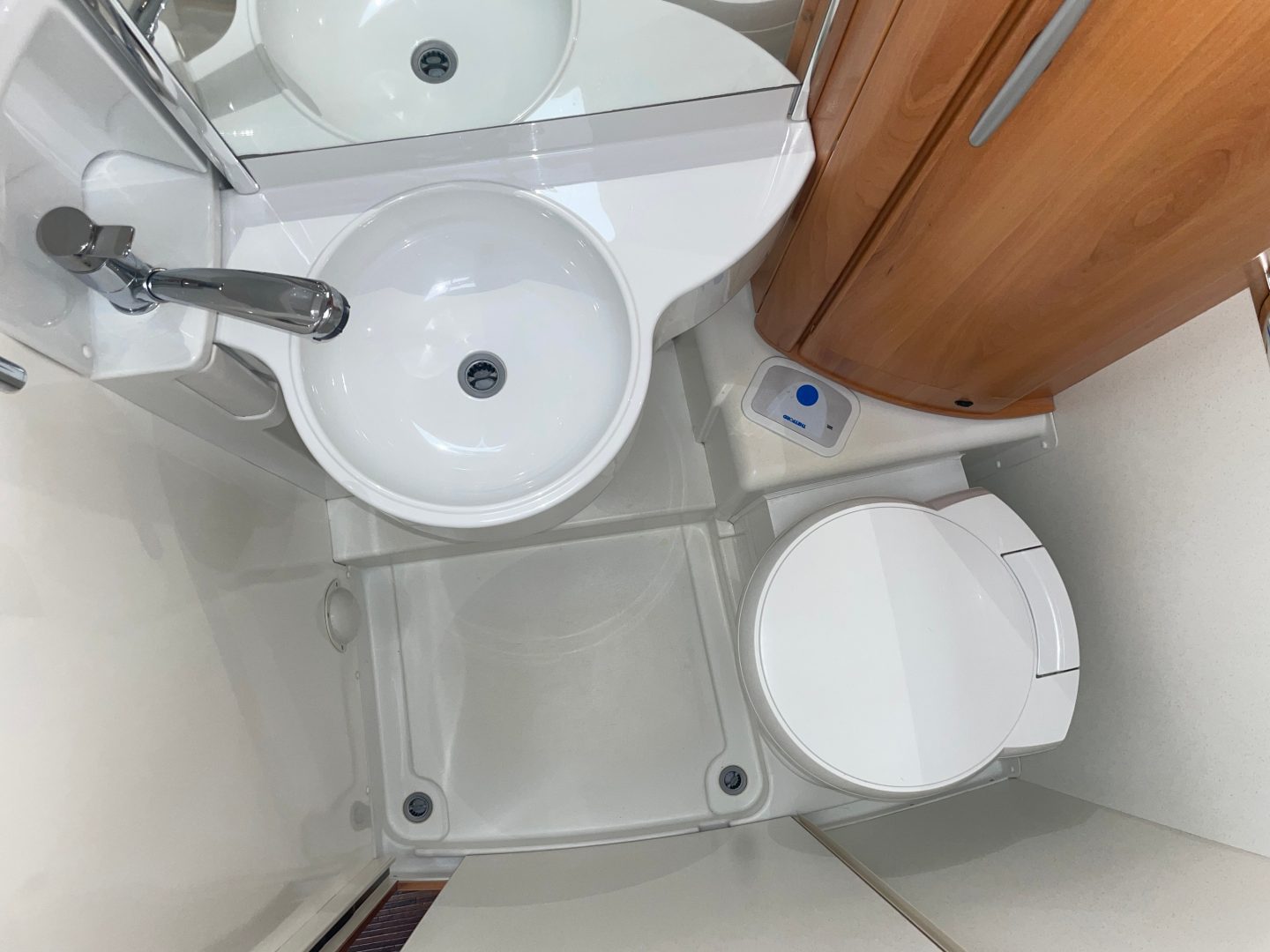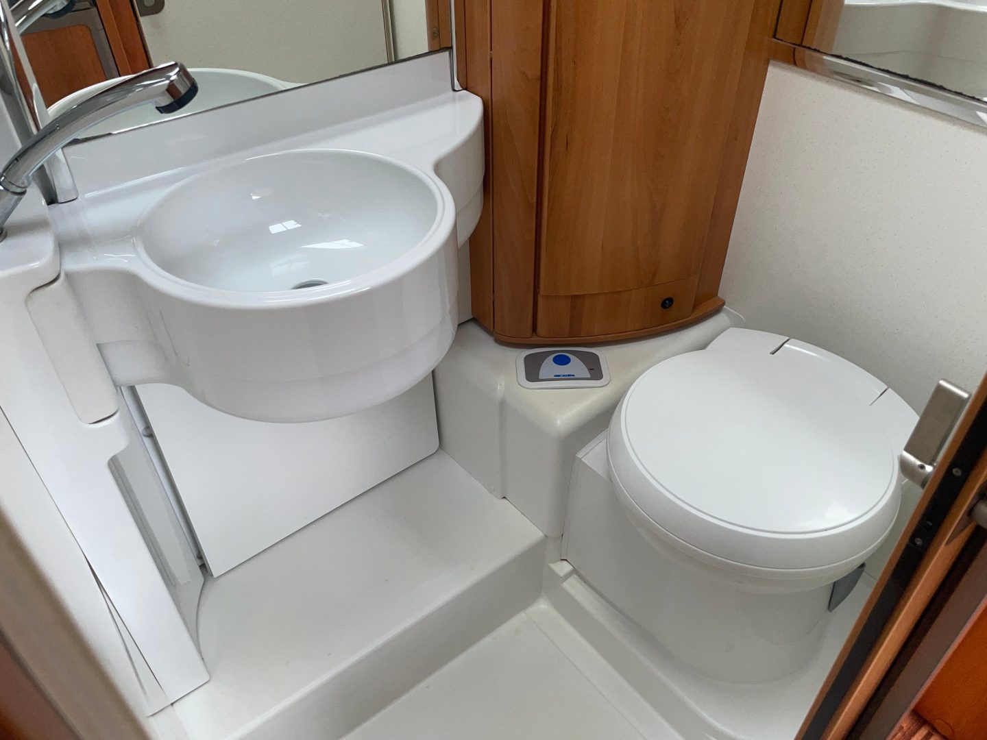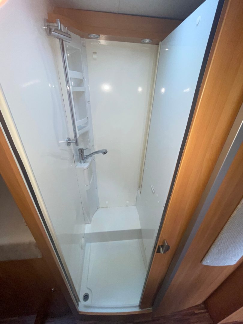 Opposite the kitchen is the shower room with thetford swivel toilet, wash basin and using the vario swing wall system, a full size shower cubicle.