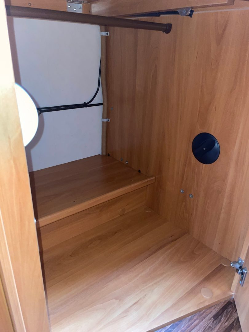 Starting at the back there are twin single beds ( 2x L 195cm x W 80cm )There are several storage cupboards and shelving.