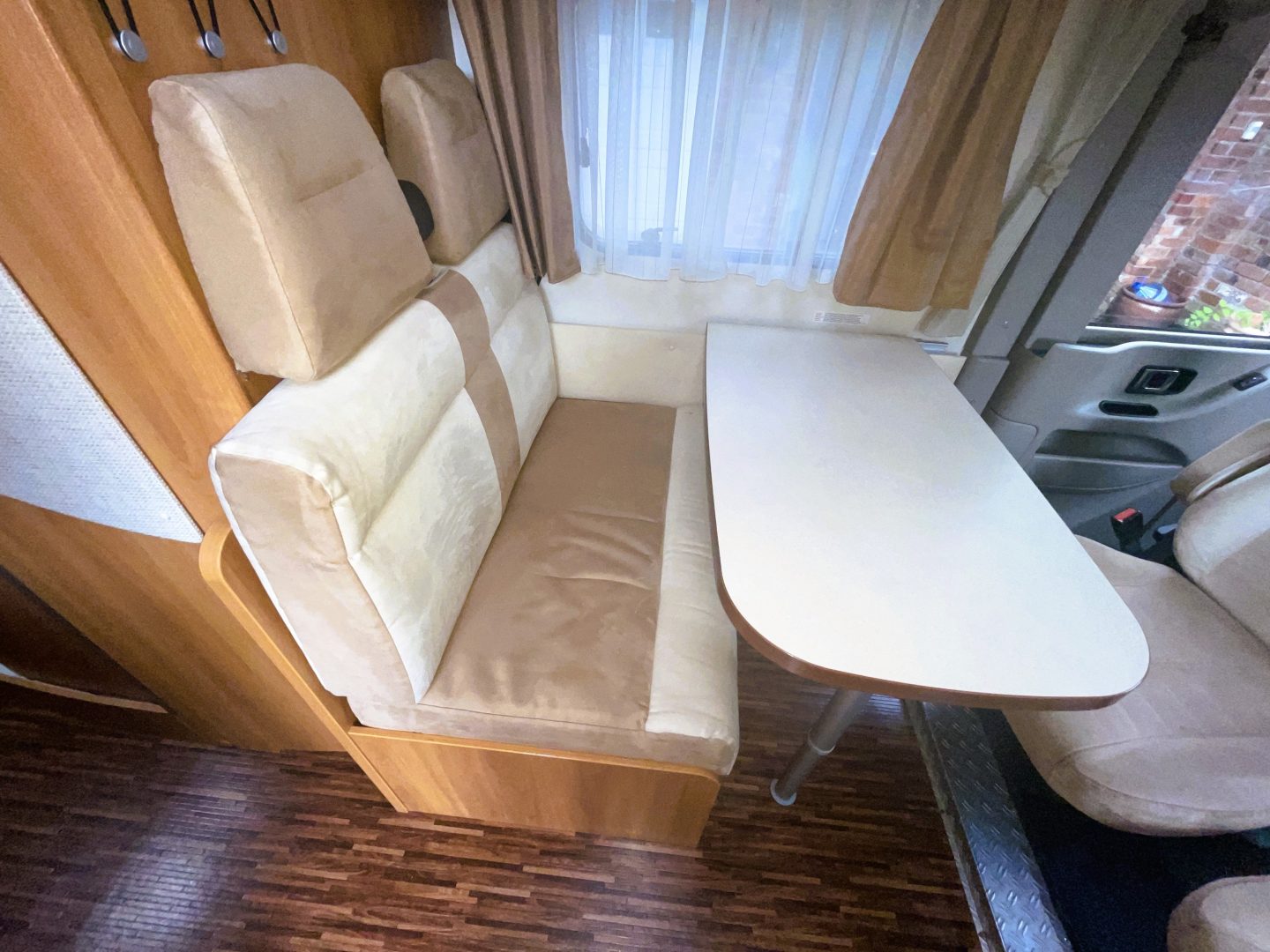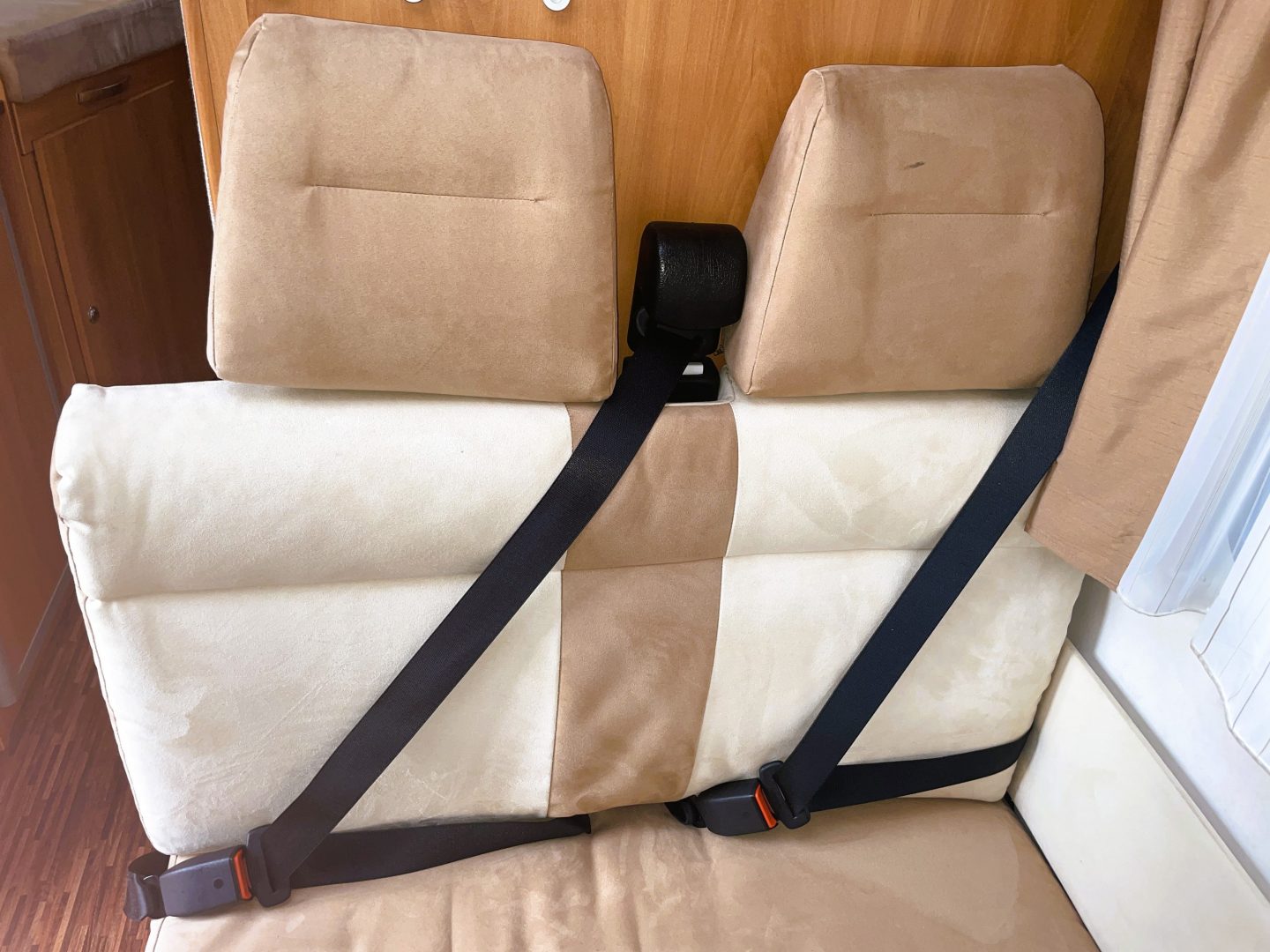 Up front you have the dinette/lounge with forward facing bench/sofa with dining table, a seat facing seat and captains swivel seats. The two forward facing dinette seats are fitted with 3 point seat belts.