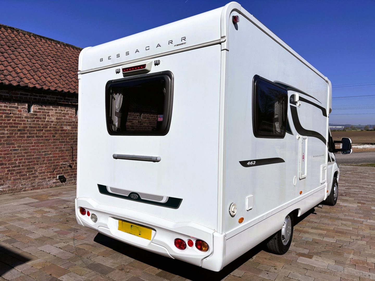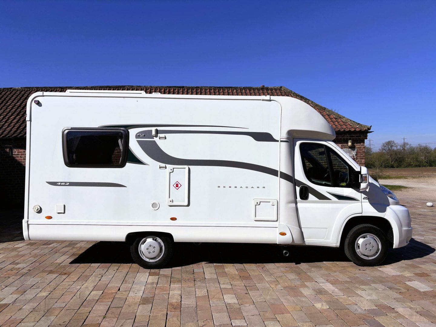 Very smart white bodywork with graphics. Fitted with wind out Fiamma awning, solar panel, electric entry step, side locker, 240v hookup point and gas locker.