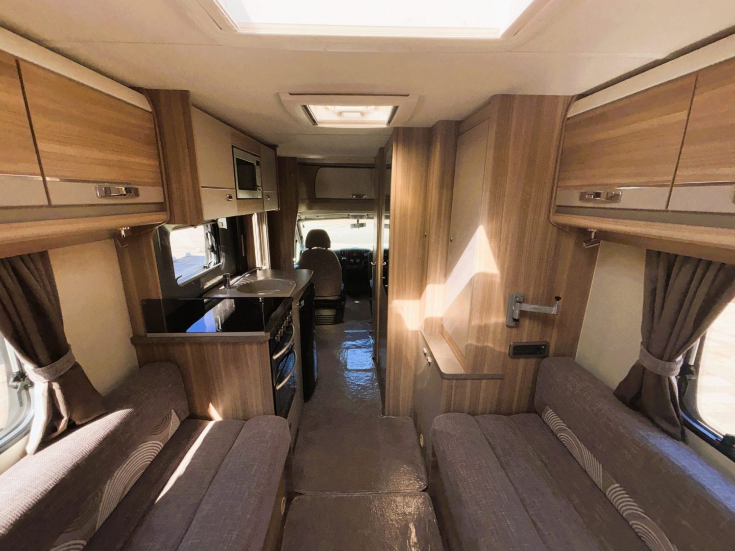 At the rear is the lounge with two long and comfy sofas with a neat drawer unit in between which also houses a convenient extending table top. There is a full dining table stored in its own cupboard in. With windows on three sides and a large skylights this is an airy light living space. The sofas can be used as two single beds (L 190cm x W 68cm) or a transverse double bed ( L 205cm x W140cm)