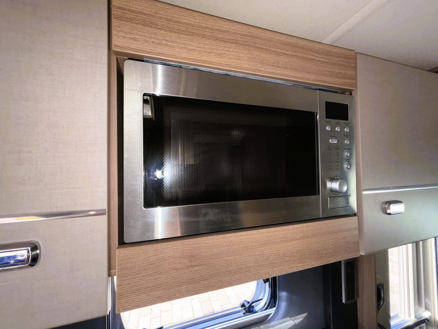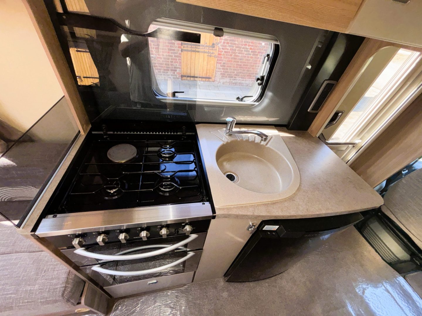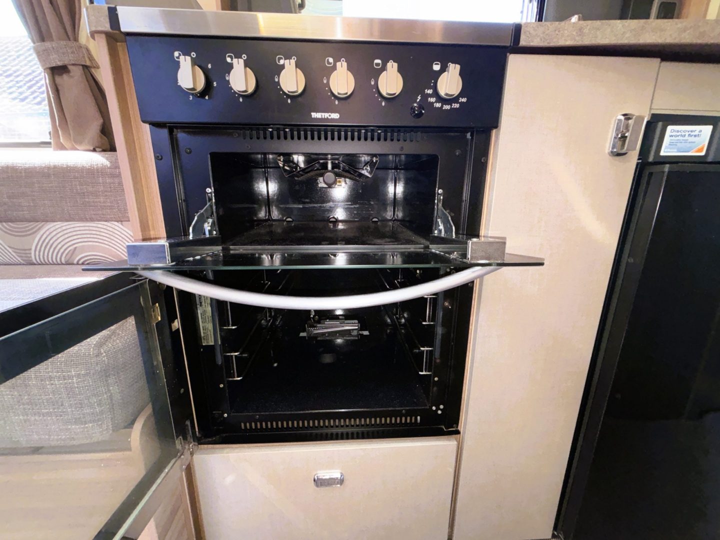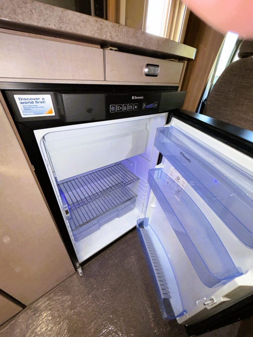 As you walk in you have the kitchen with a Thetford cooker including a 3 burner gas hob with one electric ring, gas oven and grill. Next to the hob is a rather stylish sink with mixer tap and drainer, extra, foldaway worktop, a 3 way ( gas/240v/12v ) fridge with freezer compartment , microwave and there are multiple cupboards and drawers for storage.