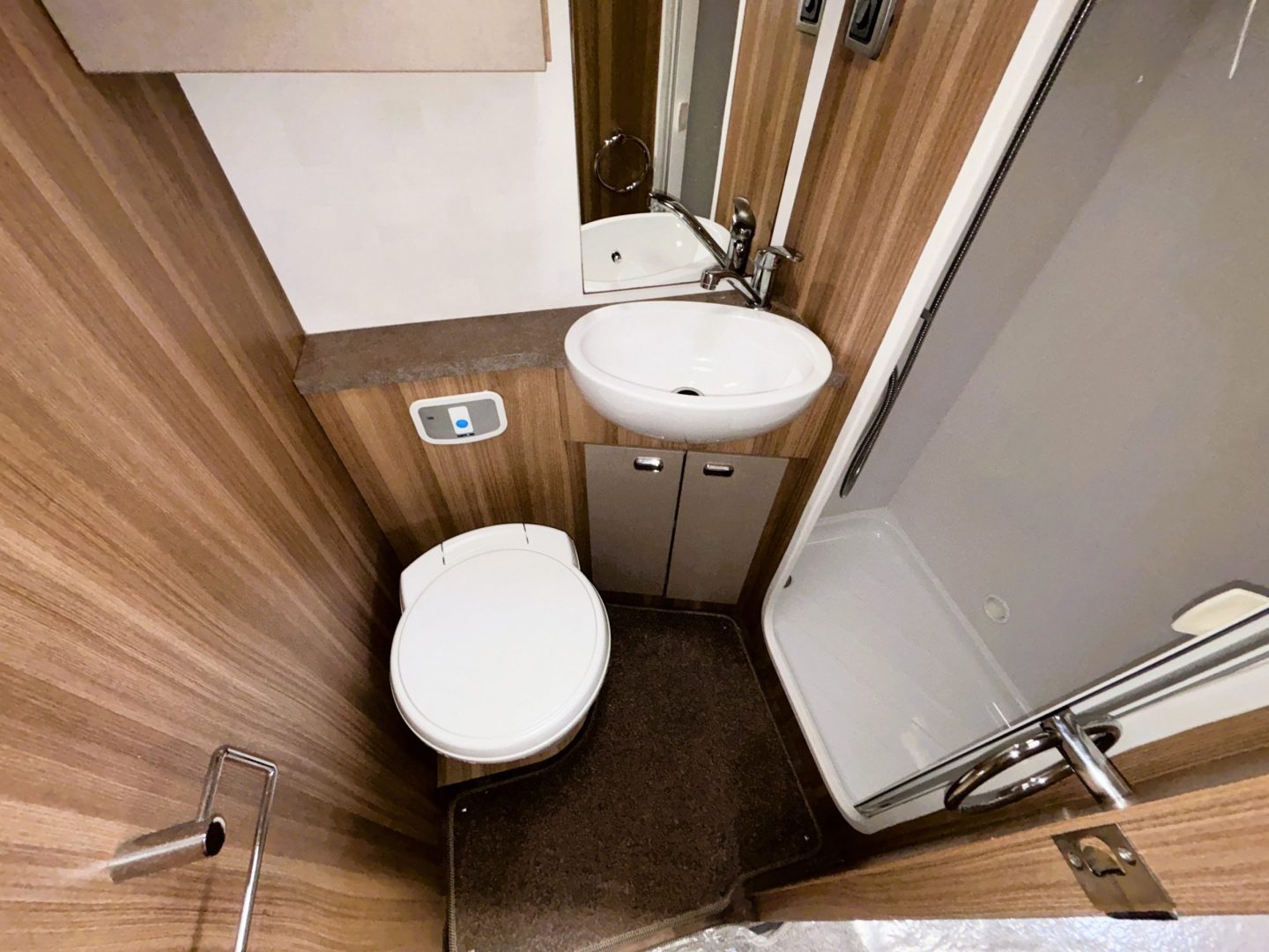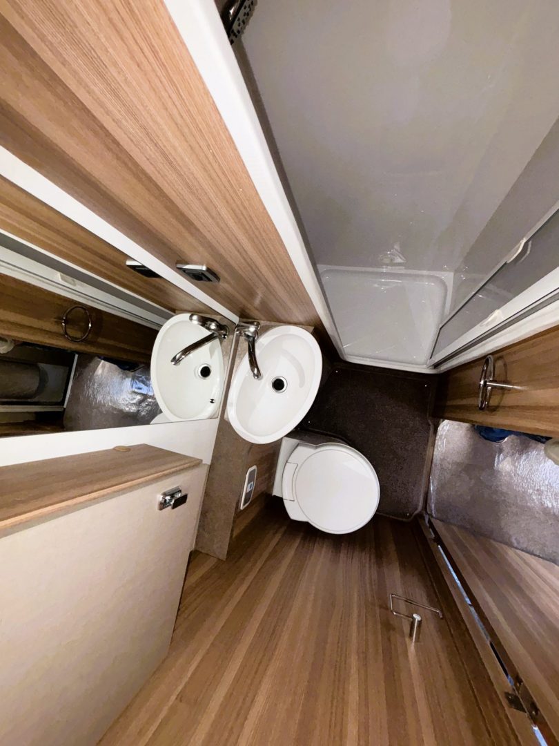 Opposite the kitchen is a fantastic shower room complete with a full size shower cubicle, Thetford toilet, a wash basin several cupboards.