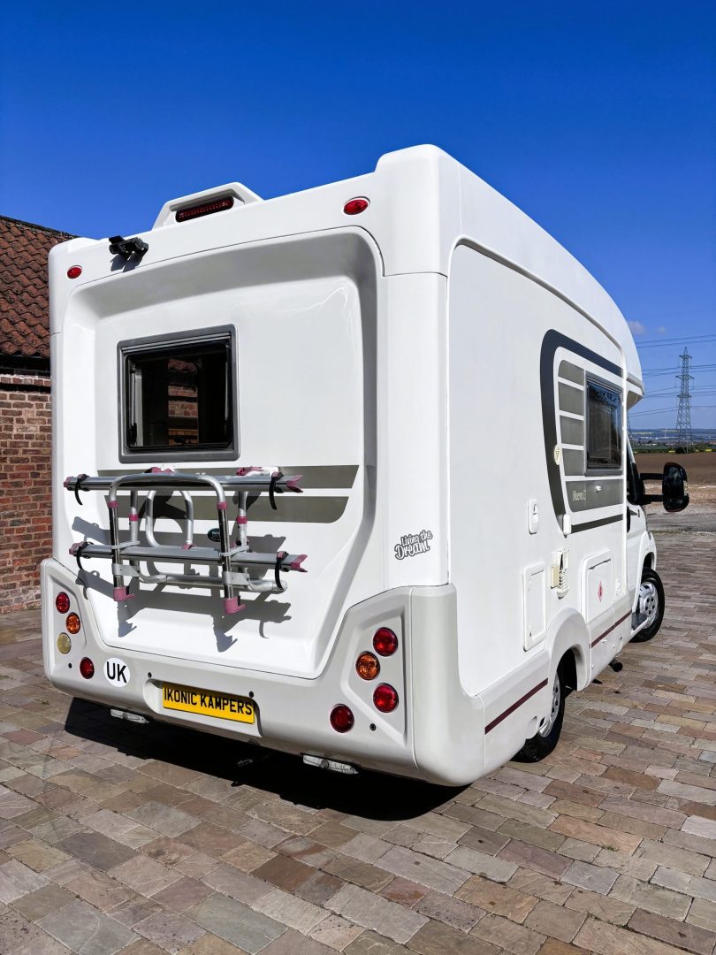 Good white bodywork with graphics. Fitted with Fiamma Awning, solar panel, reversing camera, Milenco extra door lock on Hab door, TV aerial, Fiamma cycle rack, side lockers, gas locker and 240v hookup point.