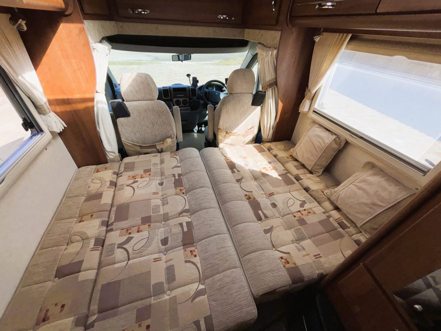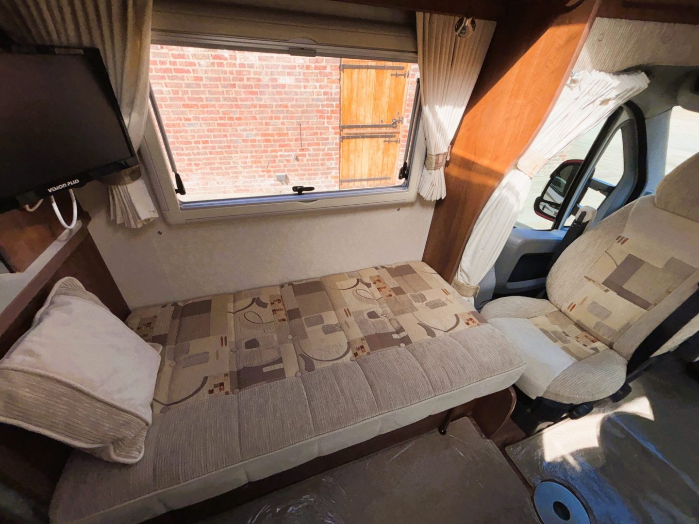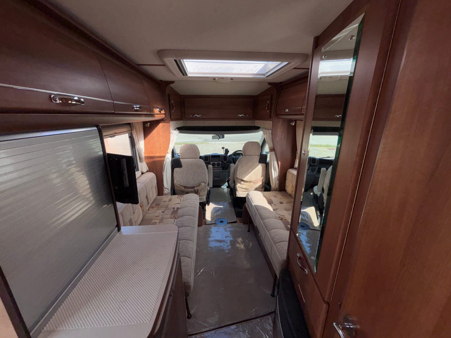 To the front you have the lounge. This is a very comfy and flexible space. To the left is a sofa with storage below, then on the right is another sofa with more storage underneath . There is a dining table stored in the wardrobe, as well as a small occasional table and a TV mounted next to the sofa. With windows on both sides and a large skylight this is an airy light living space. The lounge can convert to two single beds by utilising the front swivel seats ( each is 71cm x 190cm ) or into a transverse double bed ( 140cm x 210cm ).