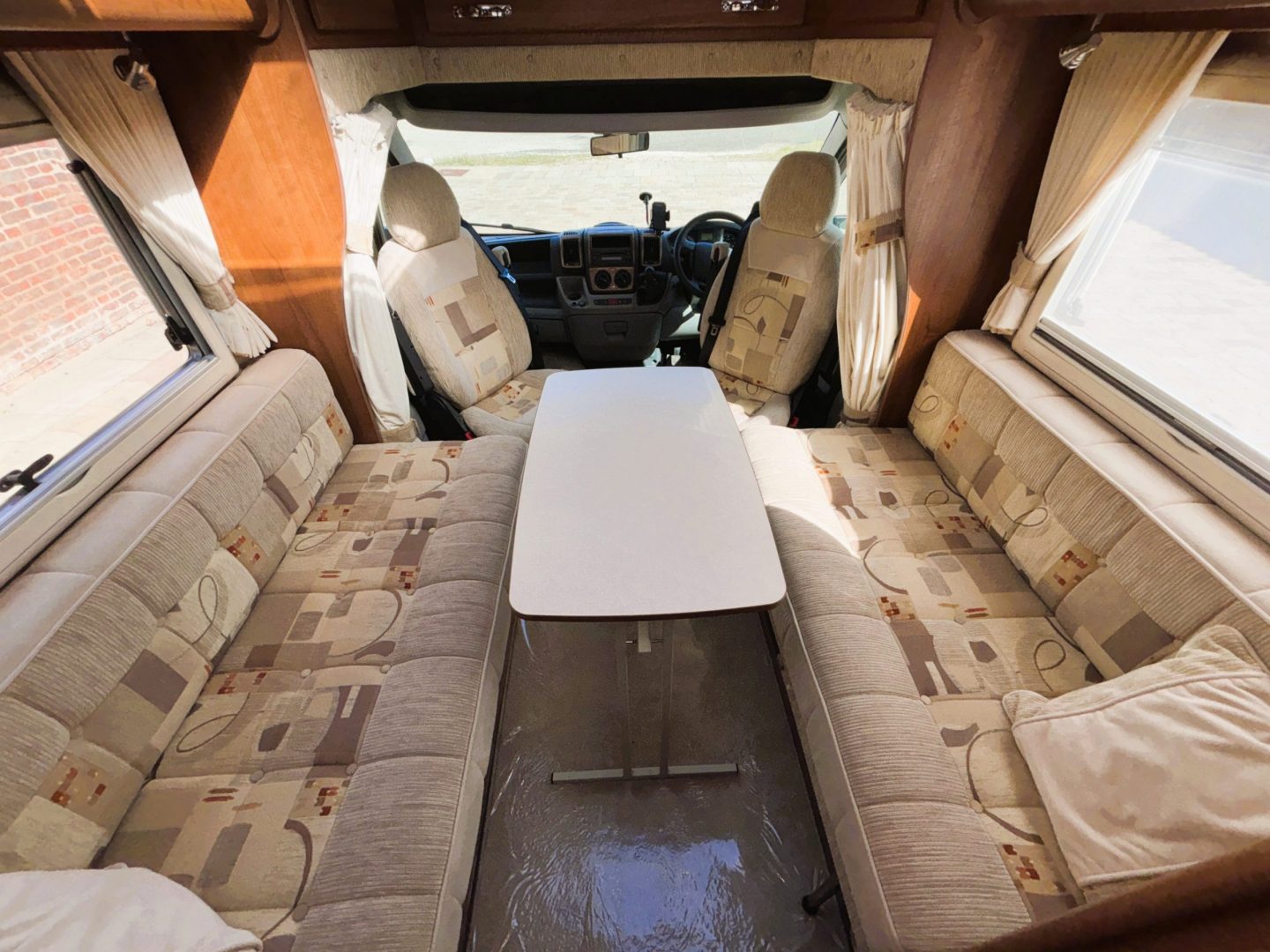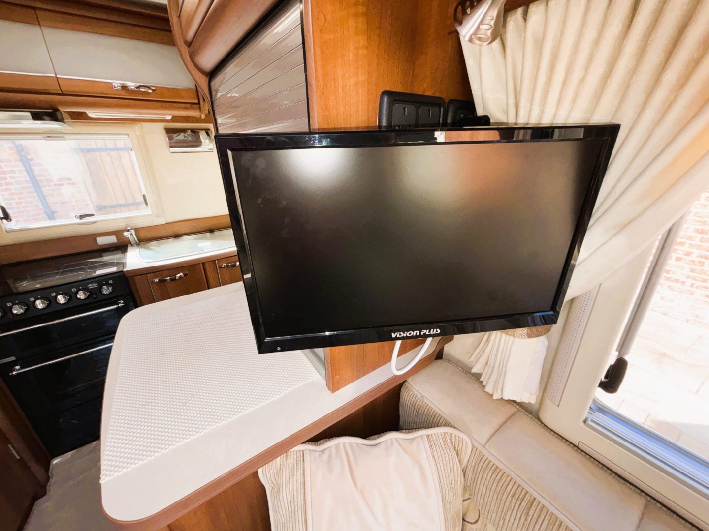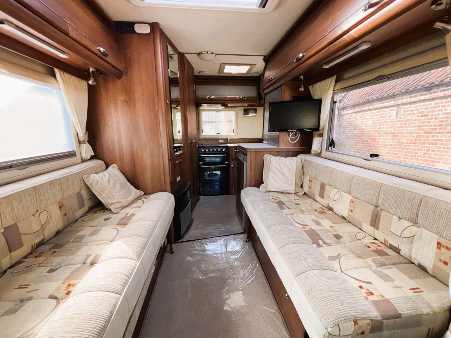 To the front you have the lounge. This is a very comfy and flexible space. To the left is a sofa with storage below, then on the right is another sofa with more storage underneath . There is a dining table stored in the wardrobe, as well as a small occasional table and a TV mounted next to the sofa. With windows on both sides and a large skylight this is an airy light living space. The lounge can convert to two single beds by utilising the front swivel seats ( each is 71cm x 190cm ) or into a transverse double bed ( 140cm x 210cm ).