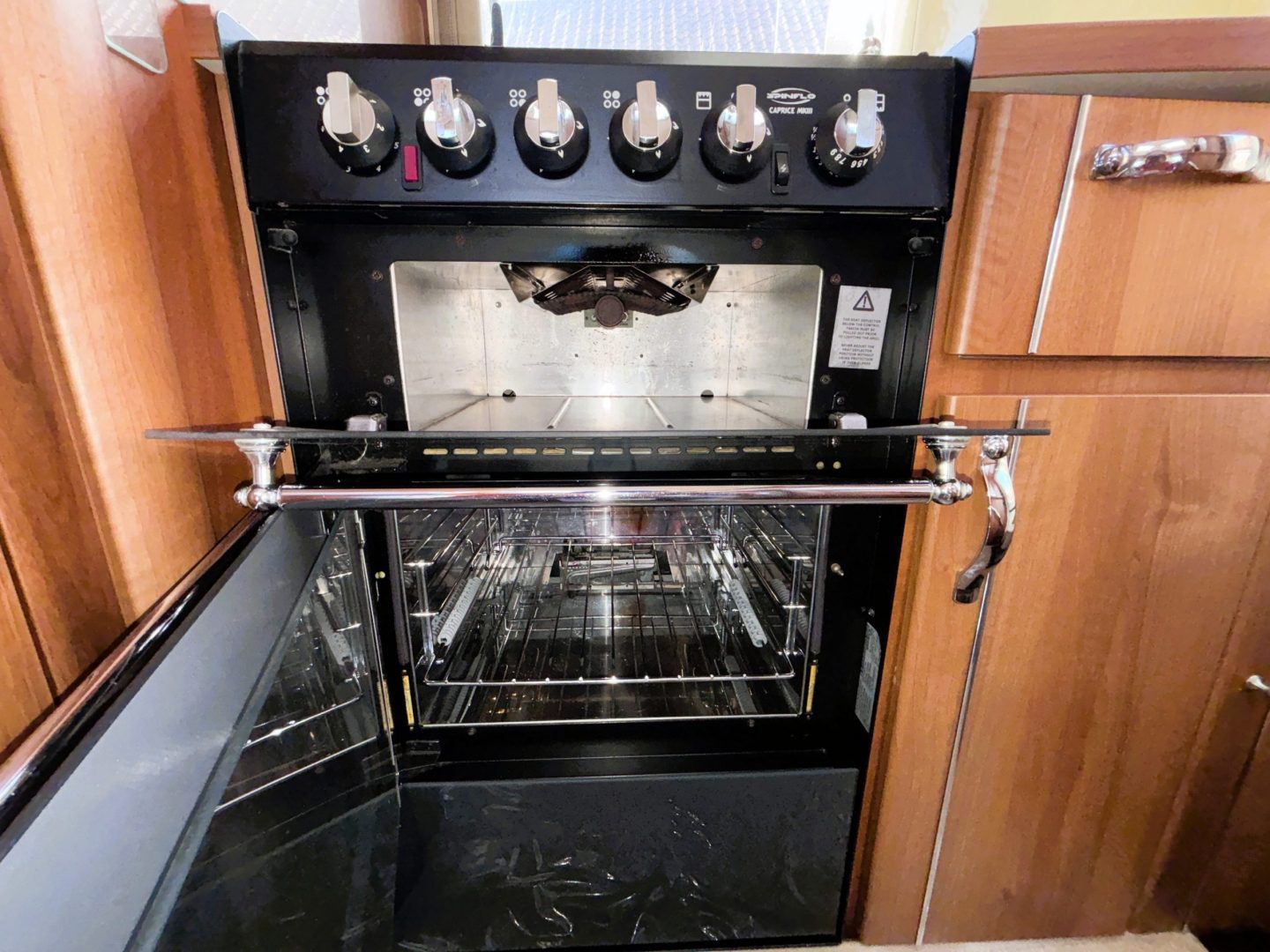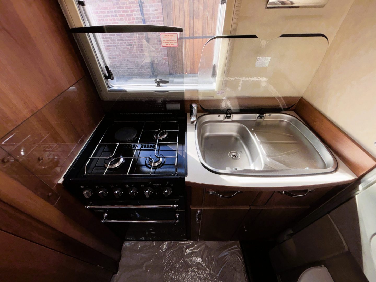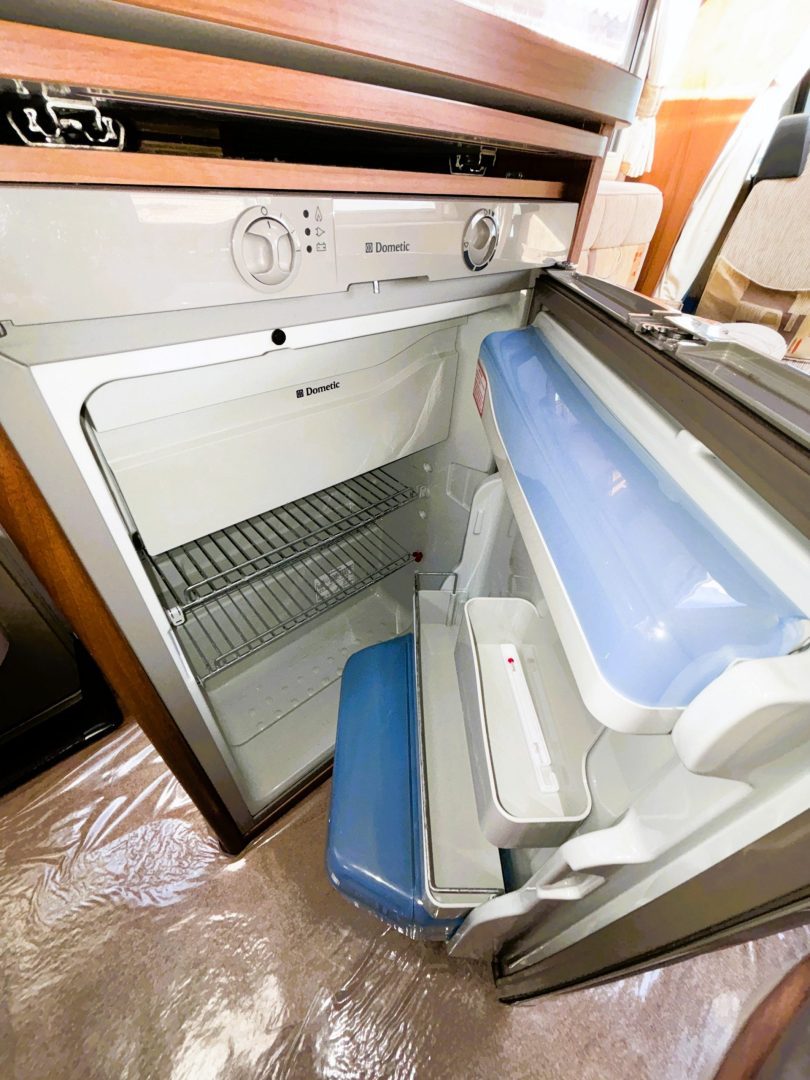 Walking in through the habitation door you are in the kitchen. On the back wall is the full cooker including gas oven, seperate grill, 3 burner hob and one electric hot plate, a sink with mixer tap and the kitchen window. With the 3 way fridge ( gas/240v/12v ) to your left as you walk in and a worktop with a neat cupboard above.