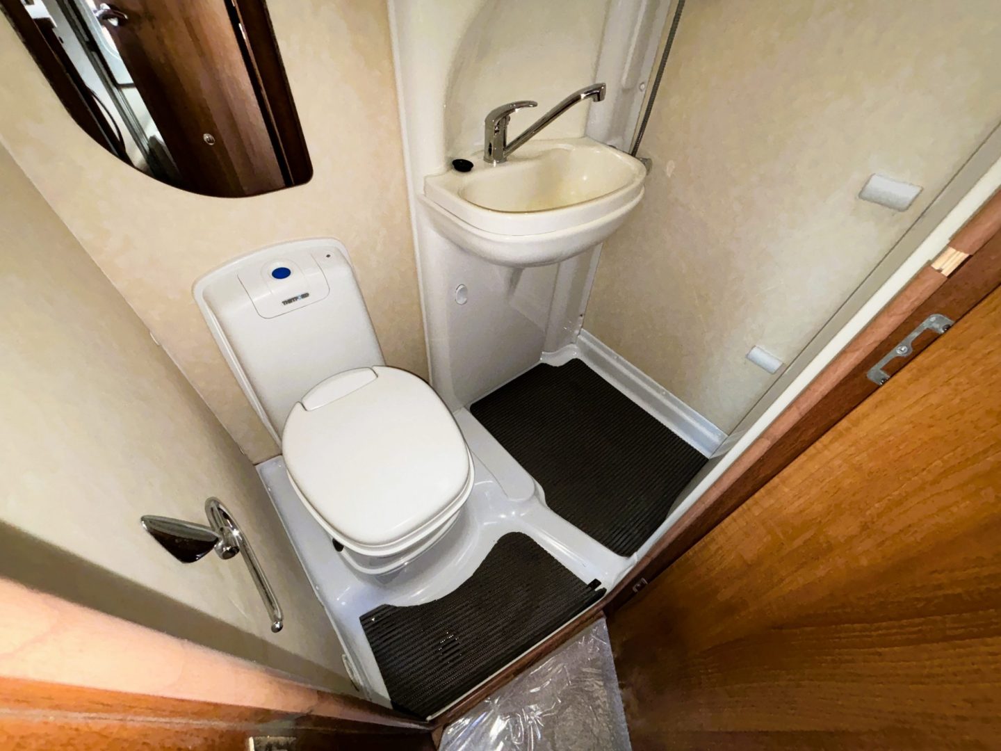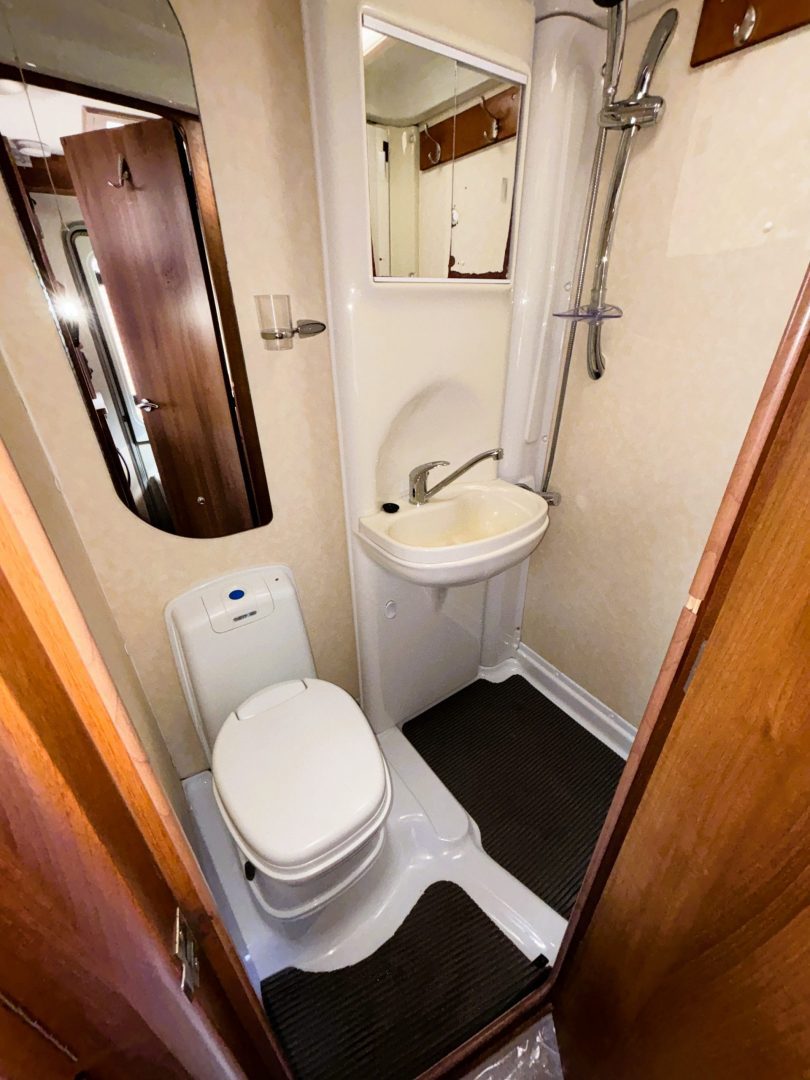 Next to the kitchen is a good sized shower room complete with Thetford toilet, a wash basin and full, swing wall, shower cubicle. Next to the shower room is a wardrobe with a drawer below.