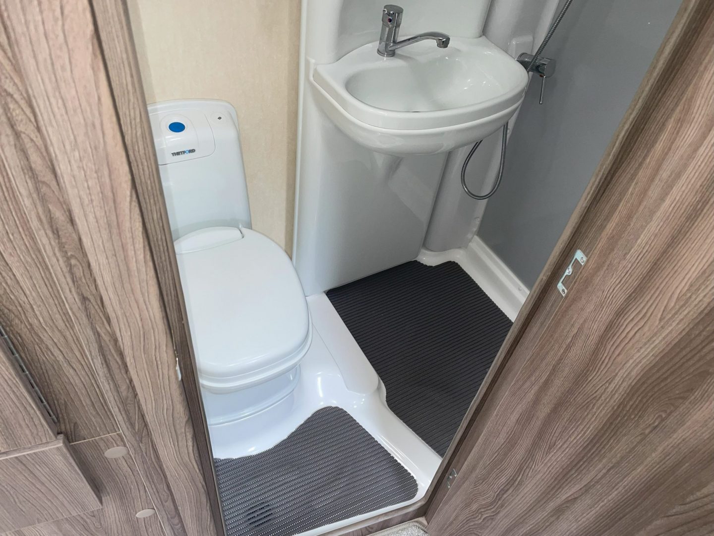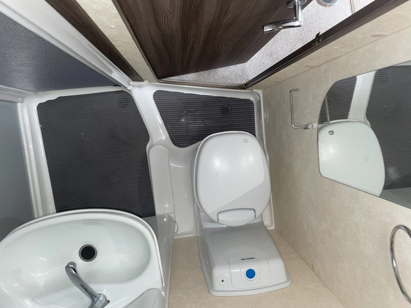 In the rear corner we have a shower room with Thetford toilet, wash basin with Auto-Sleepers ingenious swing wall creating a separate shower cubicle. There is a bathroom cabinet and wall mounted mirror.