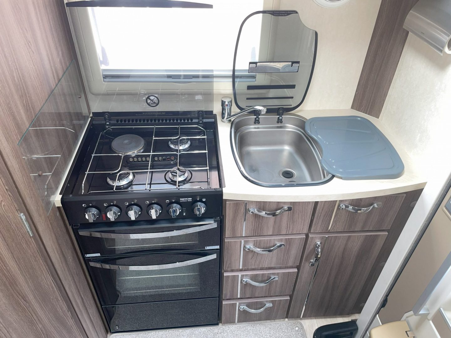 Starting at the rear you enter into the kitchen with a stainless steel sink with mixer tap, a full cooker with 3 burner gas hob and one electric, gas oven and separate grill, a 3 way ( gas/240v/12v ) fridge with freezer compartment and plenty of drawers and storage cupboards.